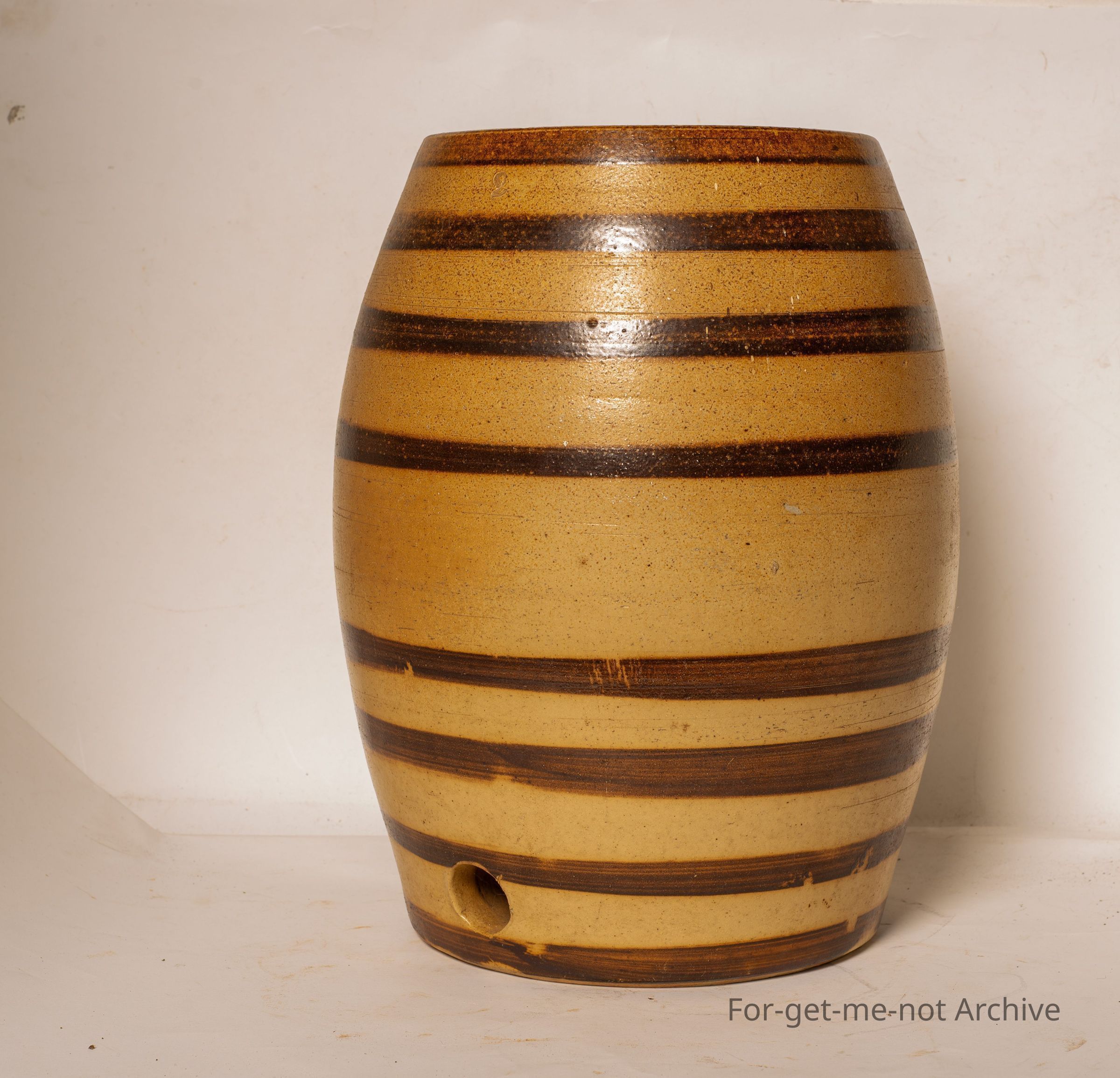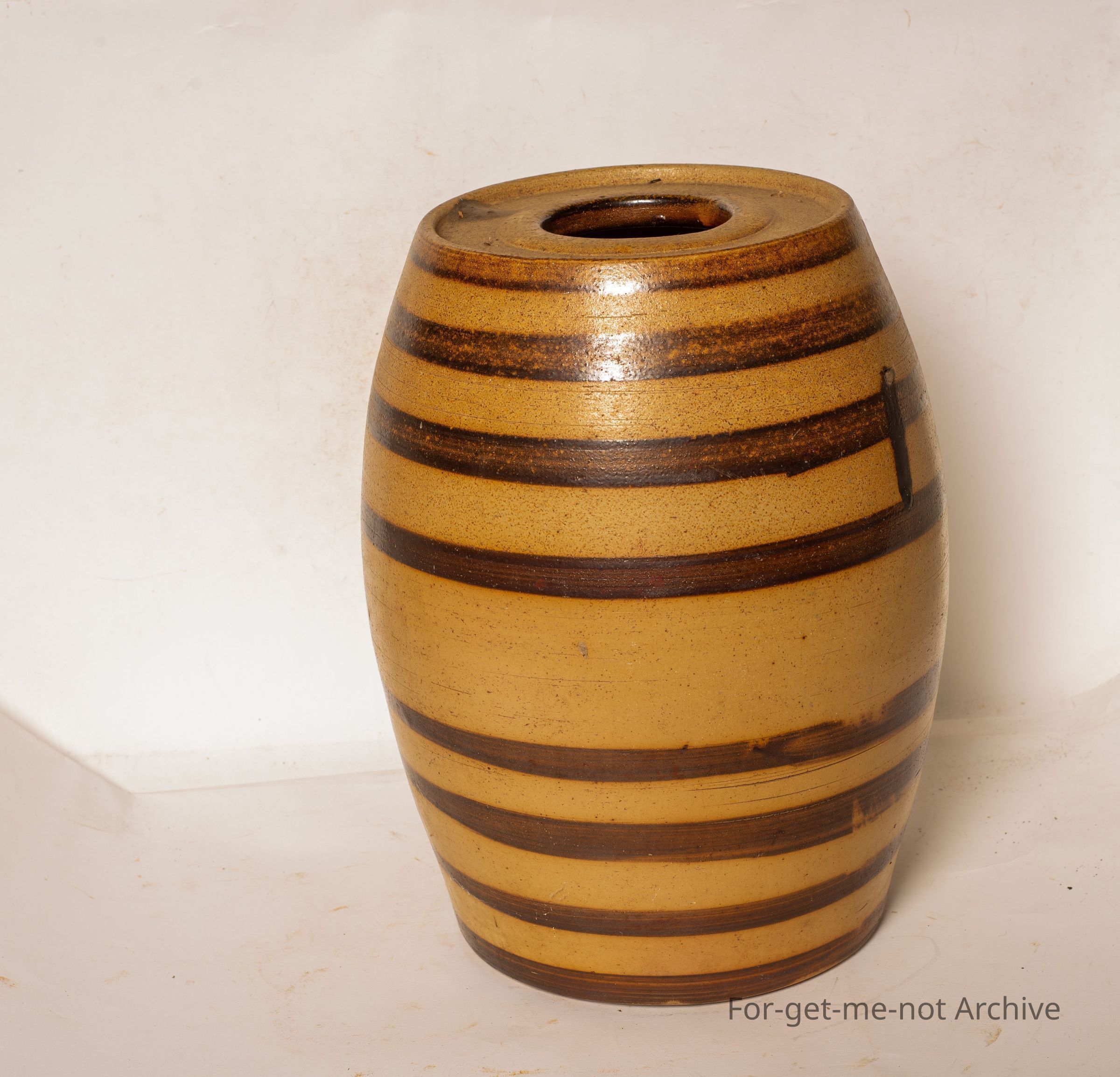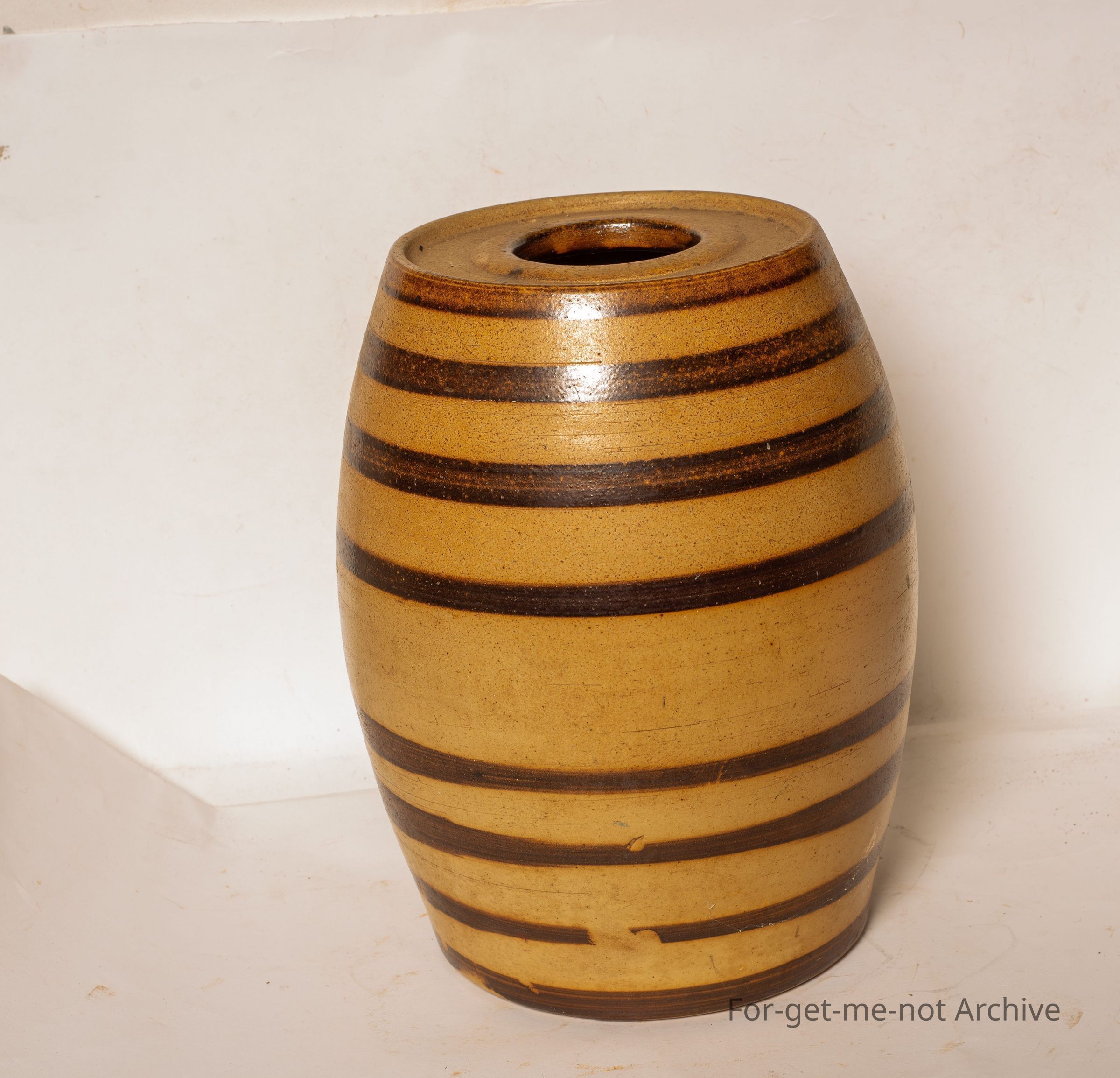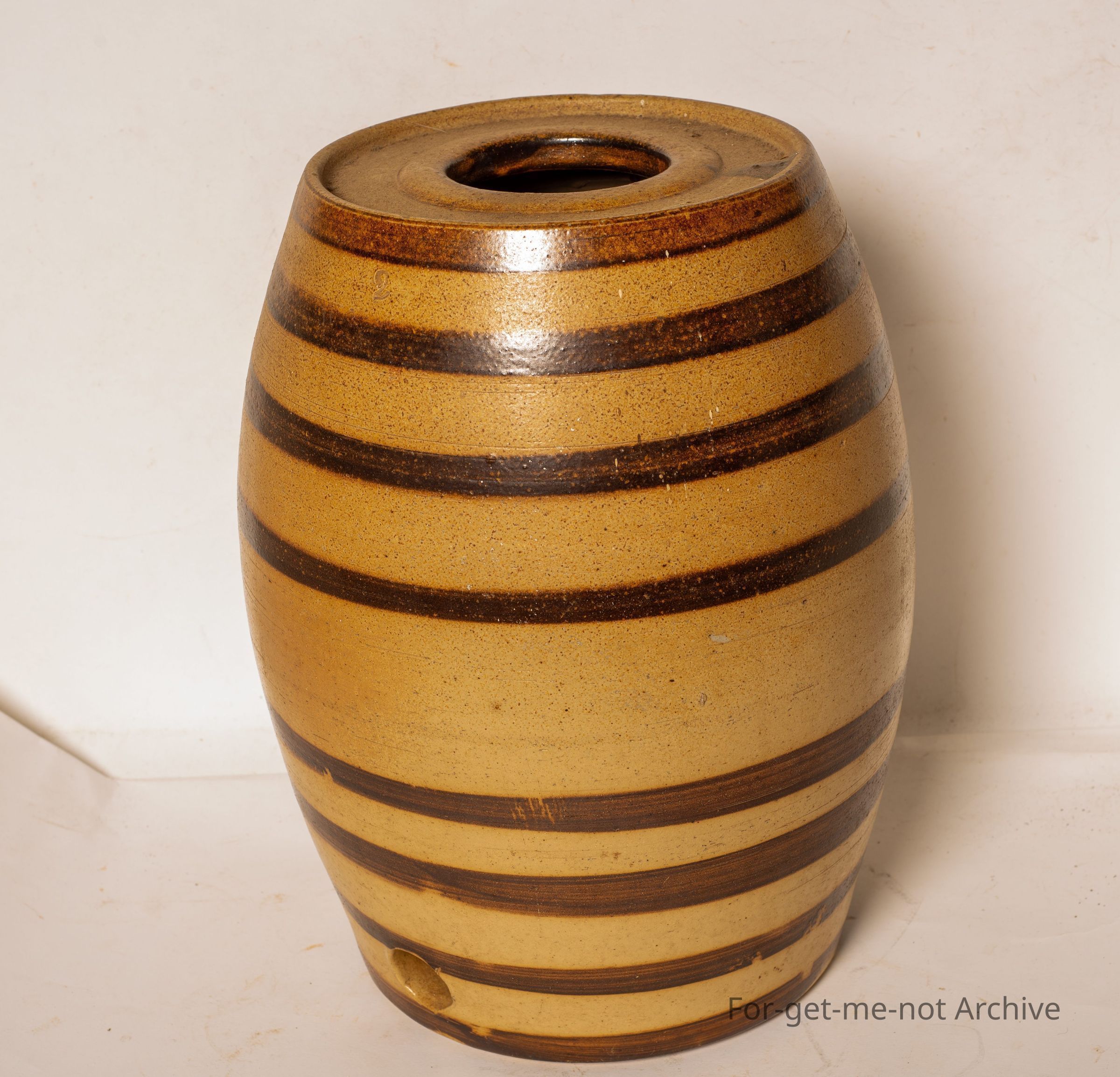 Earthenware wine barrel. This is a ribbed Bendigo Pottery Wine Barrel of 2 gallon size, in the brown and dark brown. No tap, no lid, but completely perfect. But a wonderful example that hasn't been faded.Collection