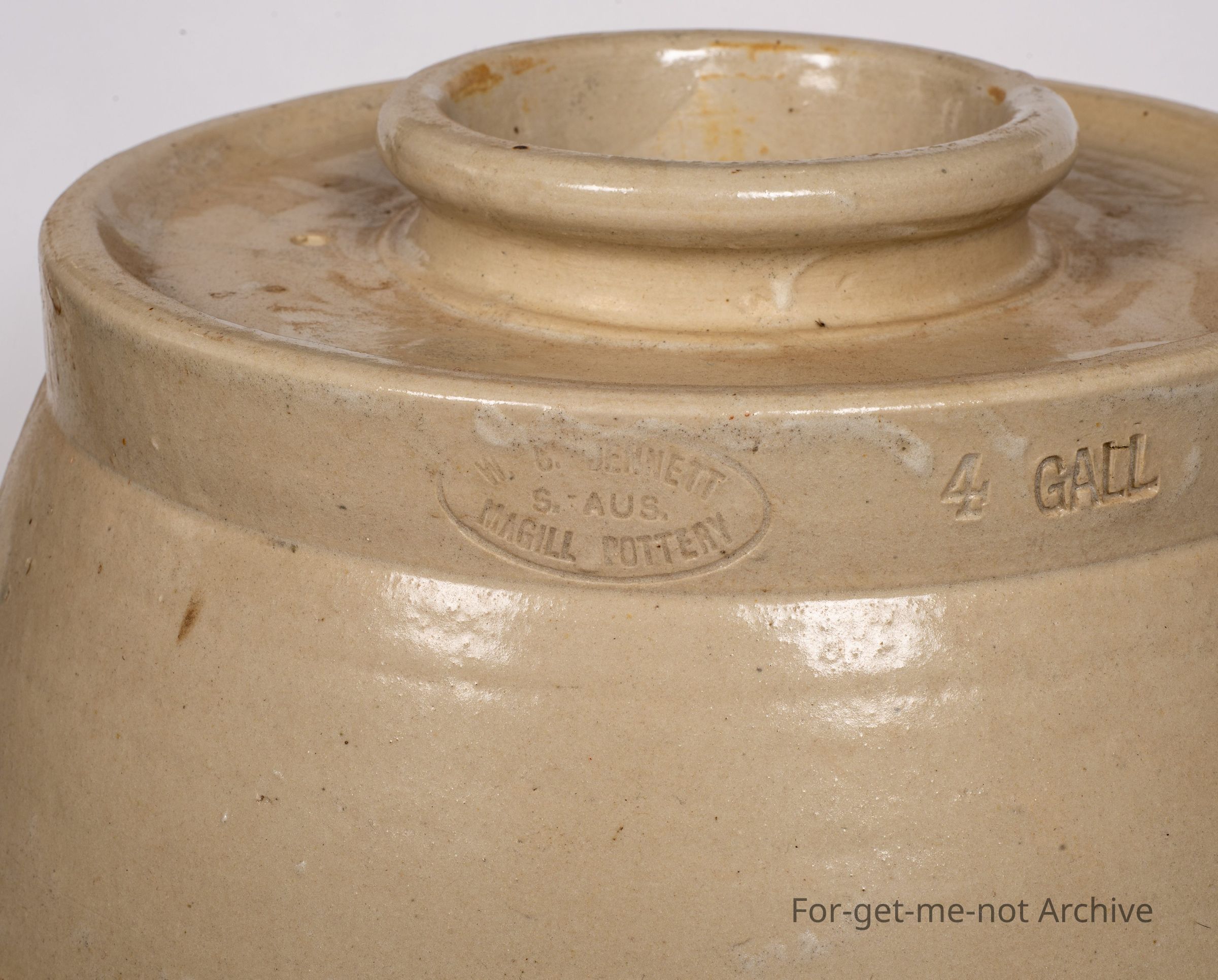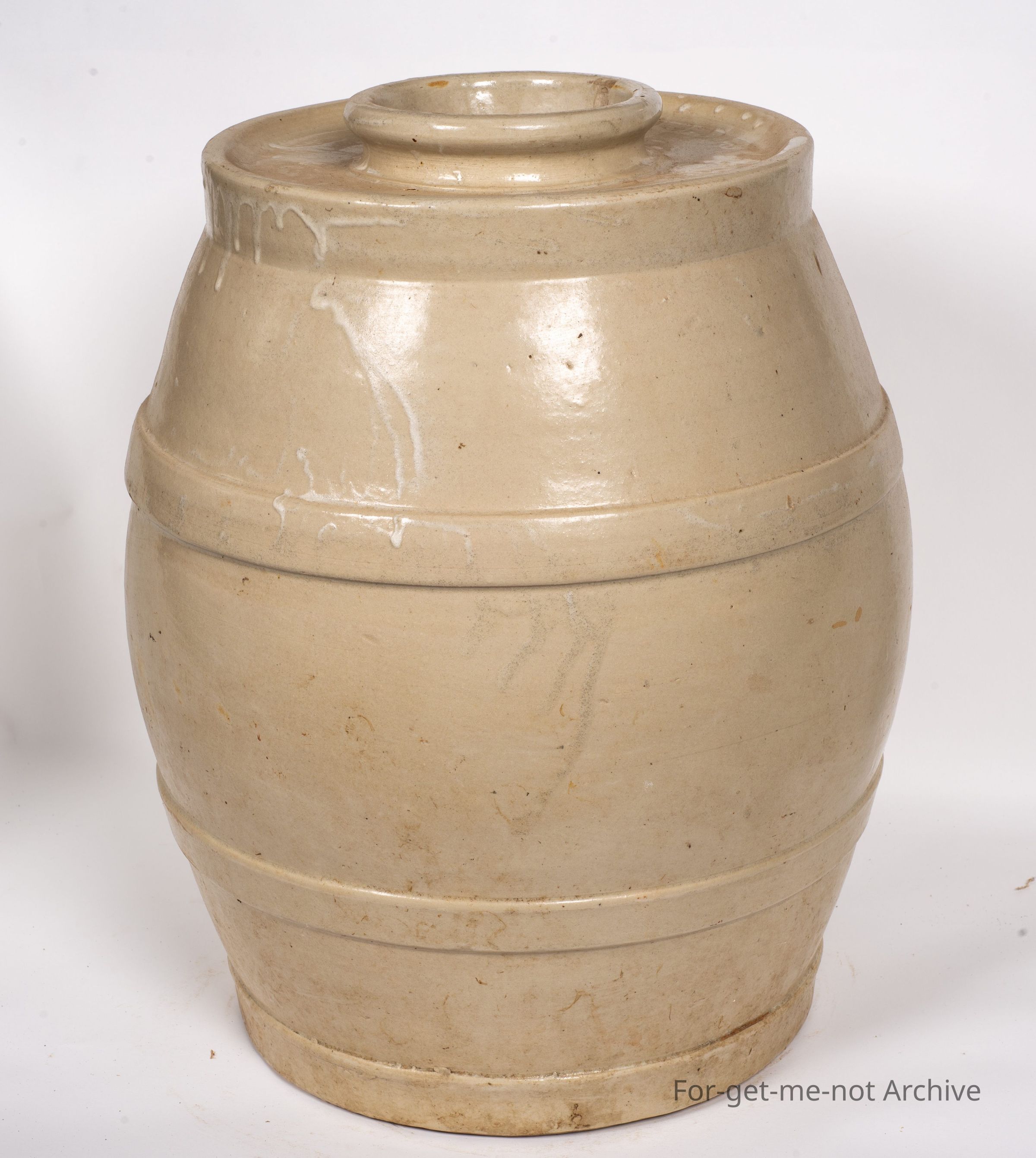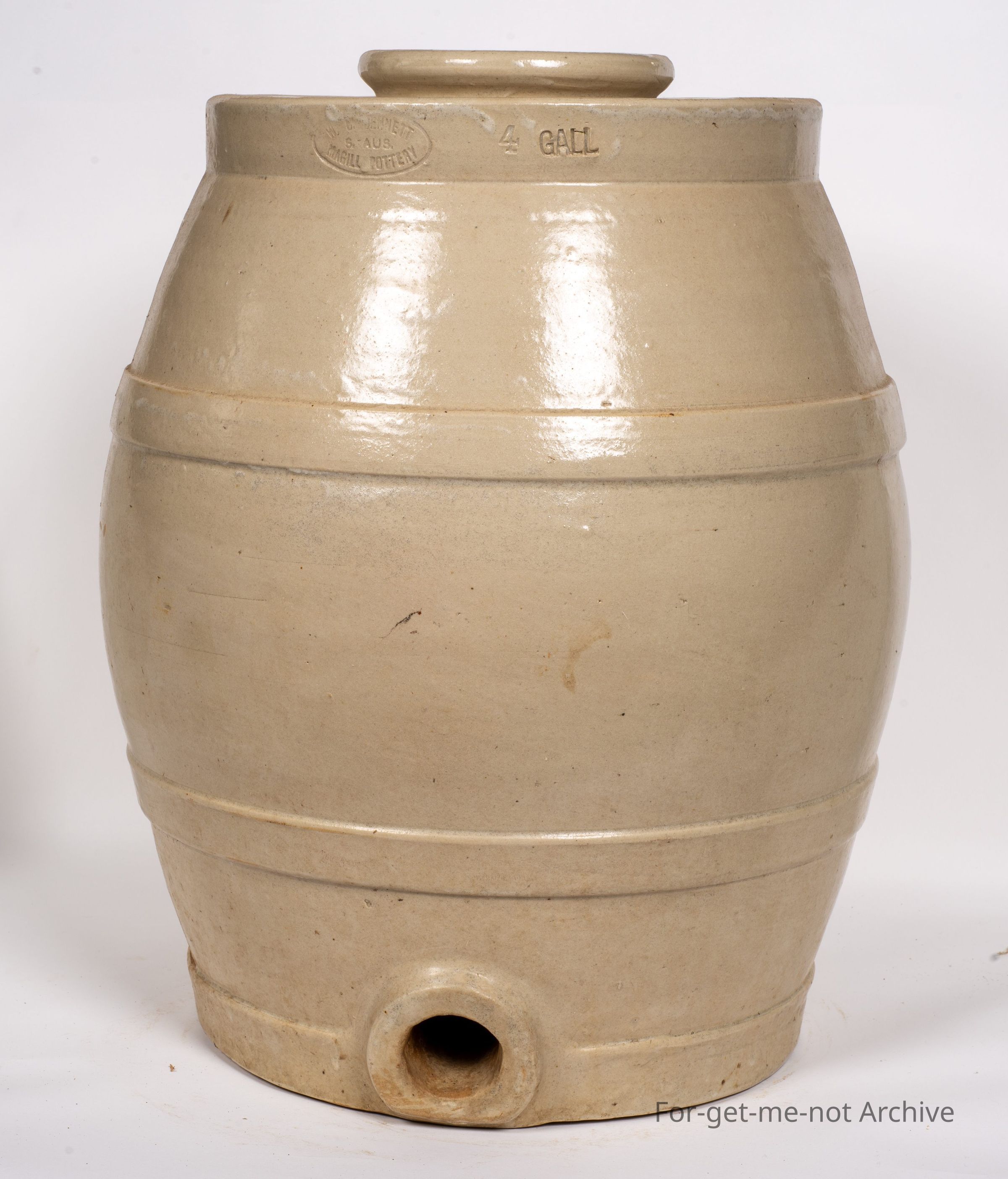 Stoneware, this is a wine barrel from Bennett Magill, South Australia. No tap. The plug lid is gone, but other than that, a very light coloured clay, and a dull, finish on the glaze, but flawless as far as cracks and chips. A nice neat piece.Collection