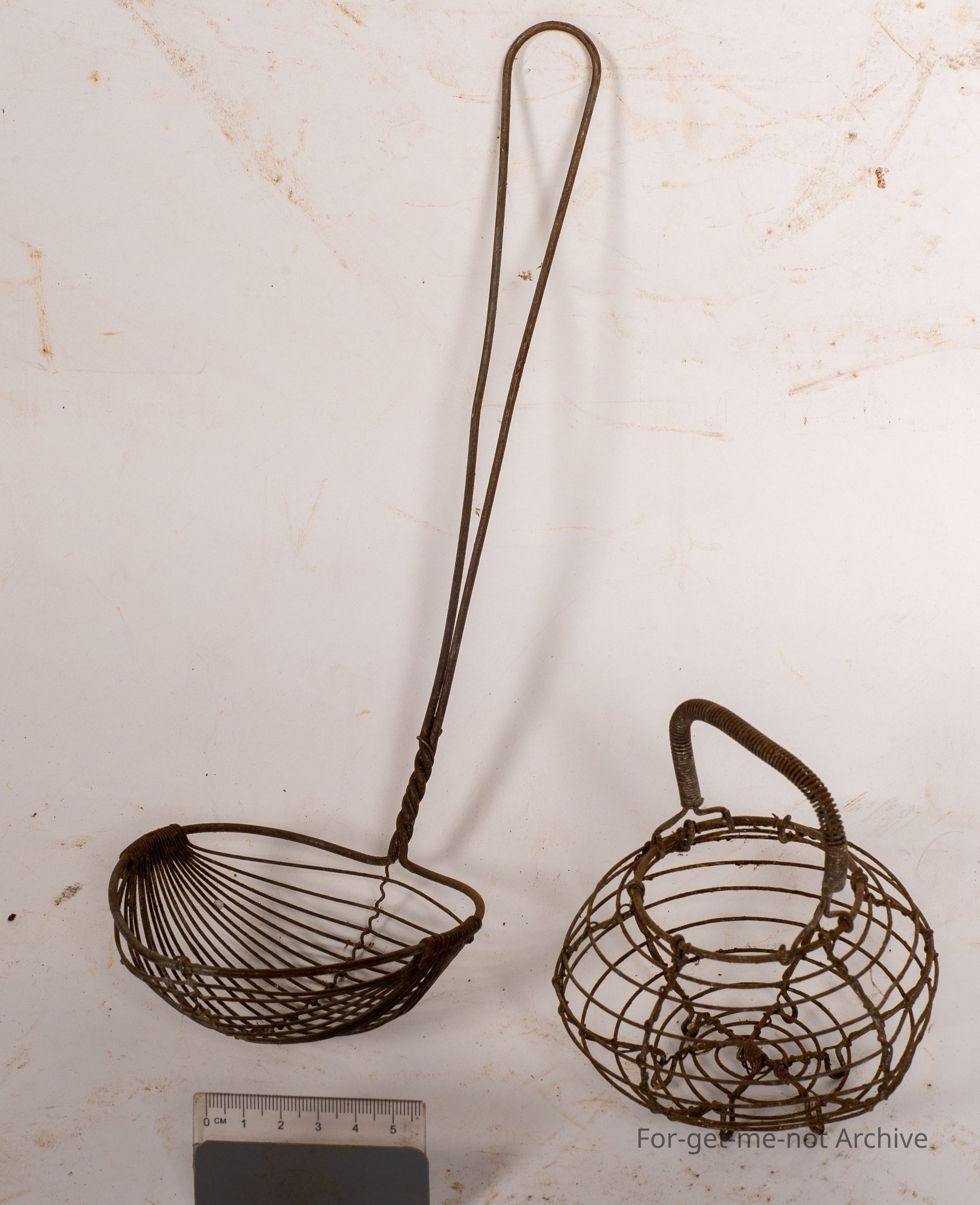 2 items, one very small wire basket with a handle, 6 little legs of loops on the base. The other one is like a piece for picking, vegetables, perhaps out of hot water. Very finely made, but very effective.Collection