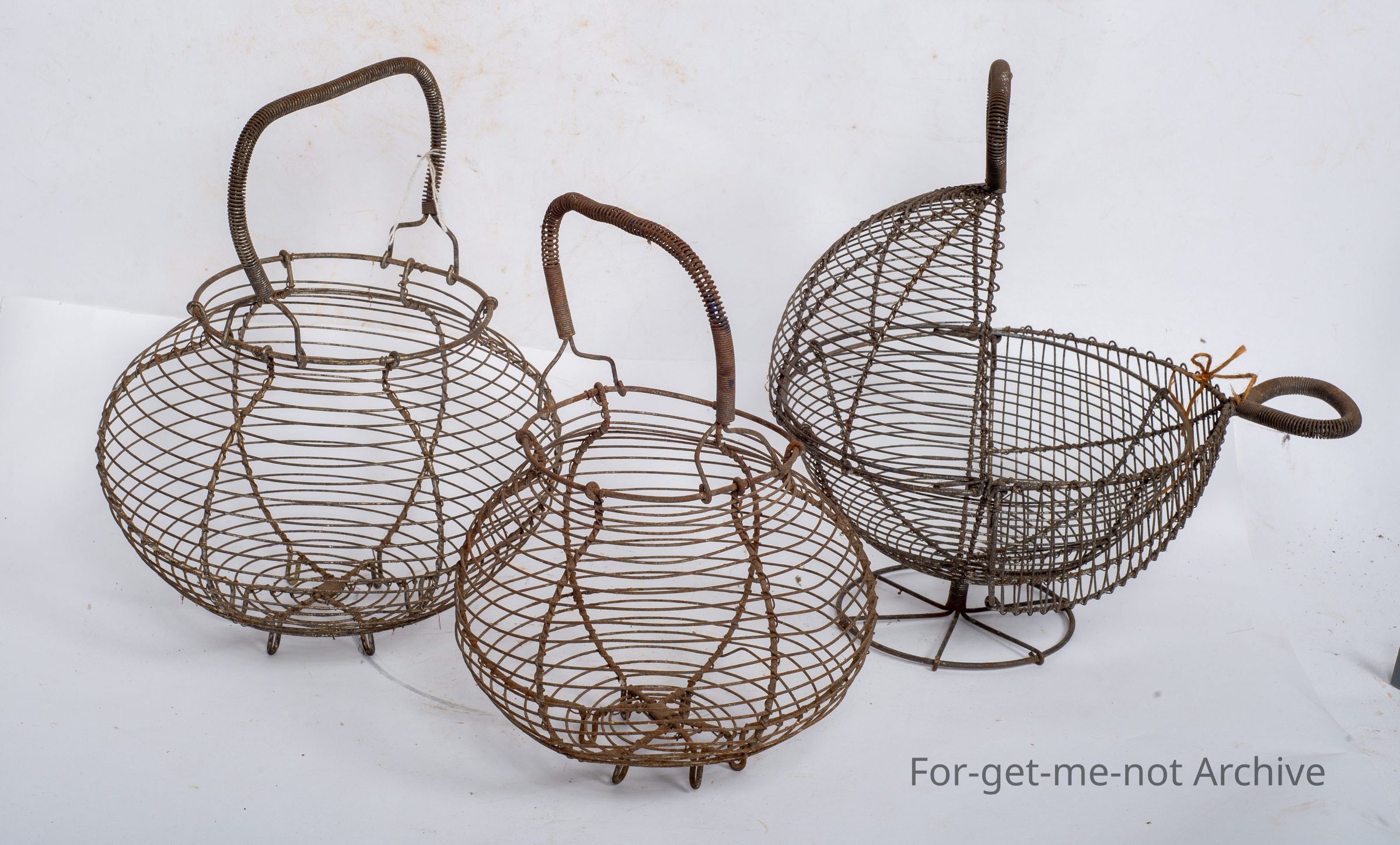 This is a group of wire work, baskets or gathering chook eggs or any other need, one of them is possibly French, very ornate, the other 2 look very Australian,