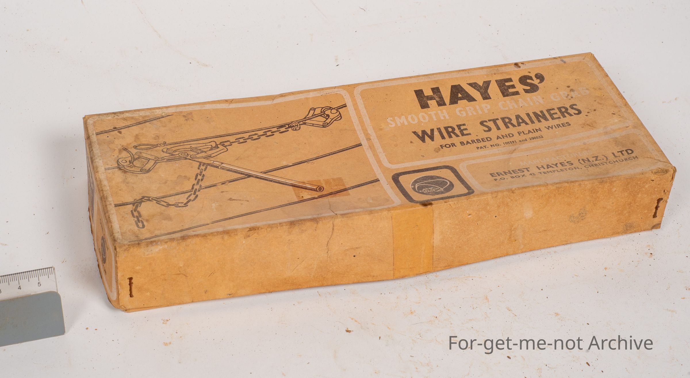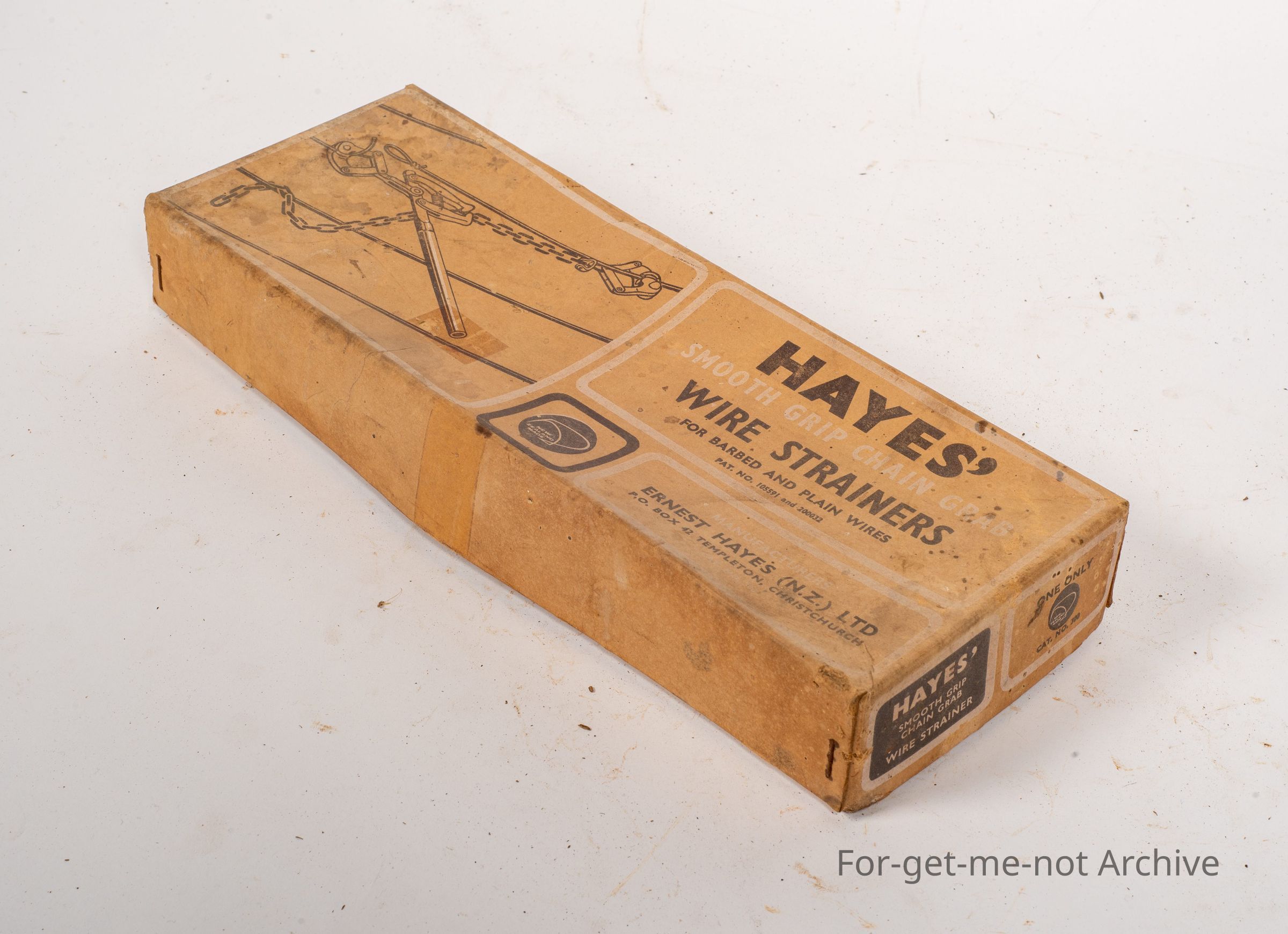 This is the cardboard box which held the wire strainer made by Hayes Smooth Grip Chain Grab Wire Strainer. This is a product from Christchurch New Zealand. The box is in reasonable condition.Collection