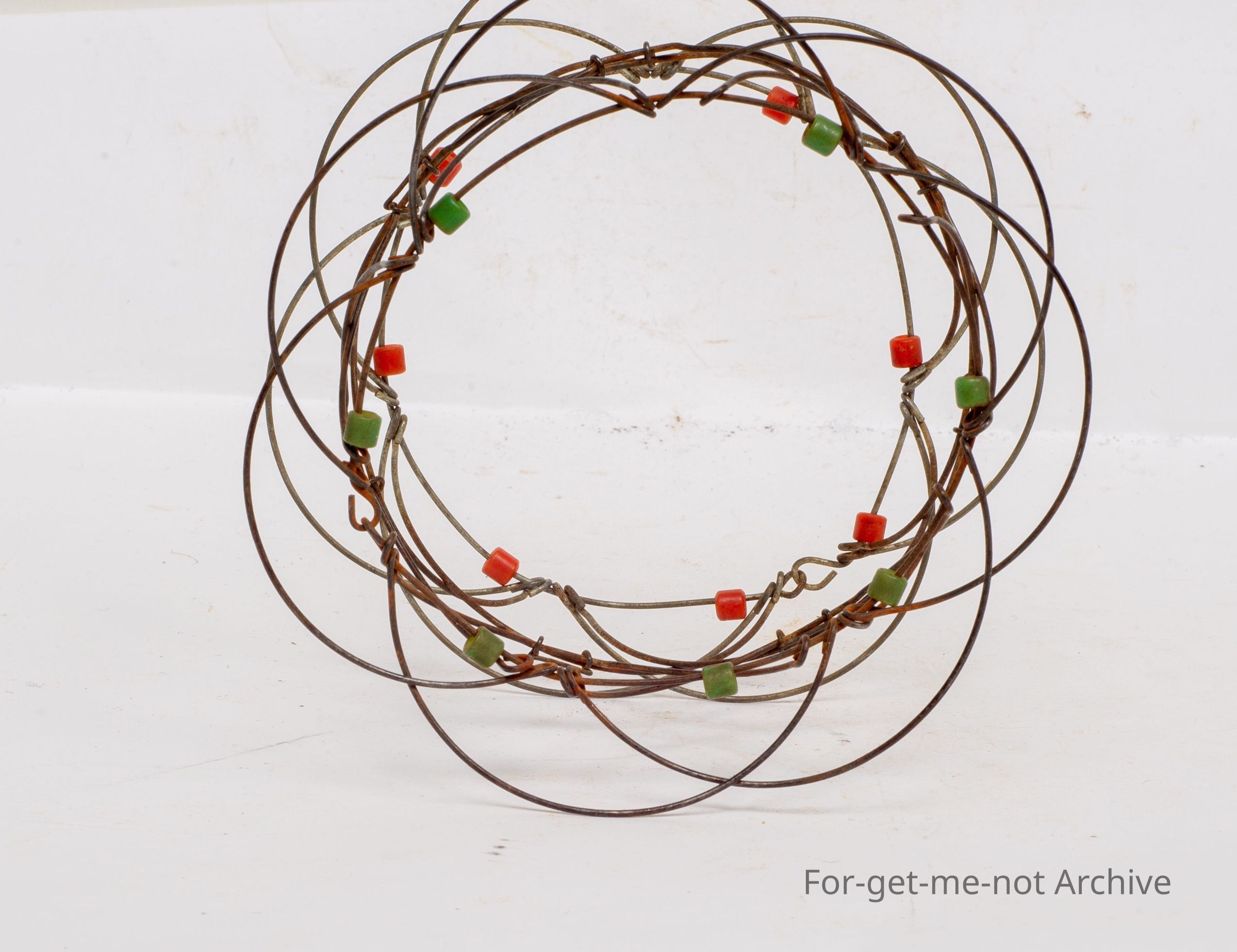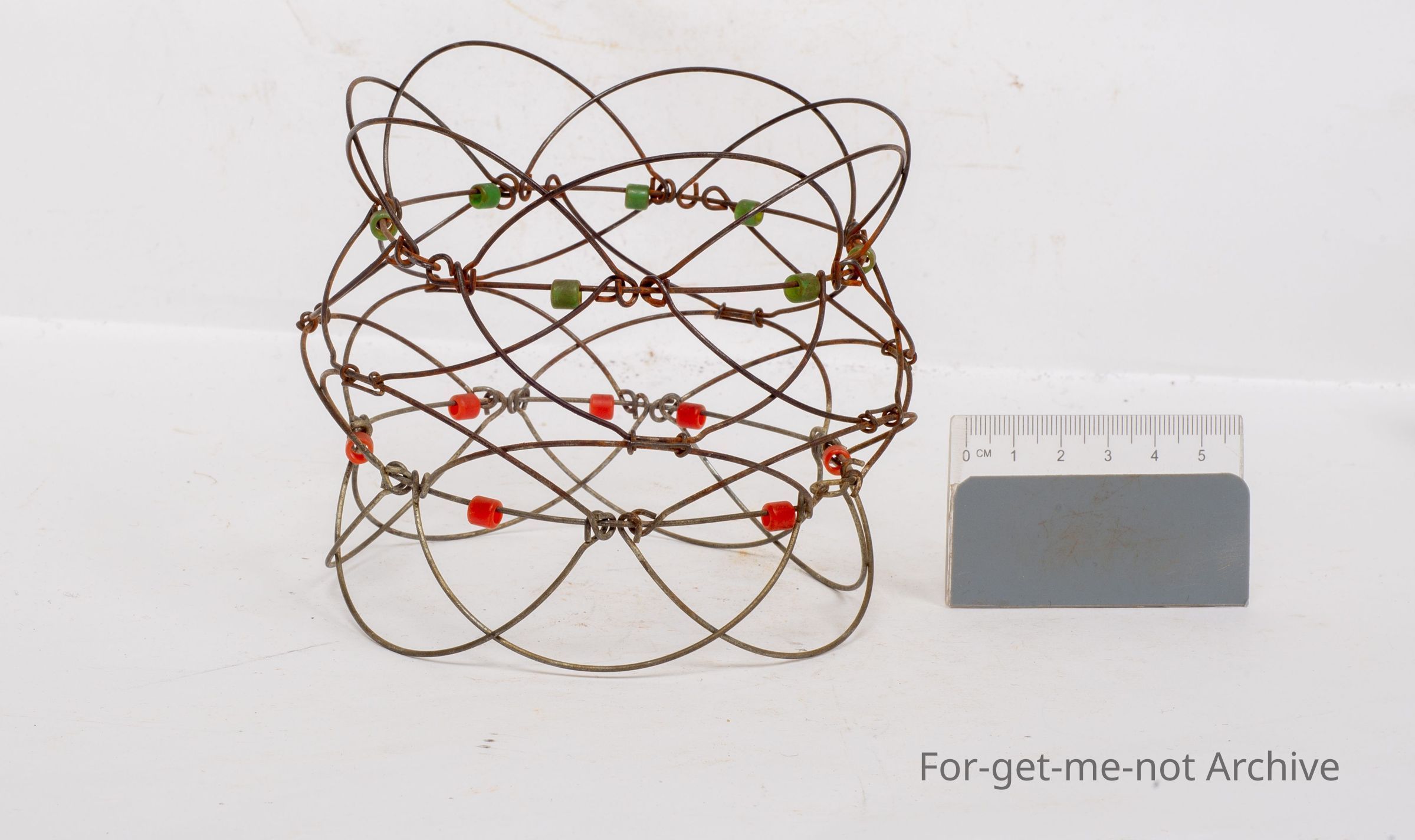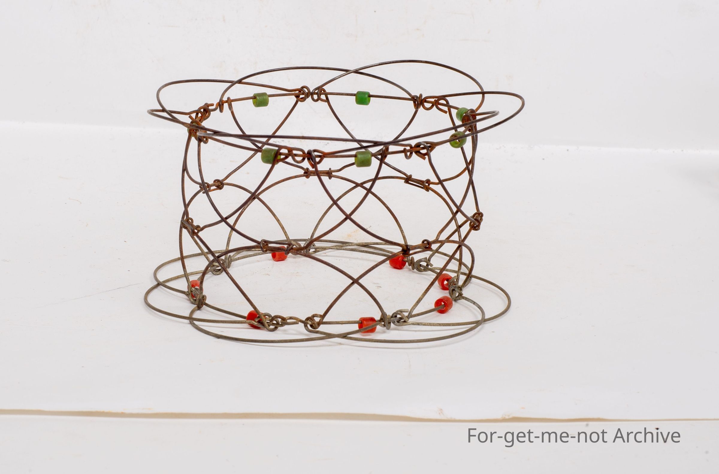 Is a little wire basket with, ringlets worked into the construction of plastic. Just a delightful little thing.