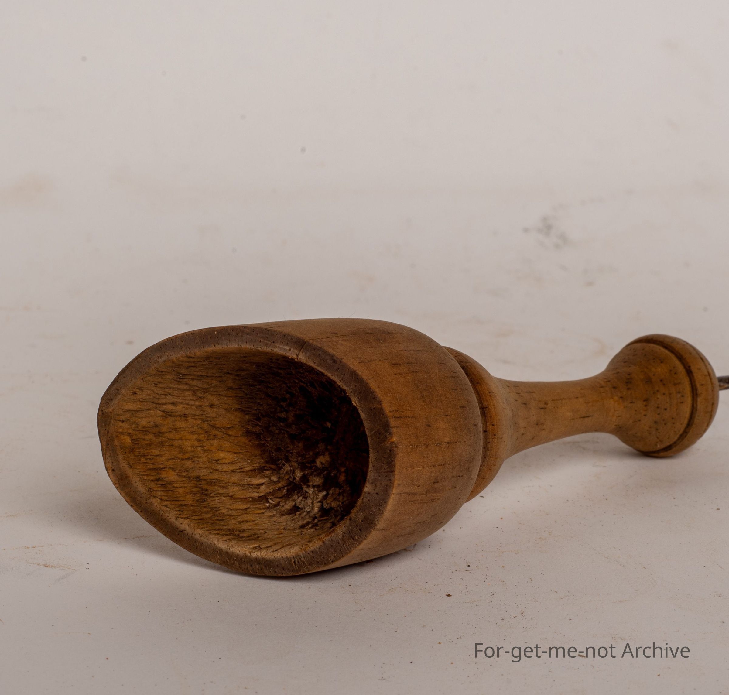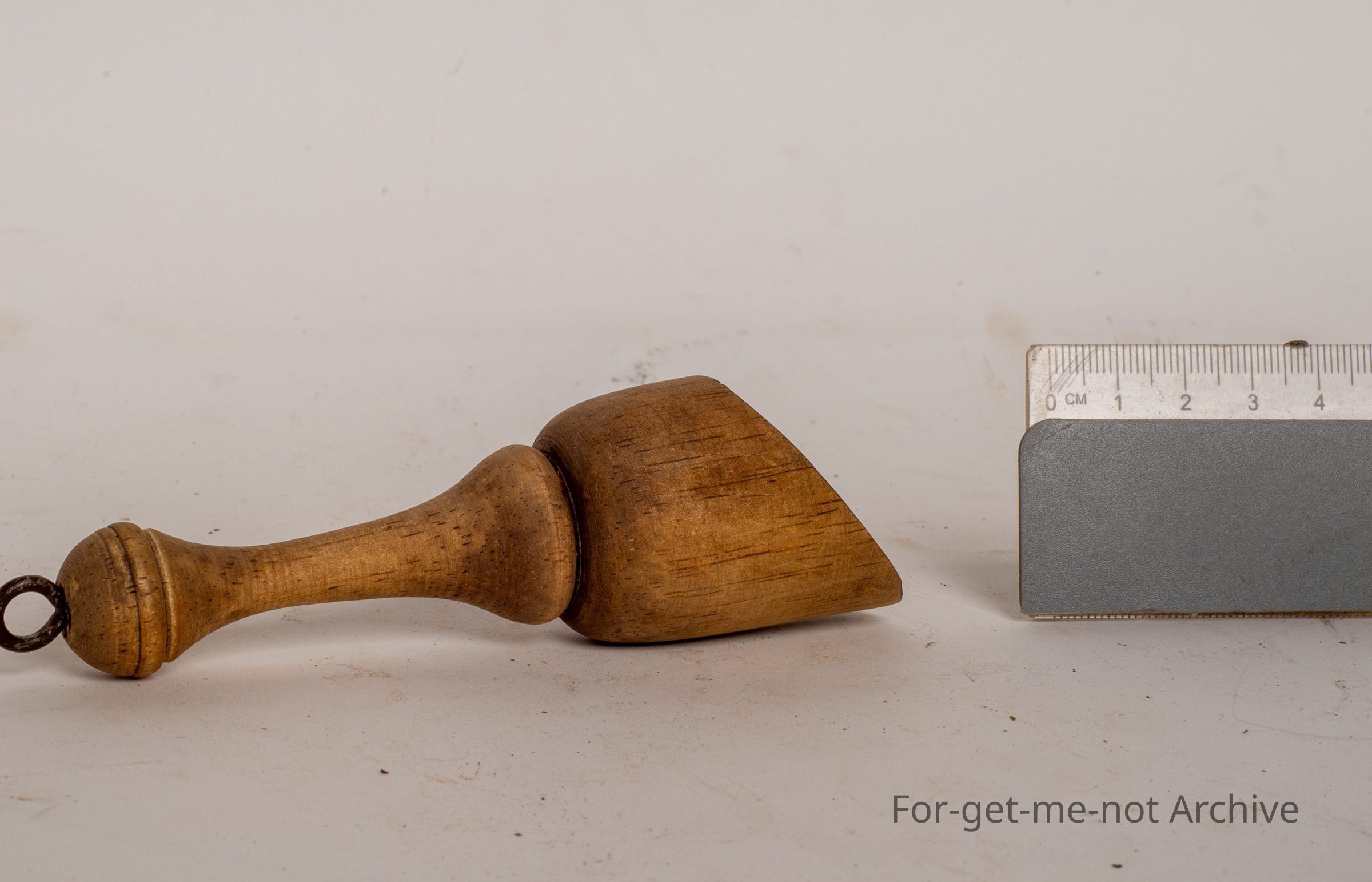 This is a small wooden apparatus, a hanging hook of wire shaped like a half cut or a ball cut in half.