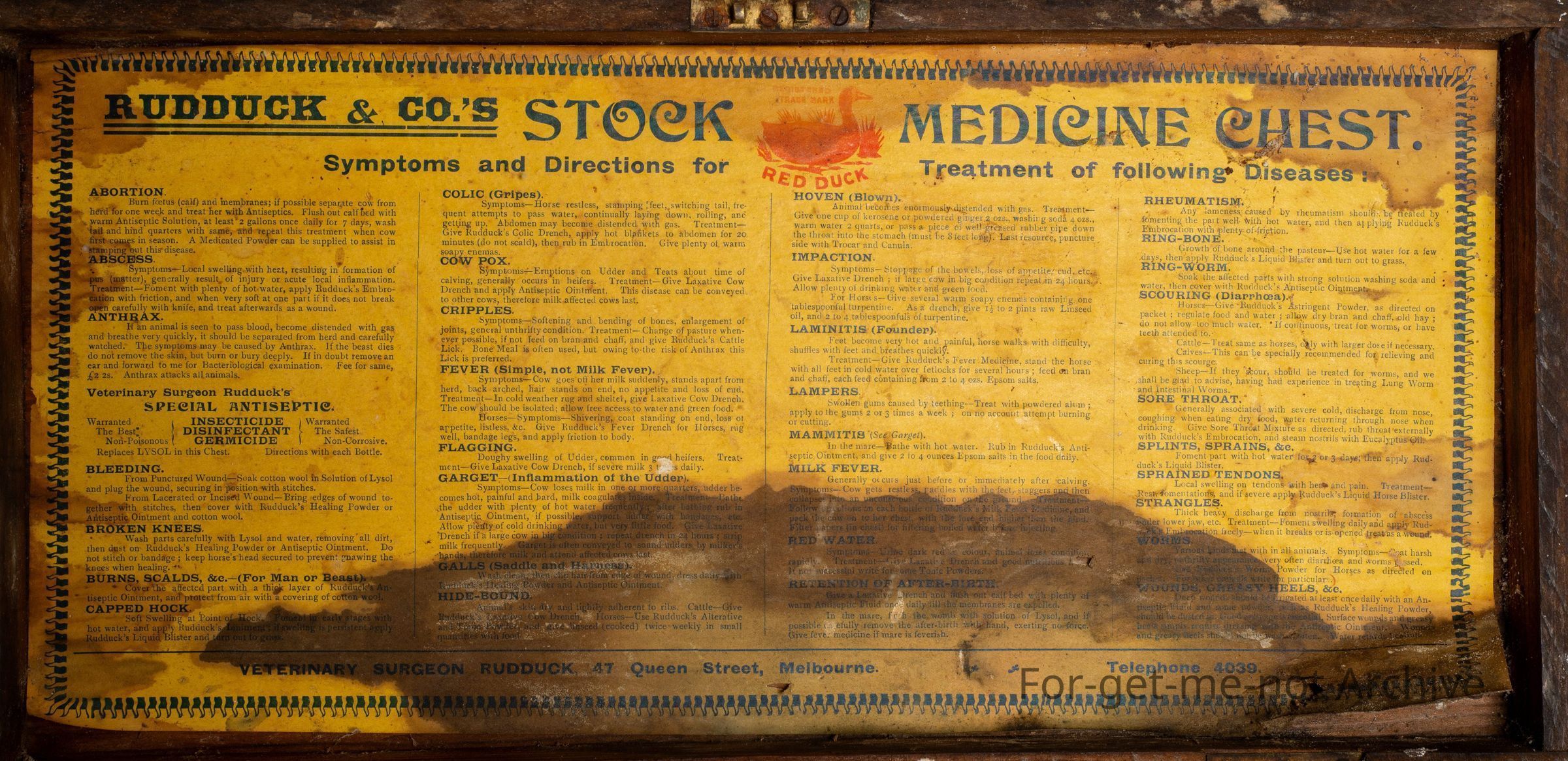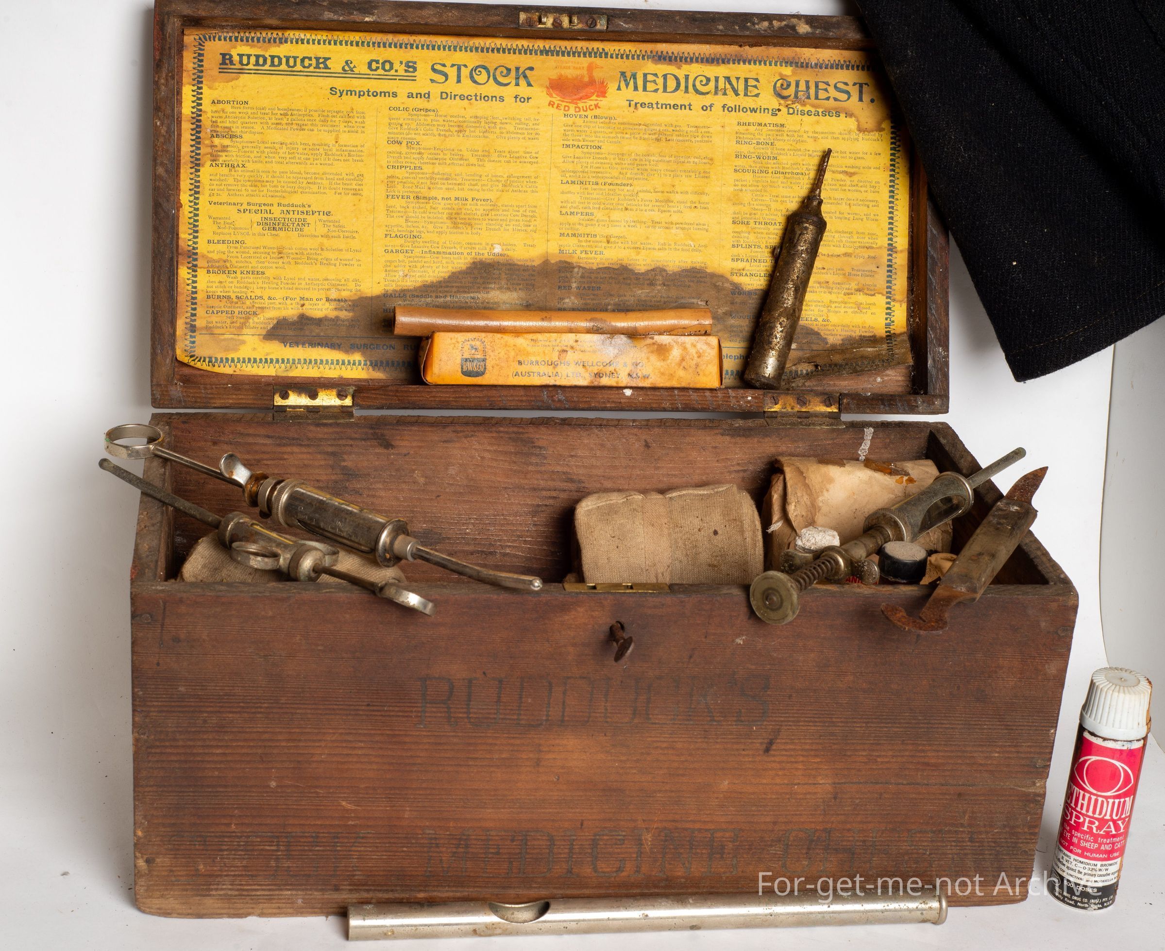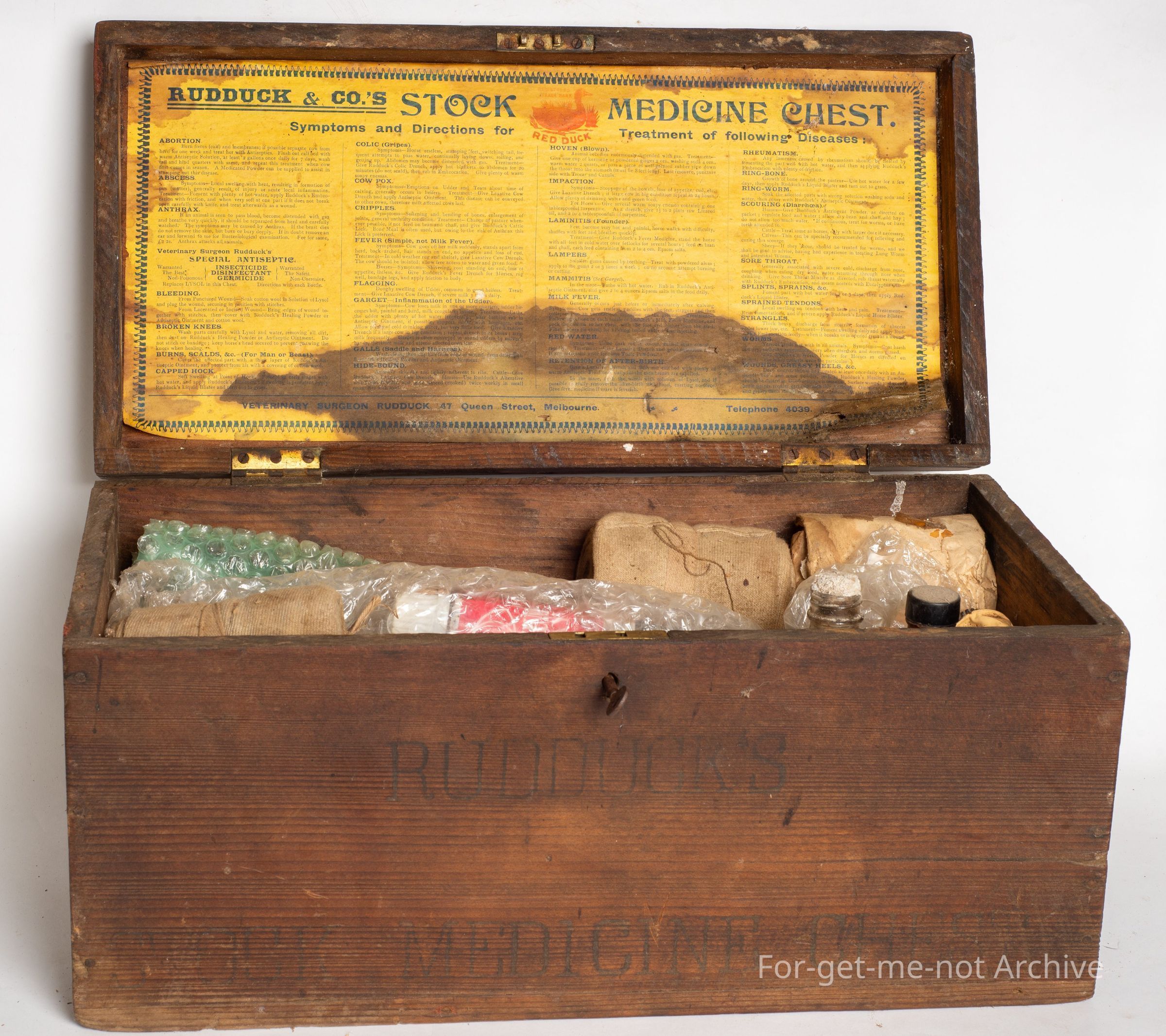 A wooden veterinary box. Ruddock and Company, Queen Street, Melbourne with all the, medicines and apparatus for treating animals.