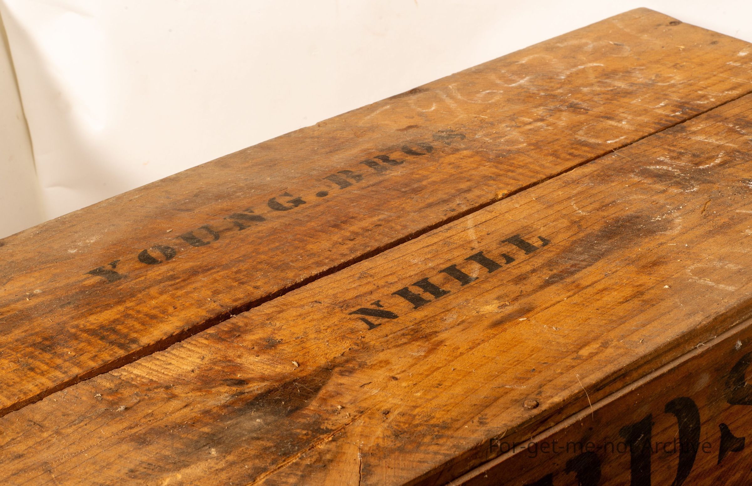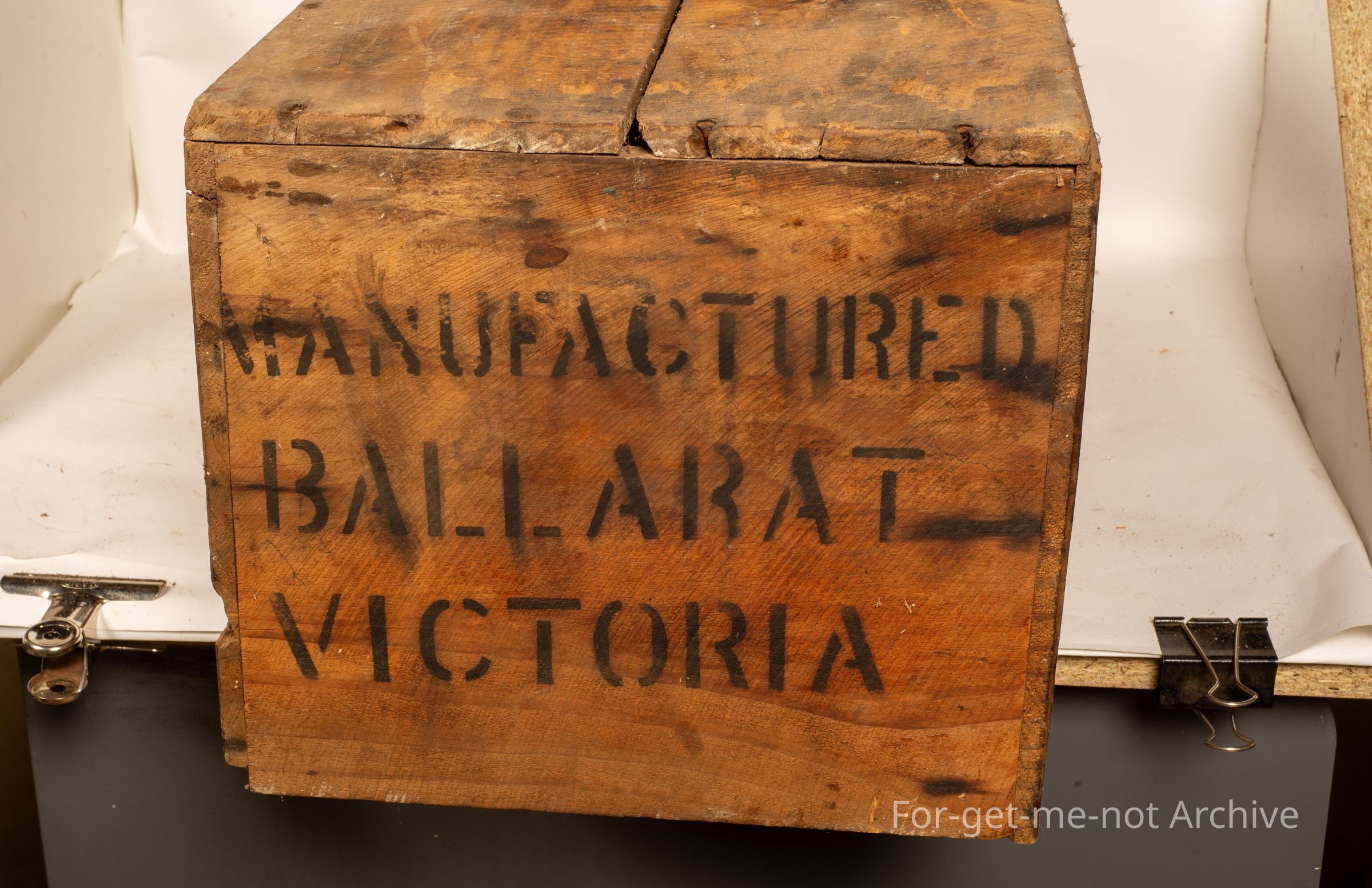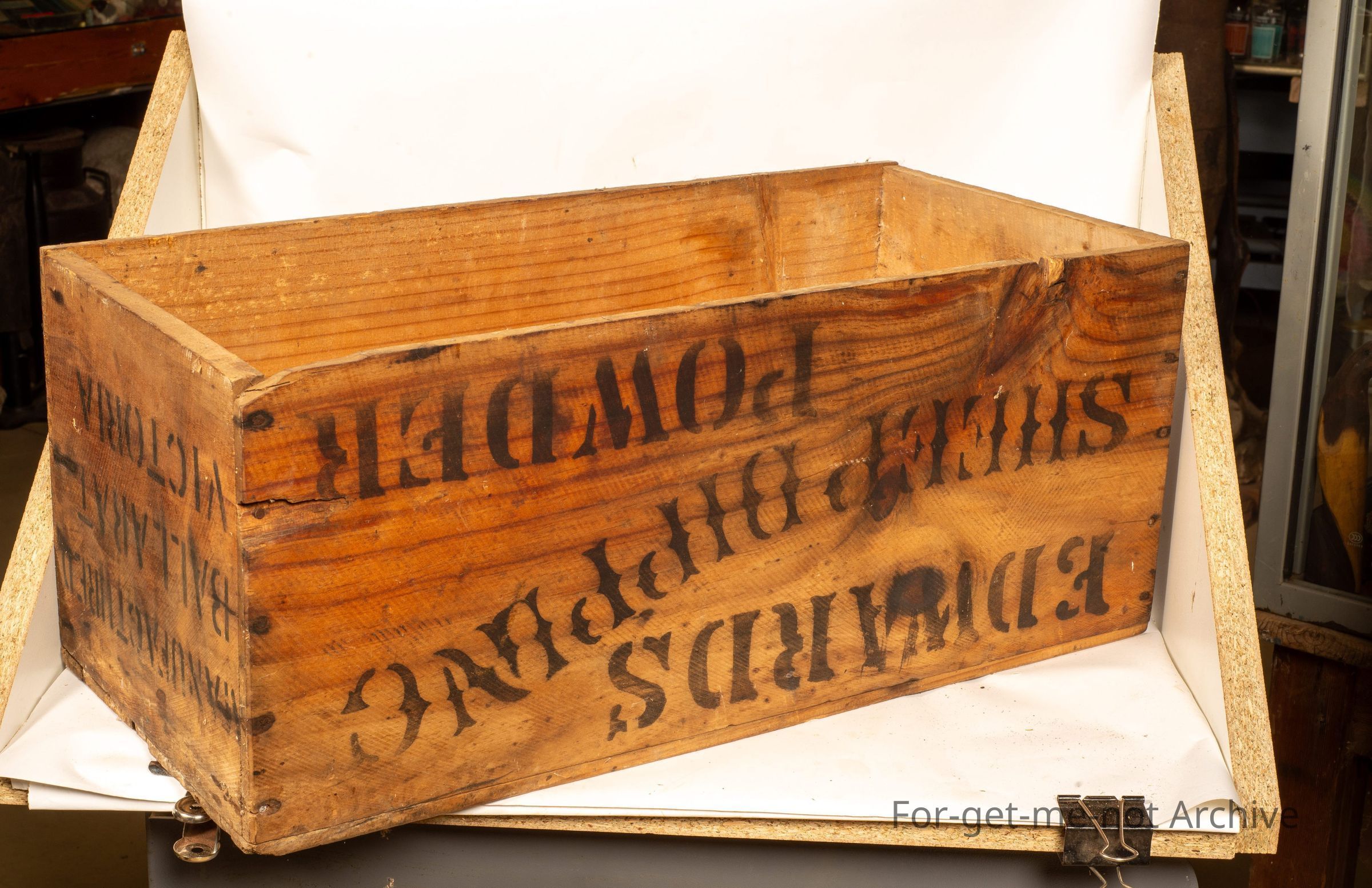 Wooden packaging boxes. This one, interesting box from Edwards, Sheep Dip Ballarat, Victoria. Sheep Dip Powder. It's in pretty good order. This box has also got a stencilling on the bottom where it's been consigned through Young Brothers Nhill. So it would have been manufactured in Ballarat, the product, and sent over to Neil. The box is quite a rare box in very good condition.Collection