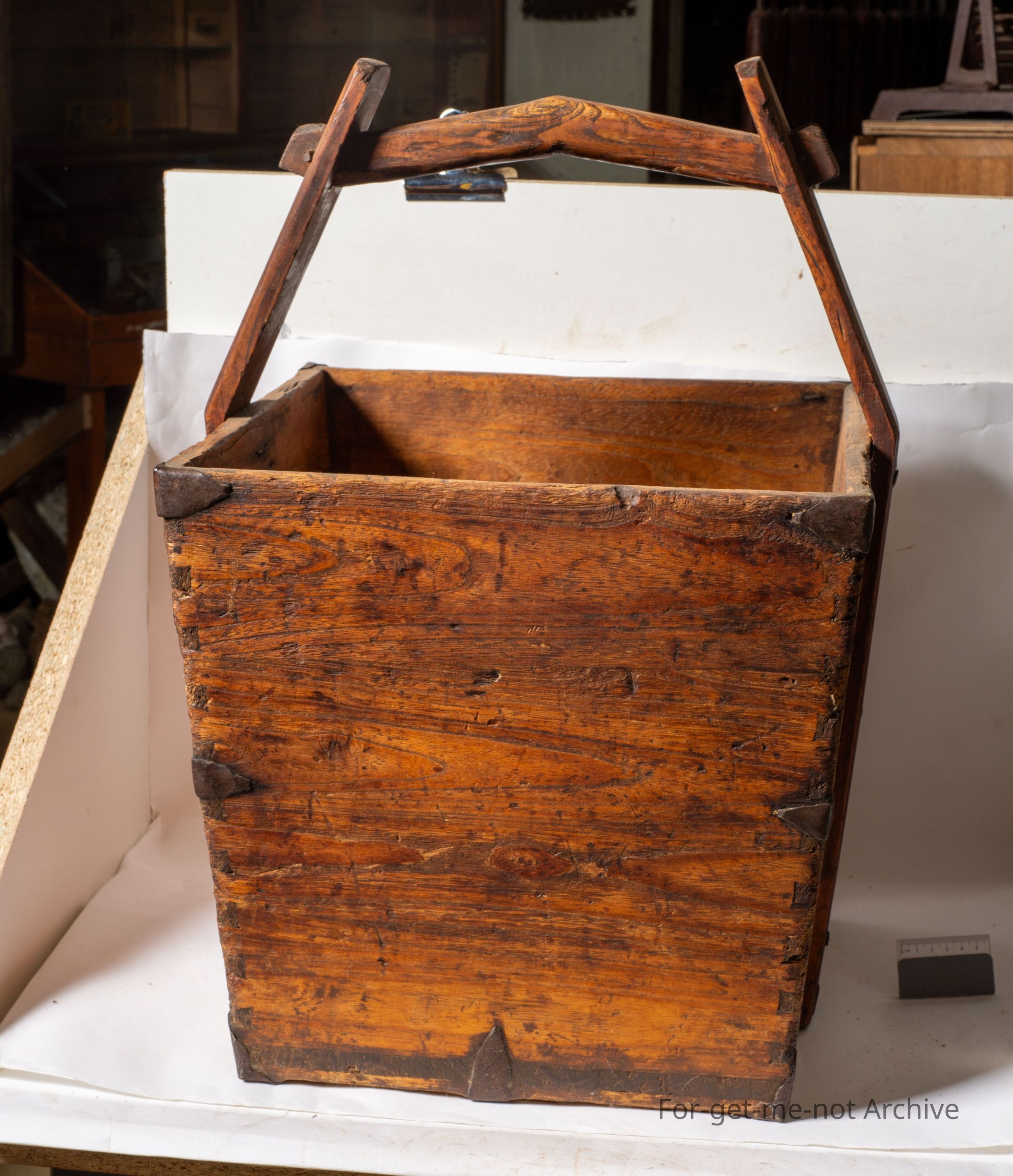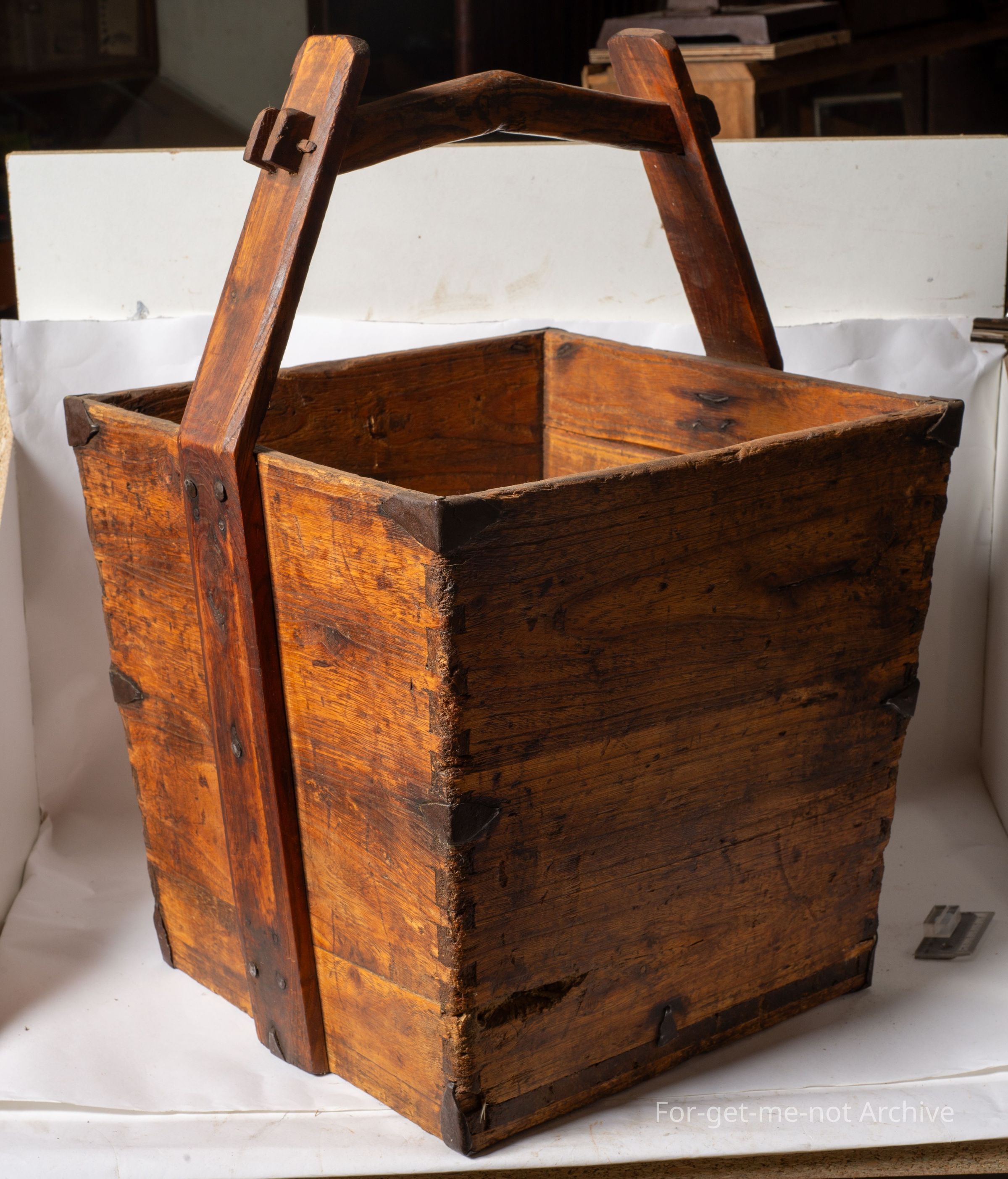 This is a wooden carry bucket. Square in shape. Quite deep. Handles that come up the side and have a peak in the cross section. This is mortise, pigeon dovetail join with metal supports for extra weight. A nice early piece of Chinese, craftsmanship.Collection