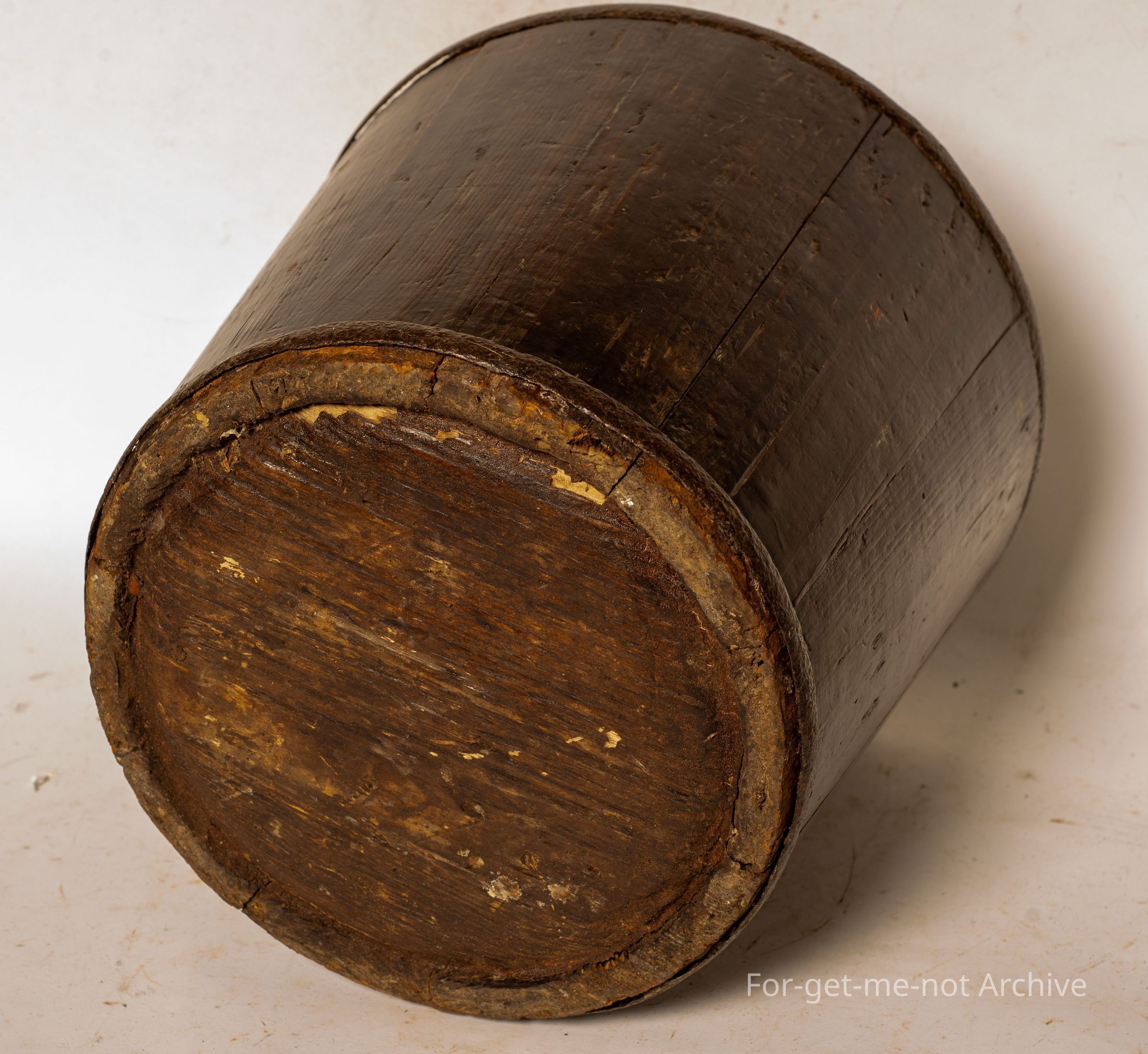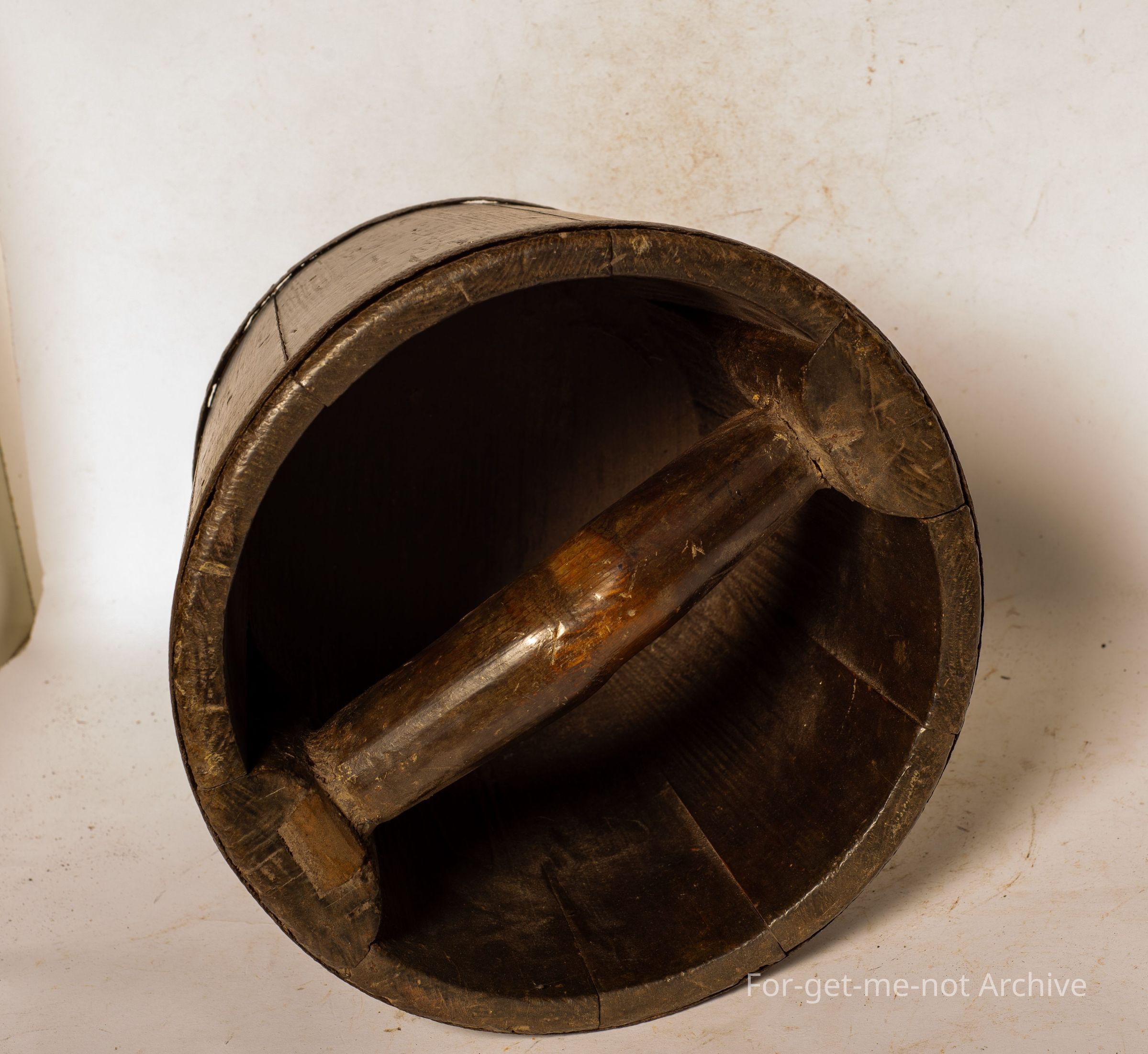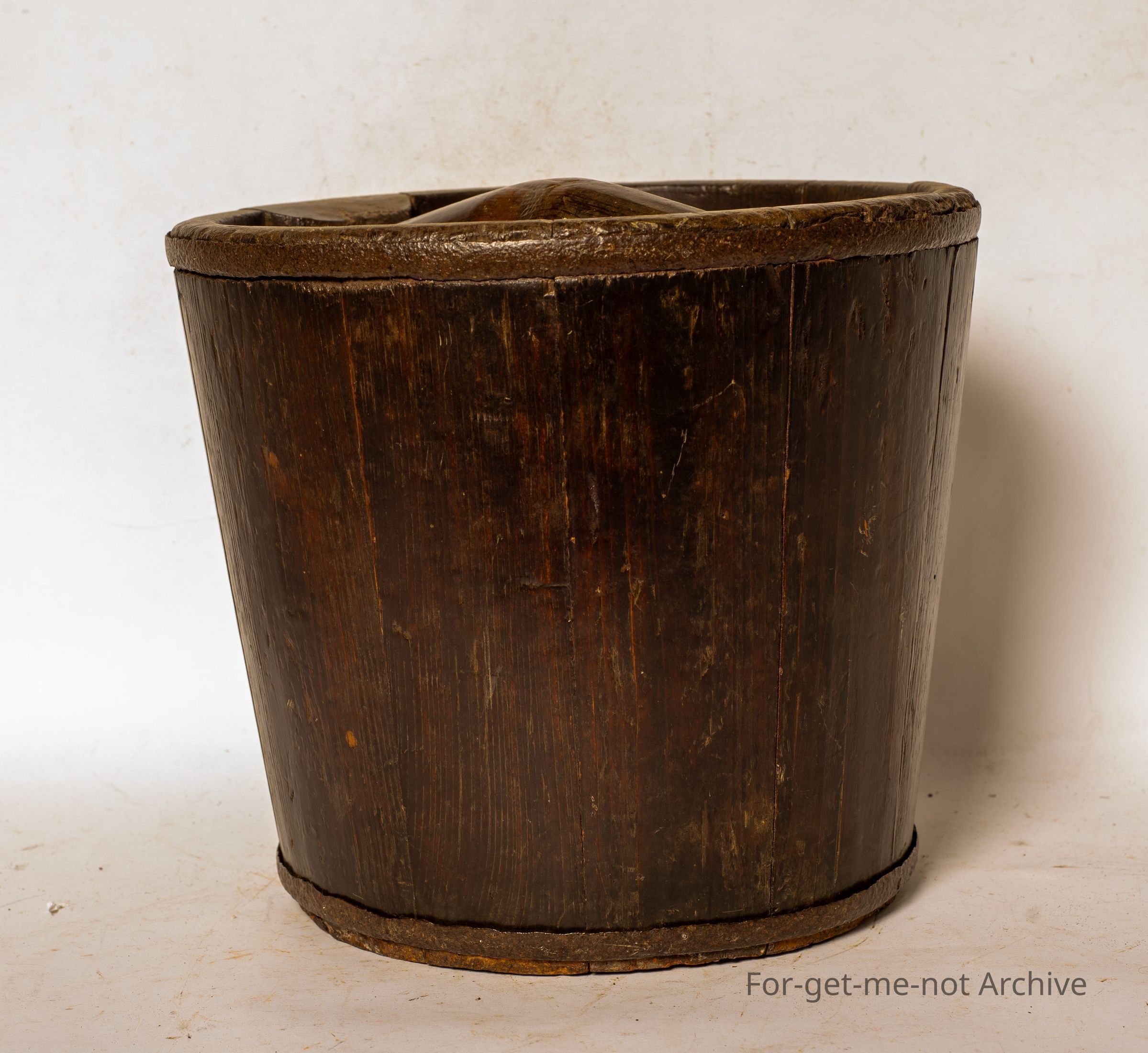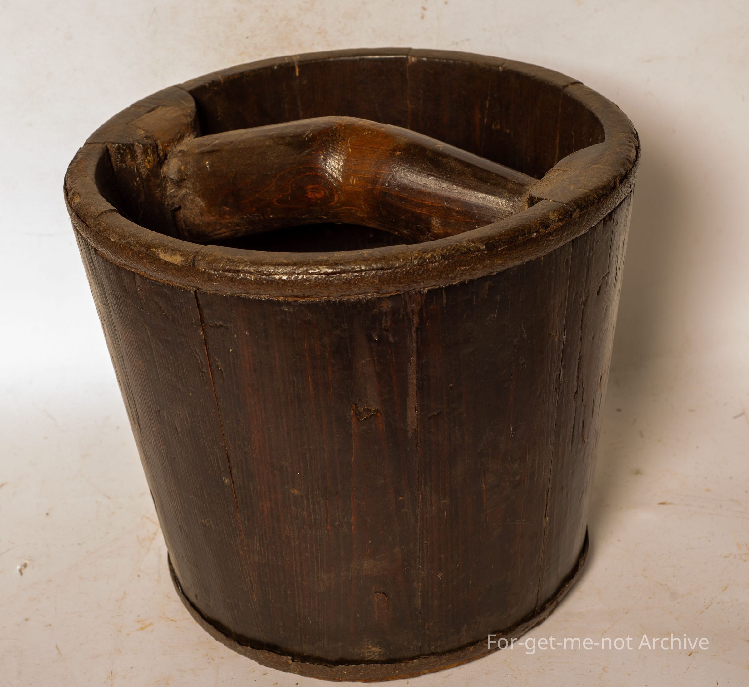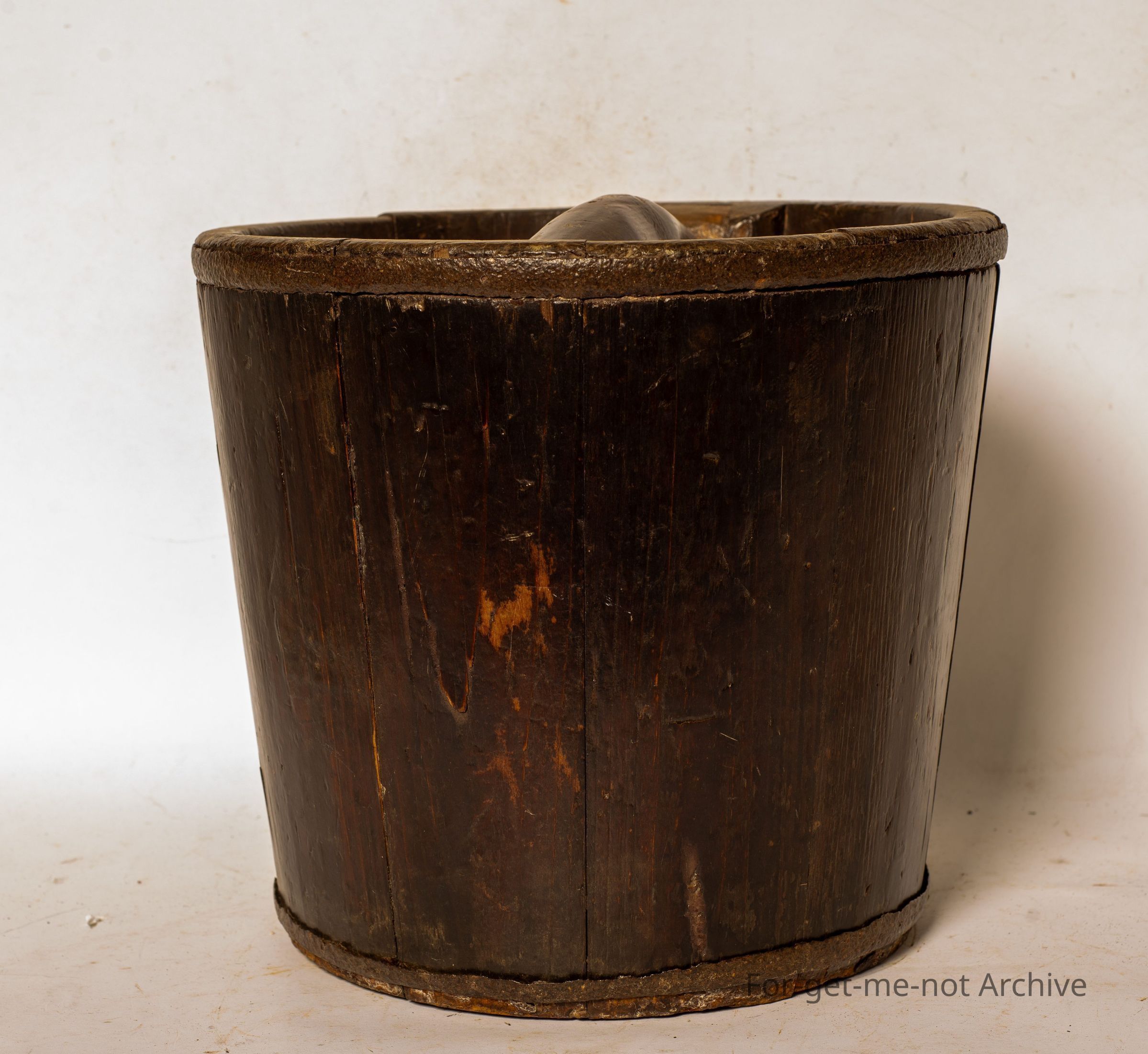 Chinese collection. This is a wooden, carrier that would have been used on the yoke, one either side. This could have been for carrying rice, or water. A heavy handle that runs from one side to the other internally. The usual metal support rings at the top and the bottom.Collection