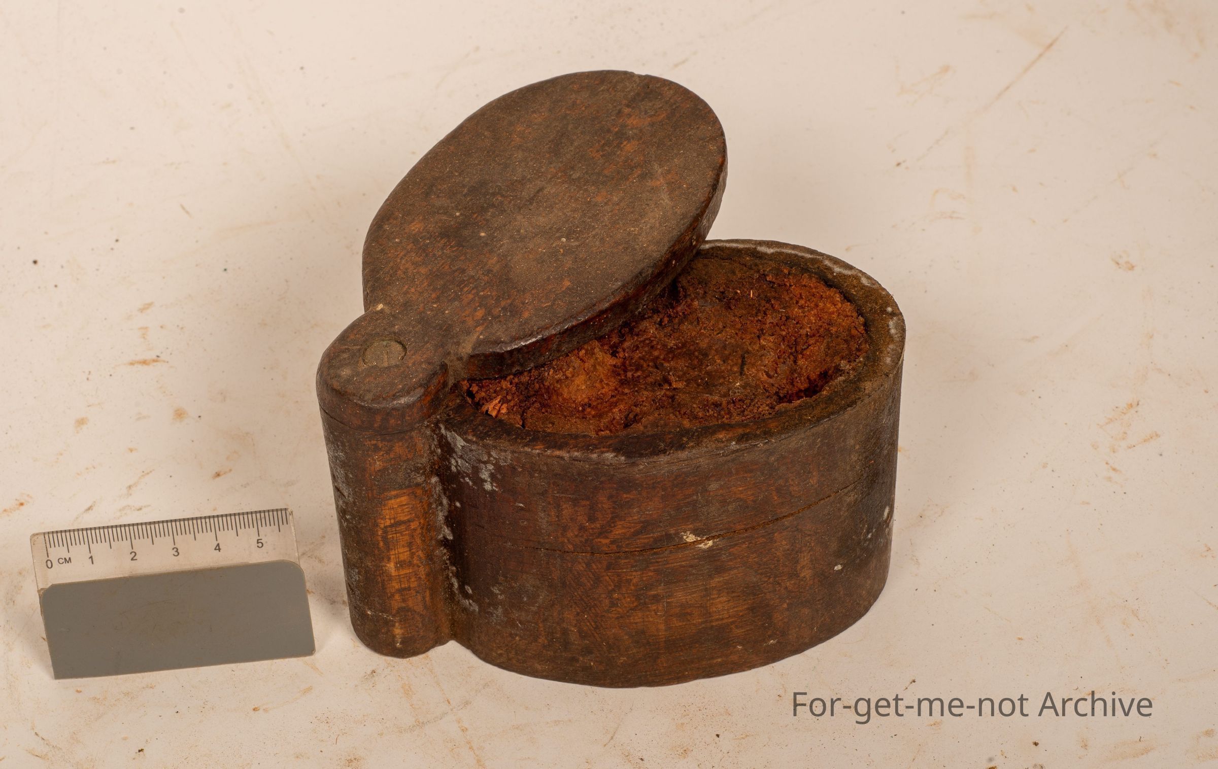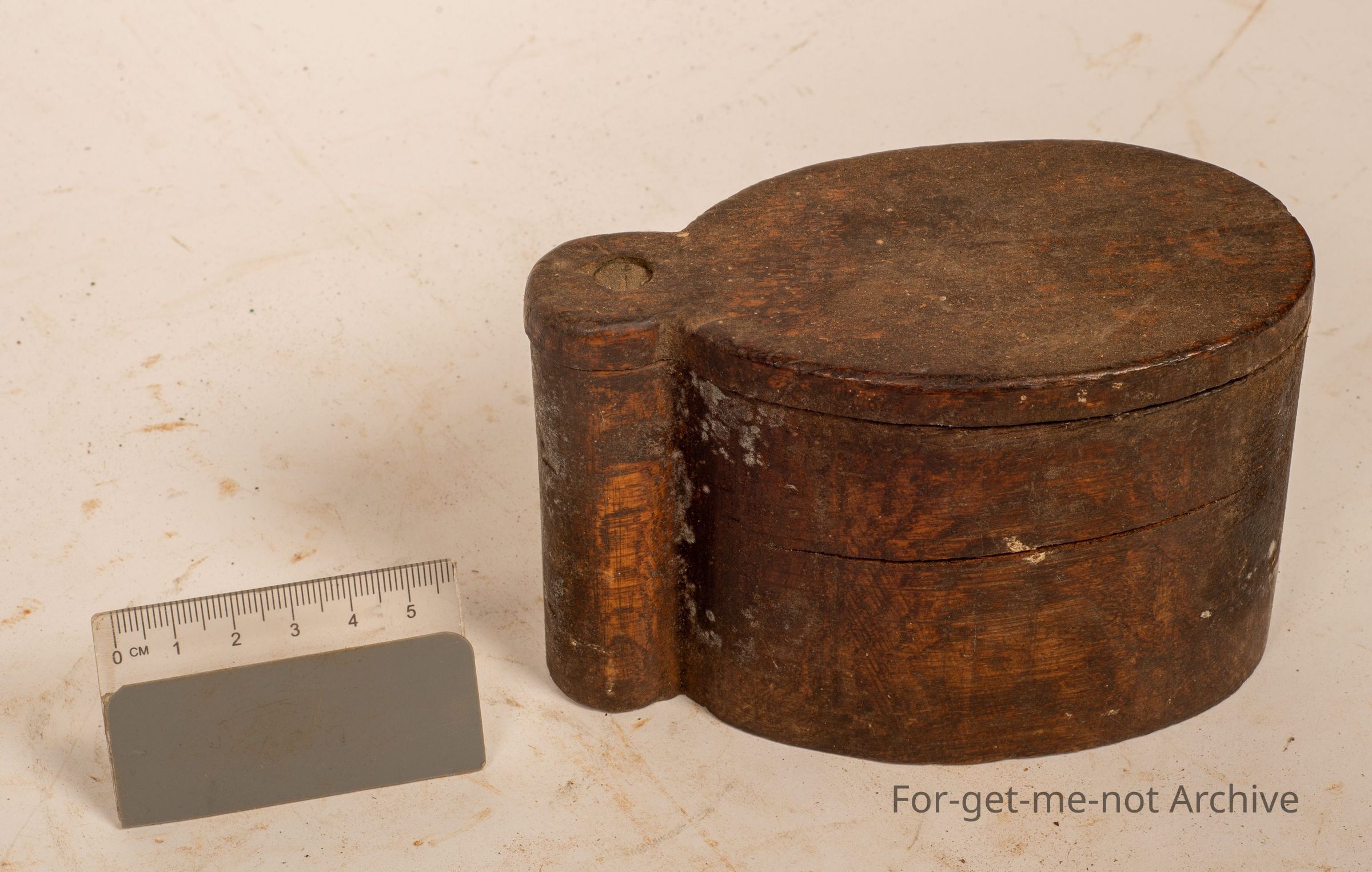This is a wooden canister with a, a revolving wood lid. These were an intricate part of bullet teams. They were filled with fat that was put on the shoulder or the neck region of the bullock to stop chafing, with the yoke on. So each bullock team had one of these. Very hard to find. Pretty obscure. Not everyone knows what they are. This one is actually still full of fat.Collection