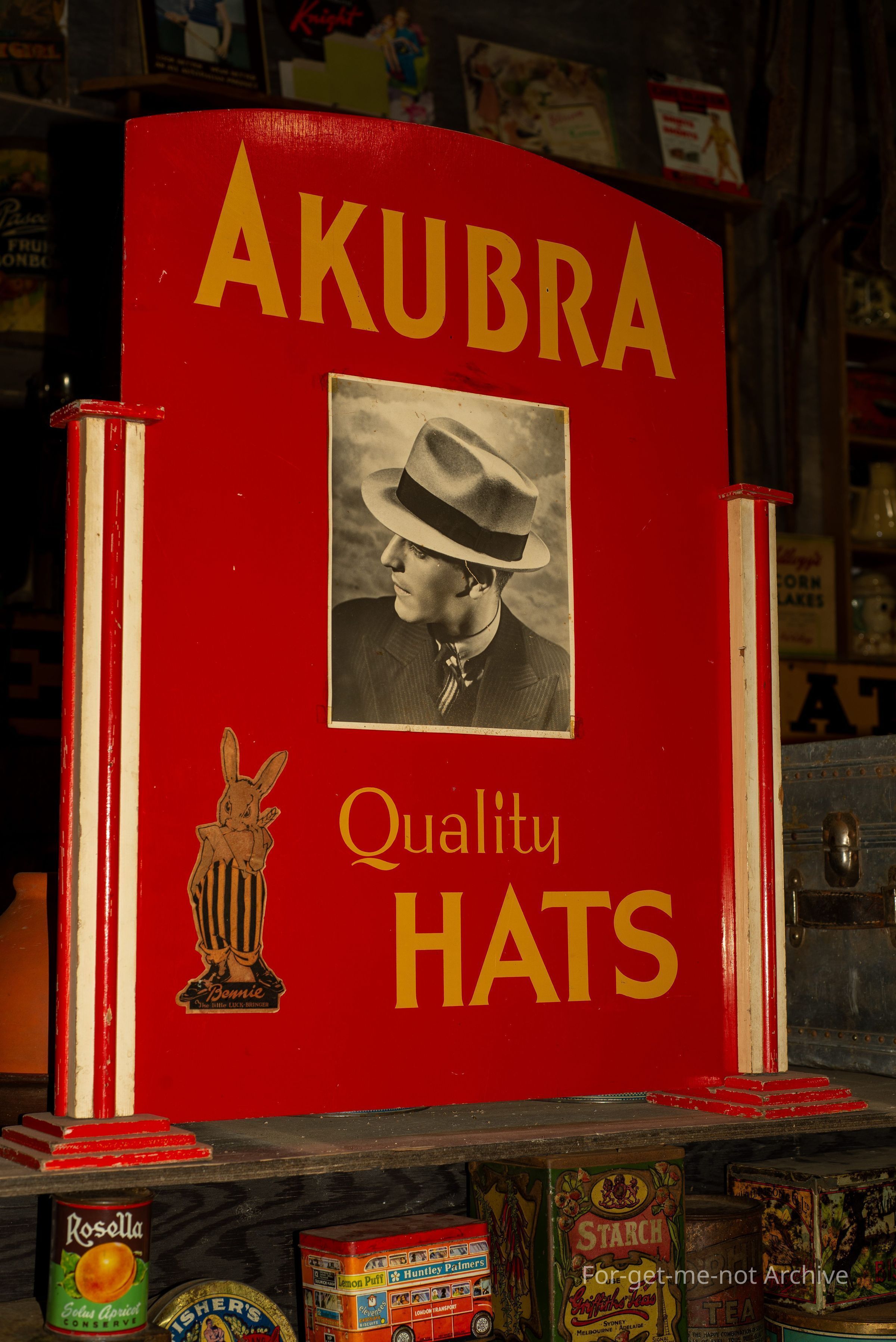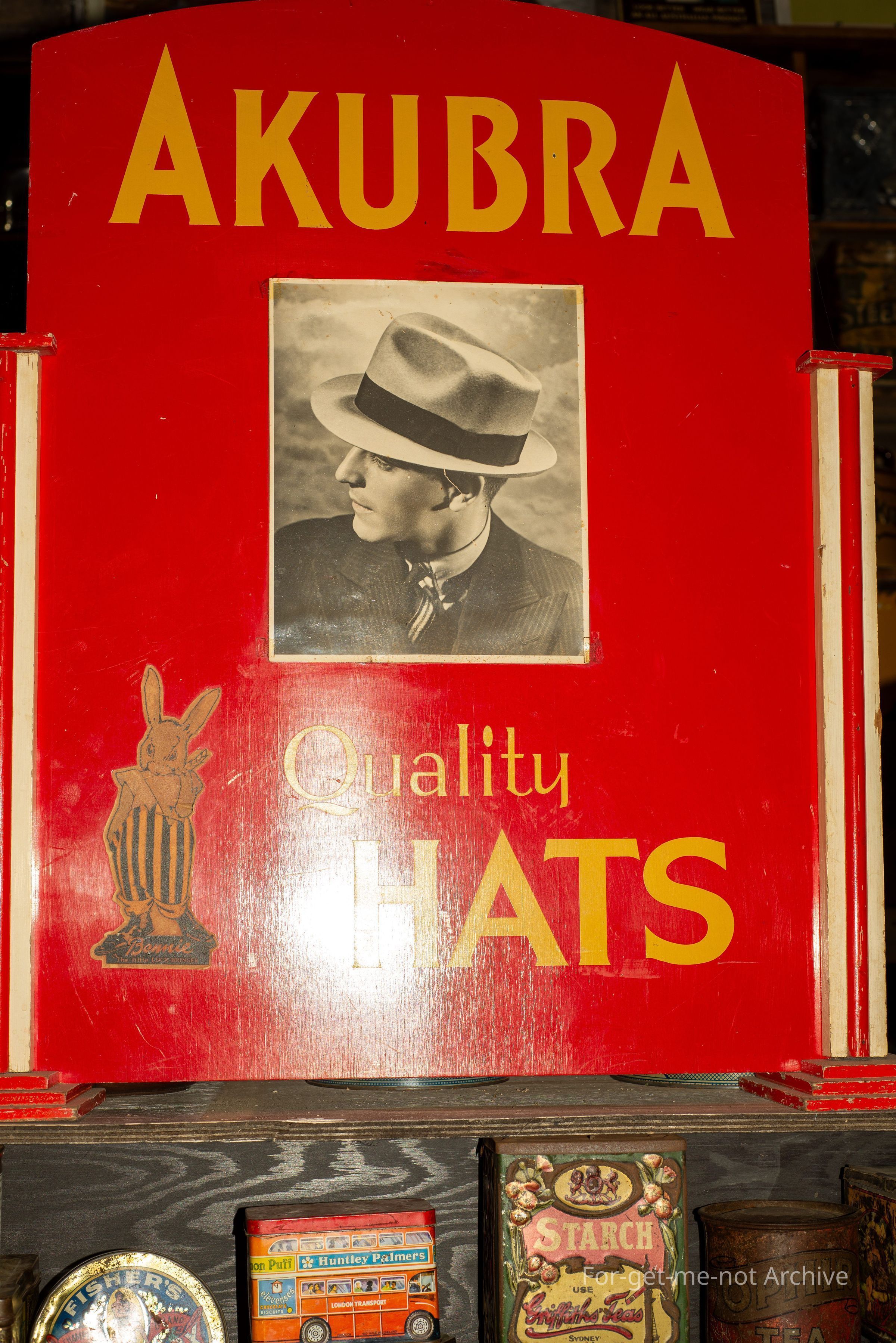 This goes into the category of Advertising. This piece is in a wooden frame advertising Akubra hats with the image of a man wearing a very smart hat. It also has an image of a rabbit because of the, rabbit hair that was used to make the felt. A lovely piece probably from the fifties, but in very good condition. Double sided as well?Collection