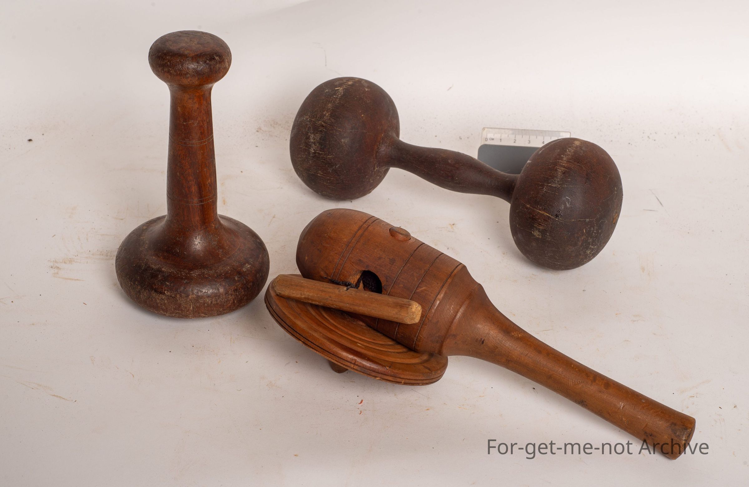 These are 3 wooden items. 2 possibly from saddlers for, forcing material into horse collars. The third one is a wooden toy used for kids with a rope to activate the spinner. Beautifully made.Collection