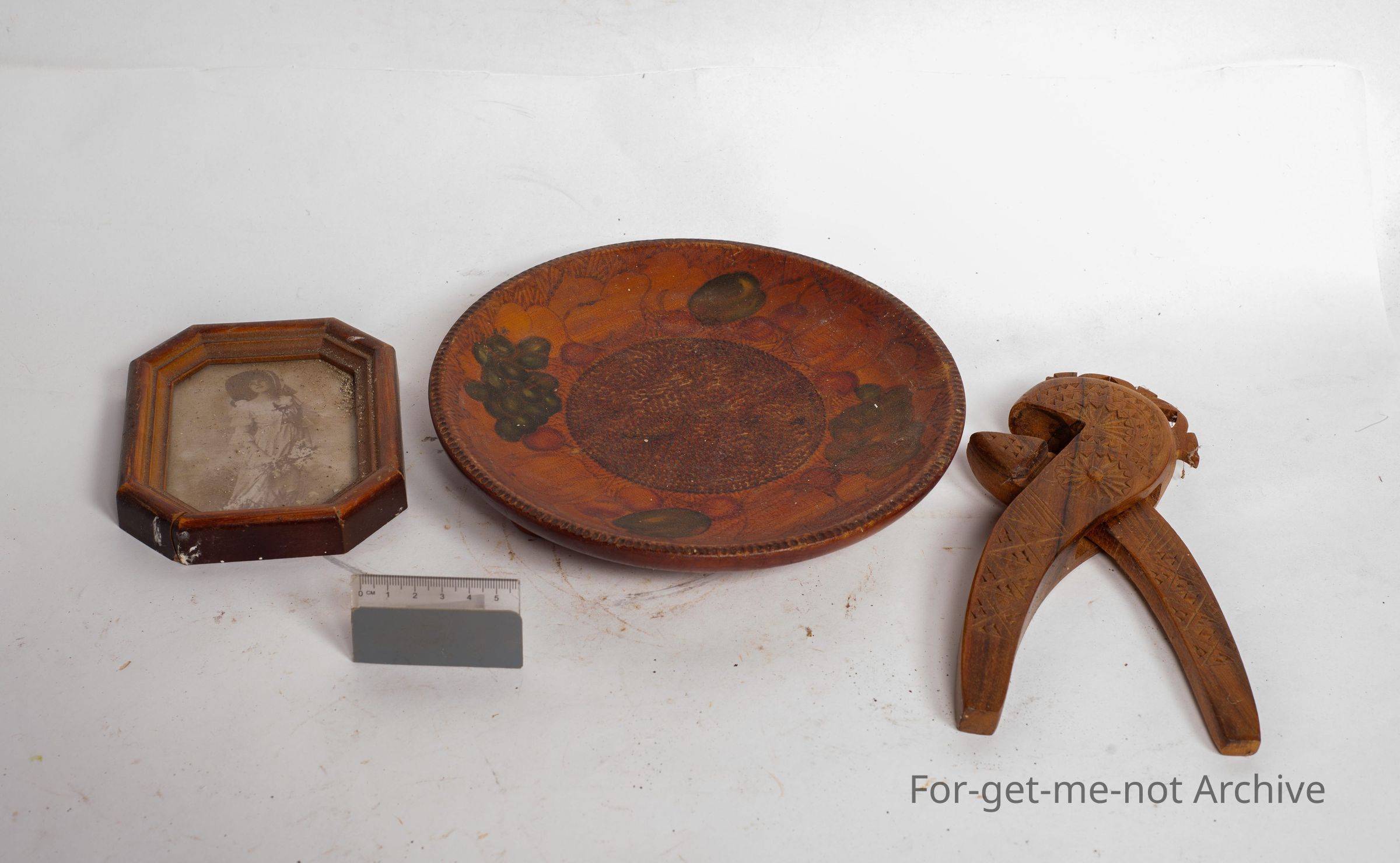 This is a group of 3 wooden articles. 1, Chipcraft Nutcracker. The second one, plate a wooden plate with, pyro work. And the third one is a small wooden picture frame, with a lady,Collection