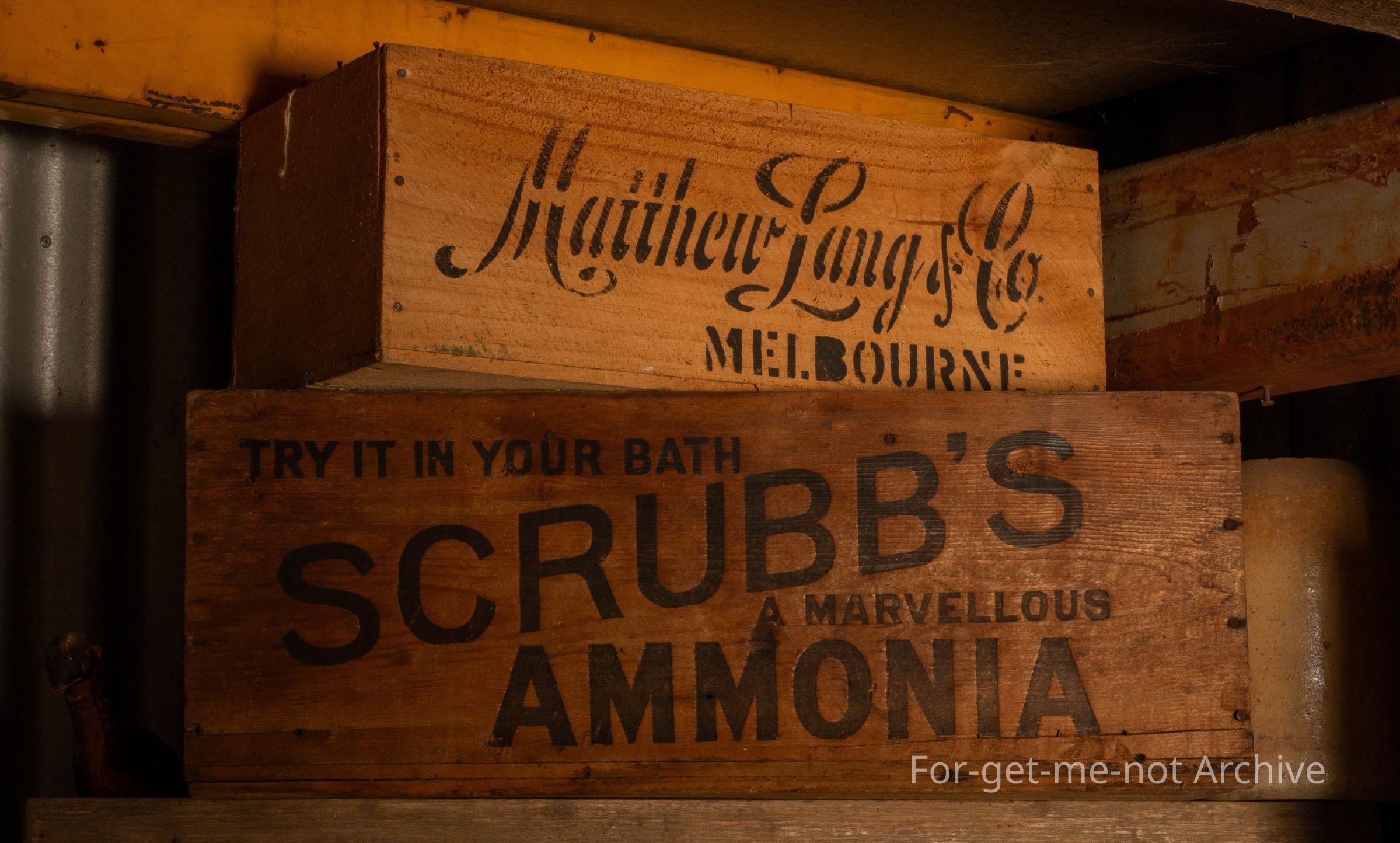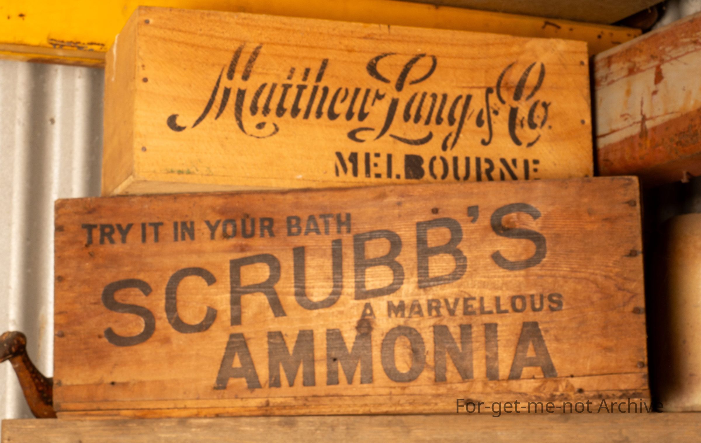 Description, these are 2 wooden packing crisis cases in beautiful condition. The first one is stencilled Matthew Lang and Co Melbourne. The second one is Scrubbs Cloudy Ammonia, try it in your bath. It's a marvellous product, both in very good condition.Collection