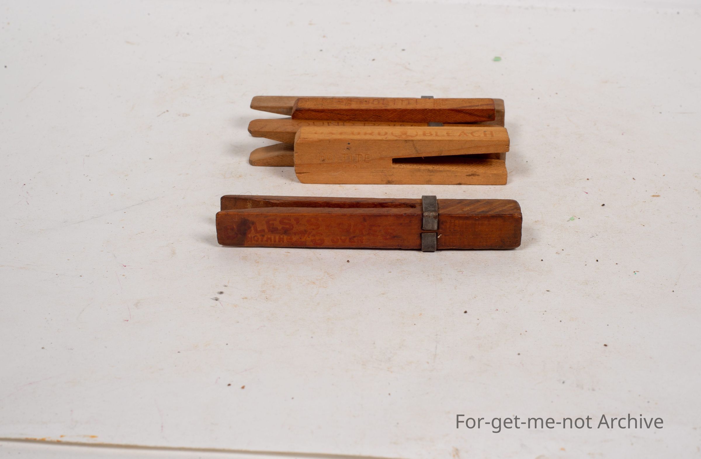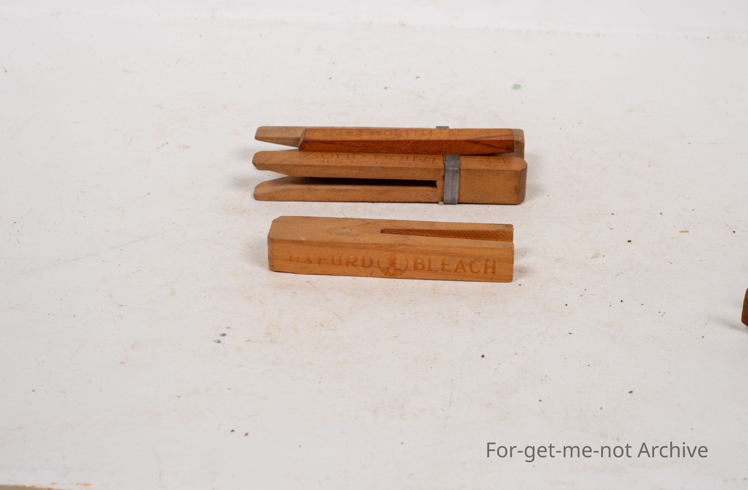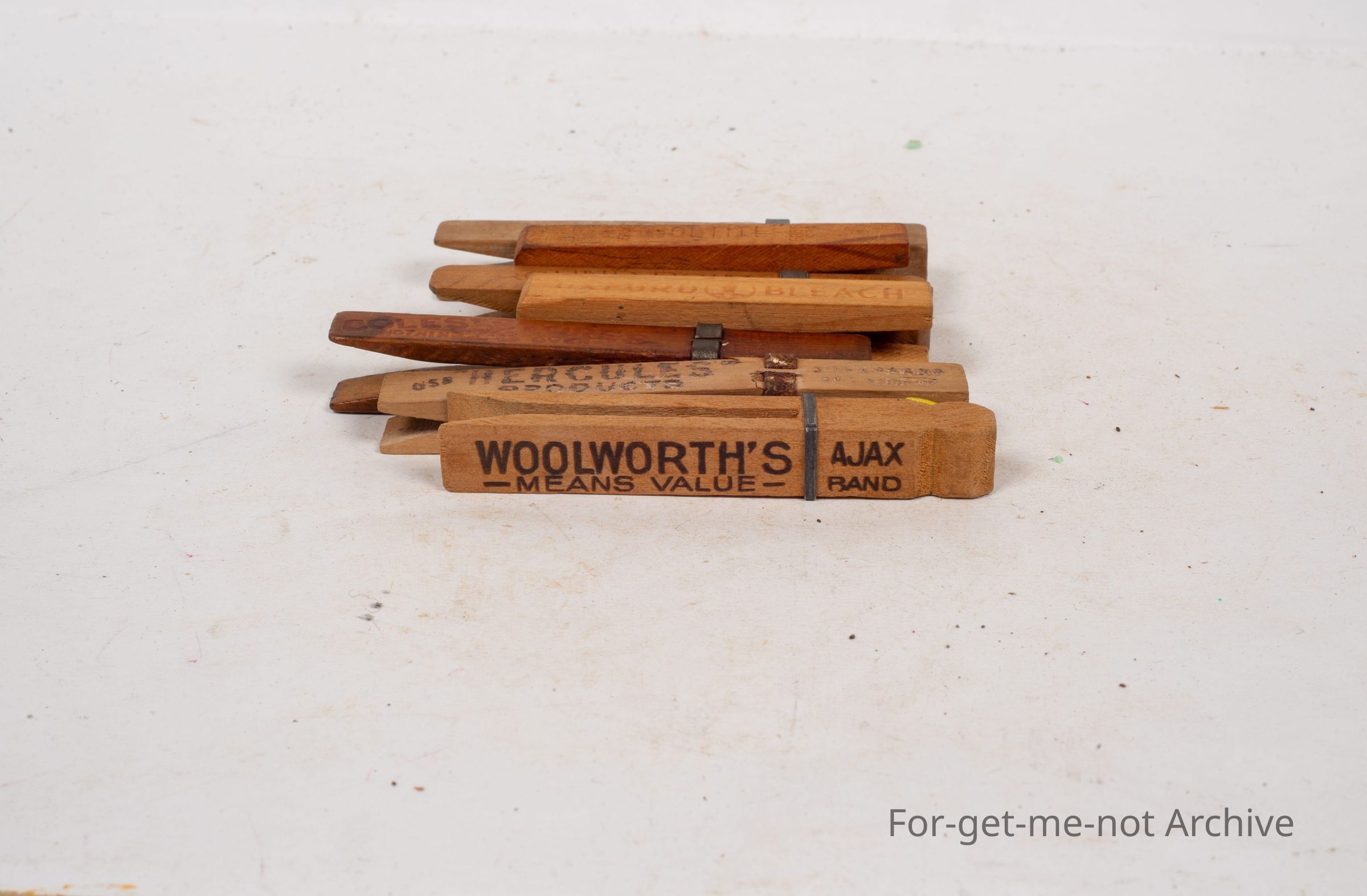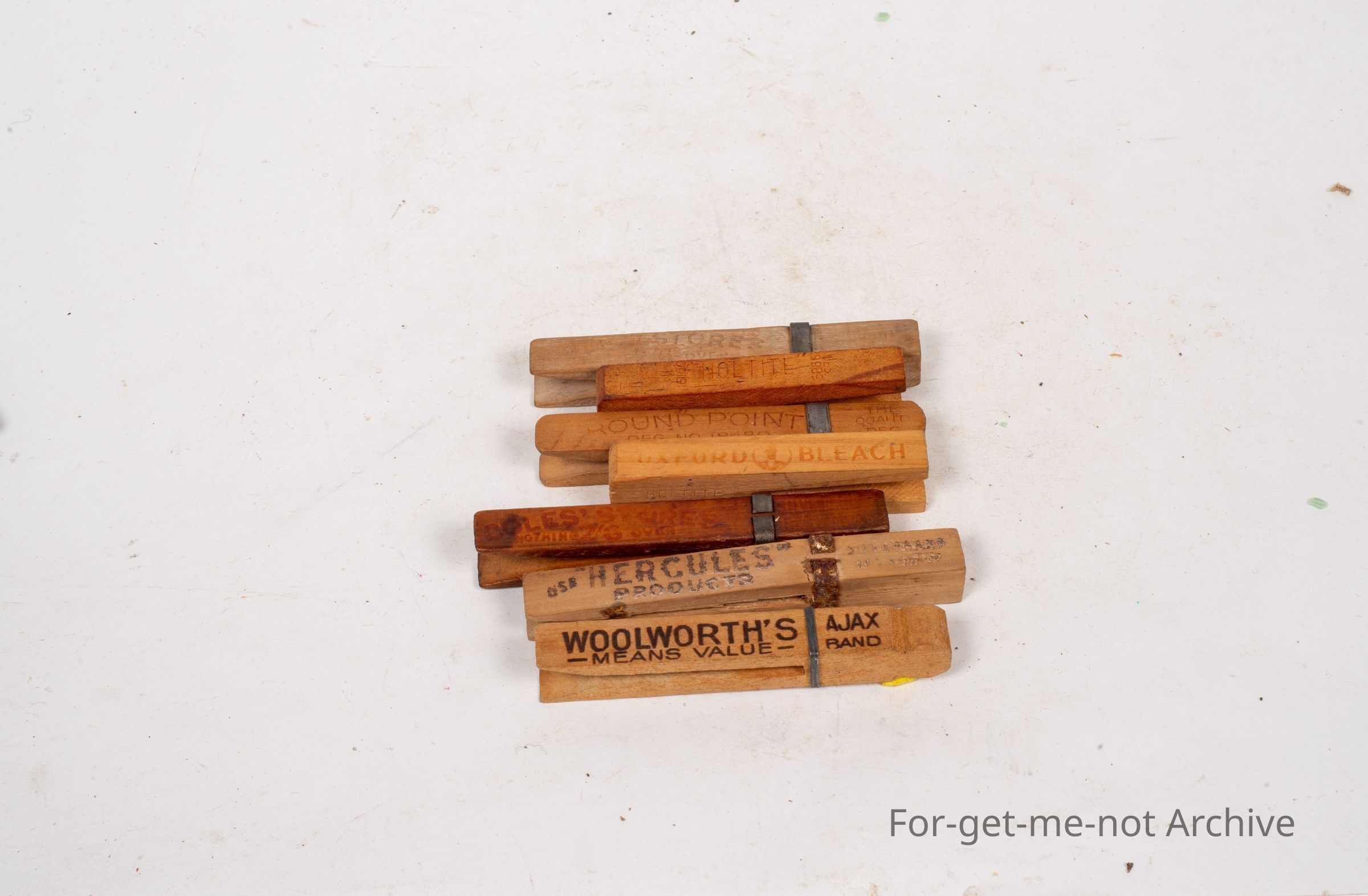 Is a group of wooden advertising pegs. Different shapes and sizes with different companies. Some are faded, other ones quite clear.