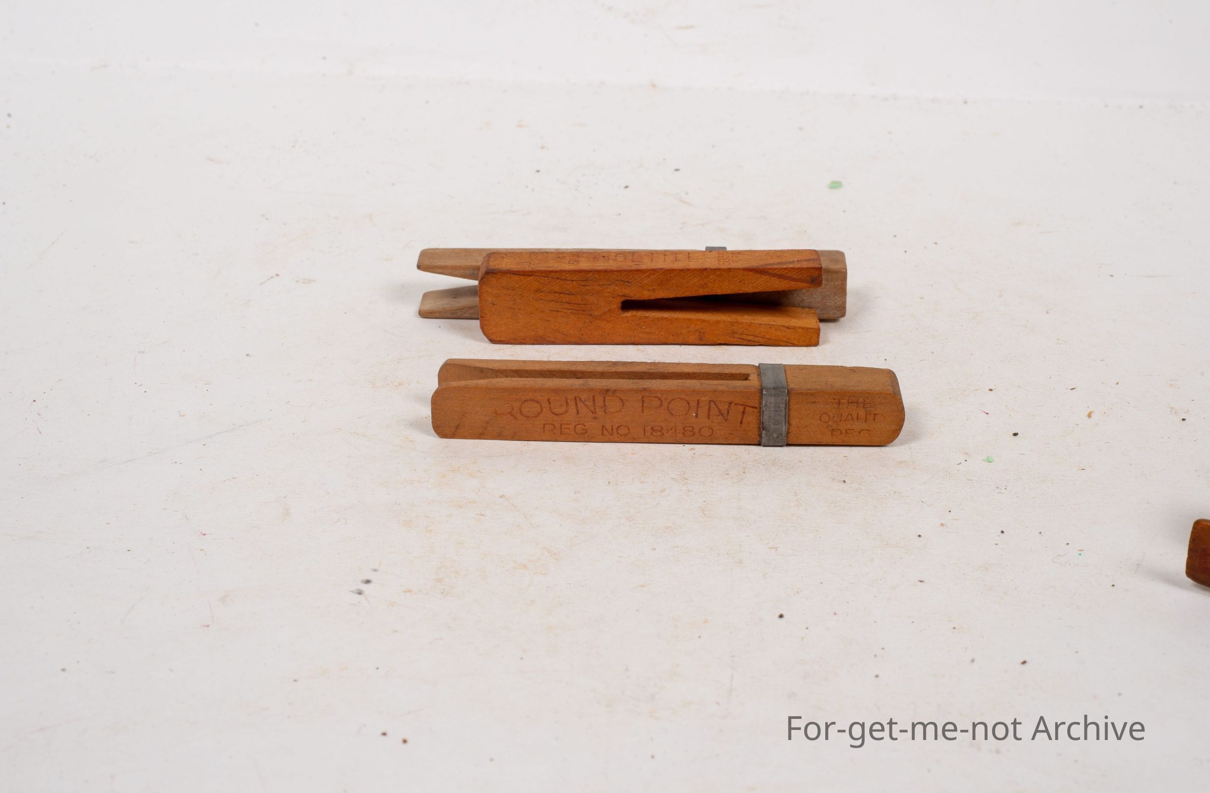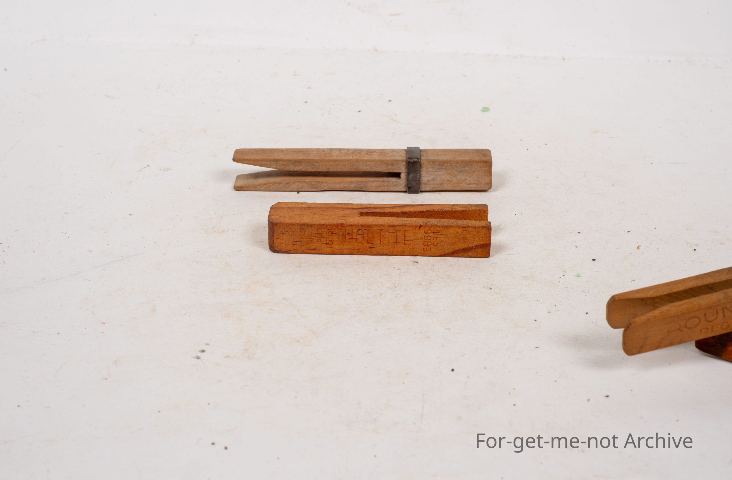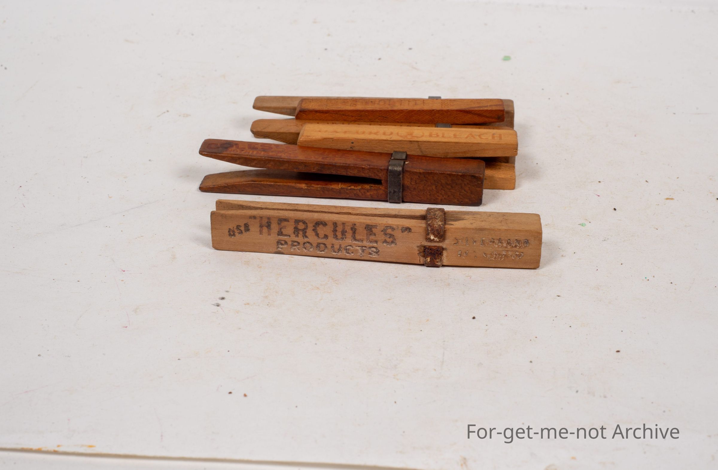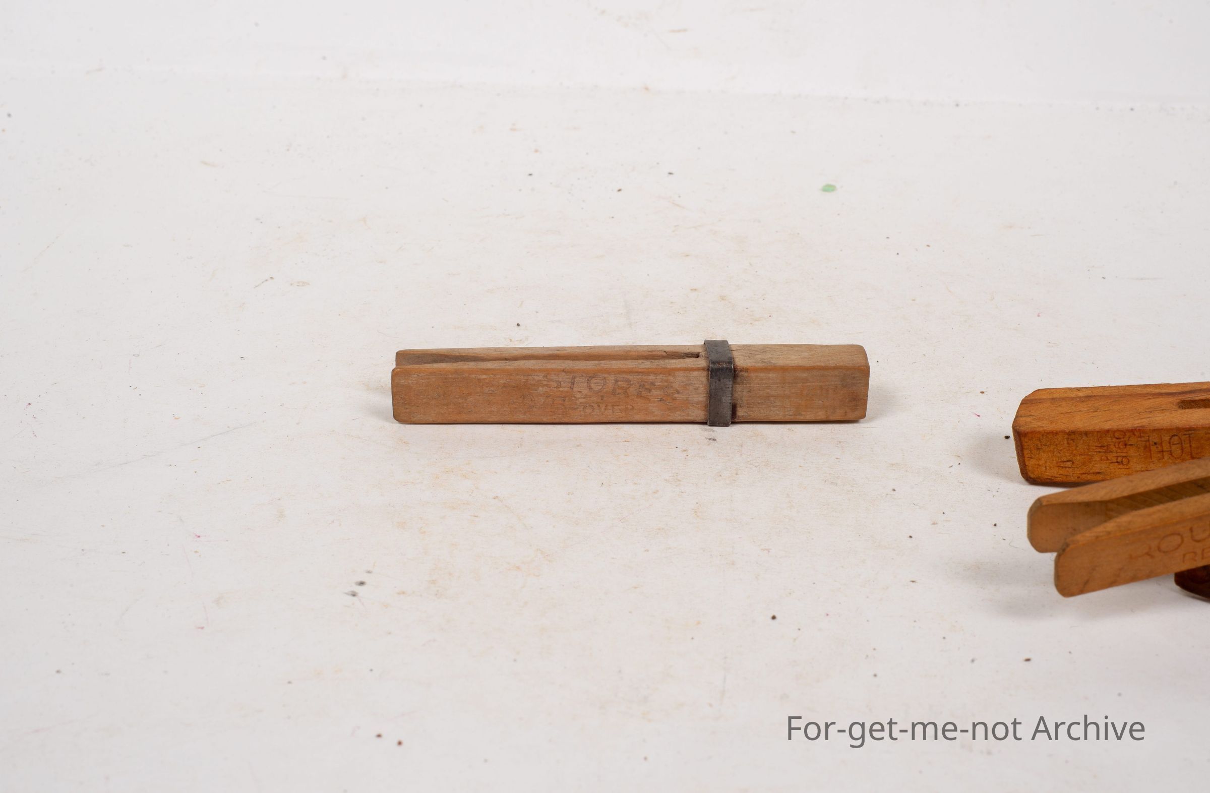 Is a group of wooden advertising pegs. Different shapes and sizes with different companies. Some are faded, other ones quite clear.