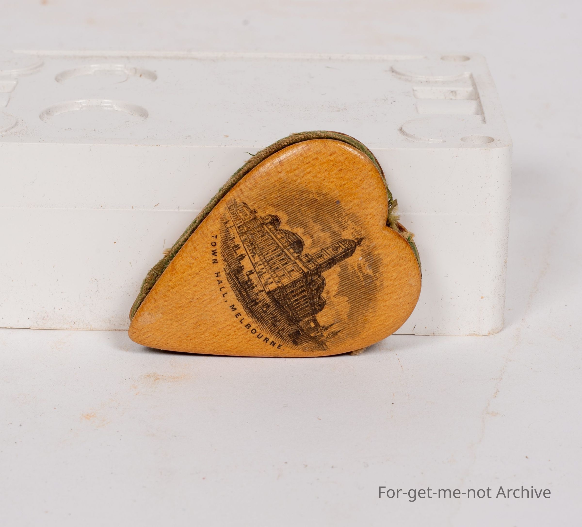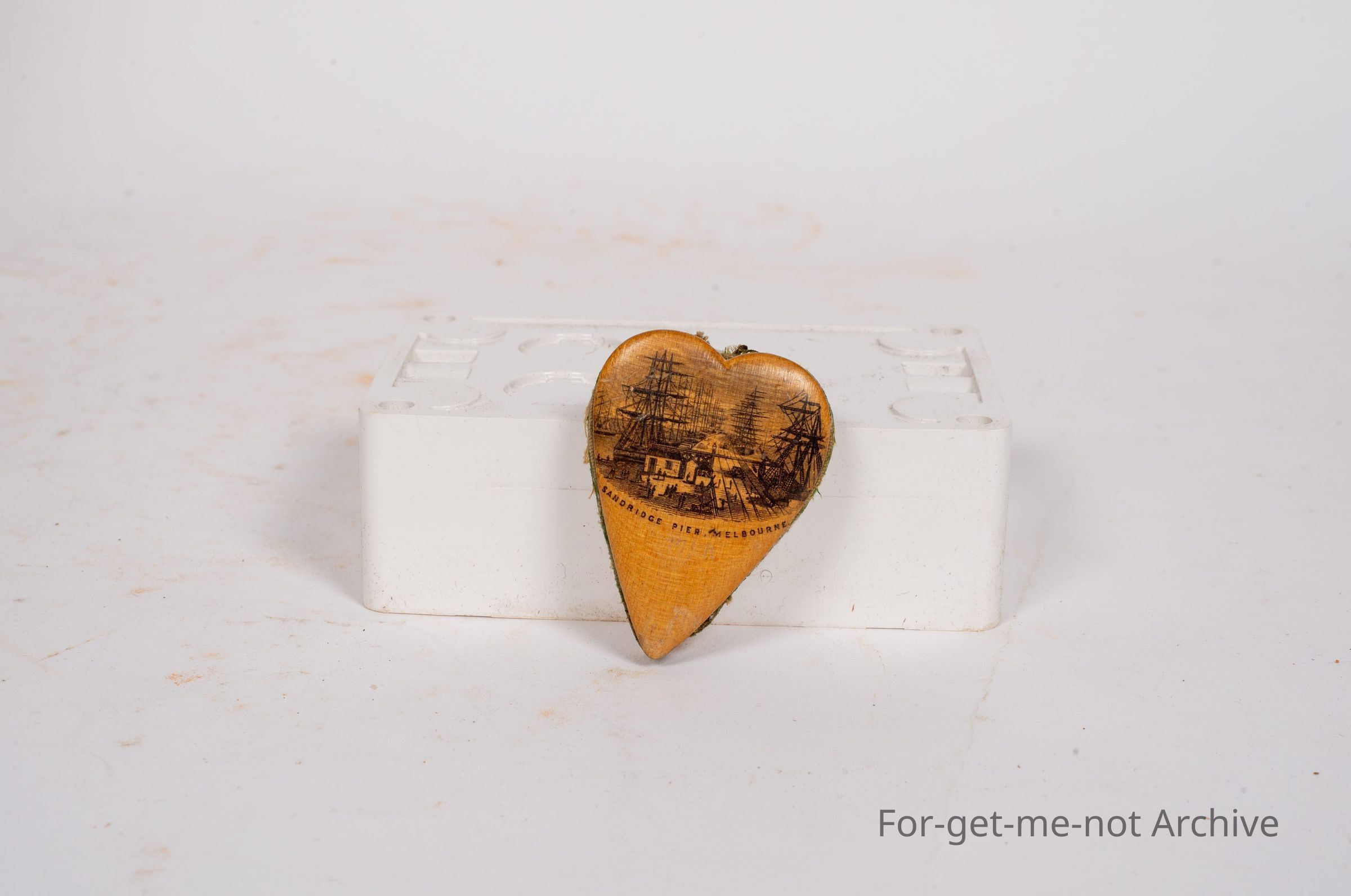 Is a little heart shaped, wooden piece. Maybe it's been a pin holder, I'm not sure, but the graphics, Sandridge Pier, Melbourne, which was the earliest landing spot in the early days of Melbourne. Sailing ships, minimal buildings. On the reverse side is the image of Town Hall, Melbourne. This piece would be very early and in wonderful condition.Collection