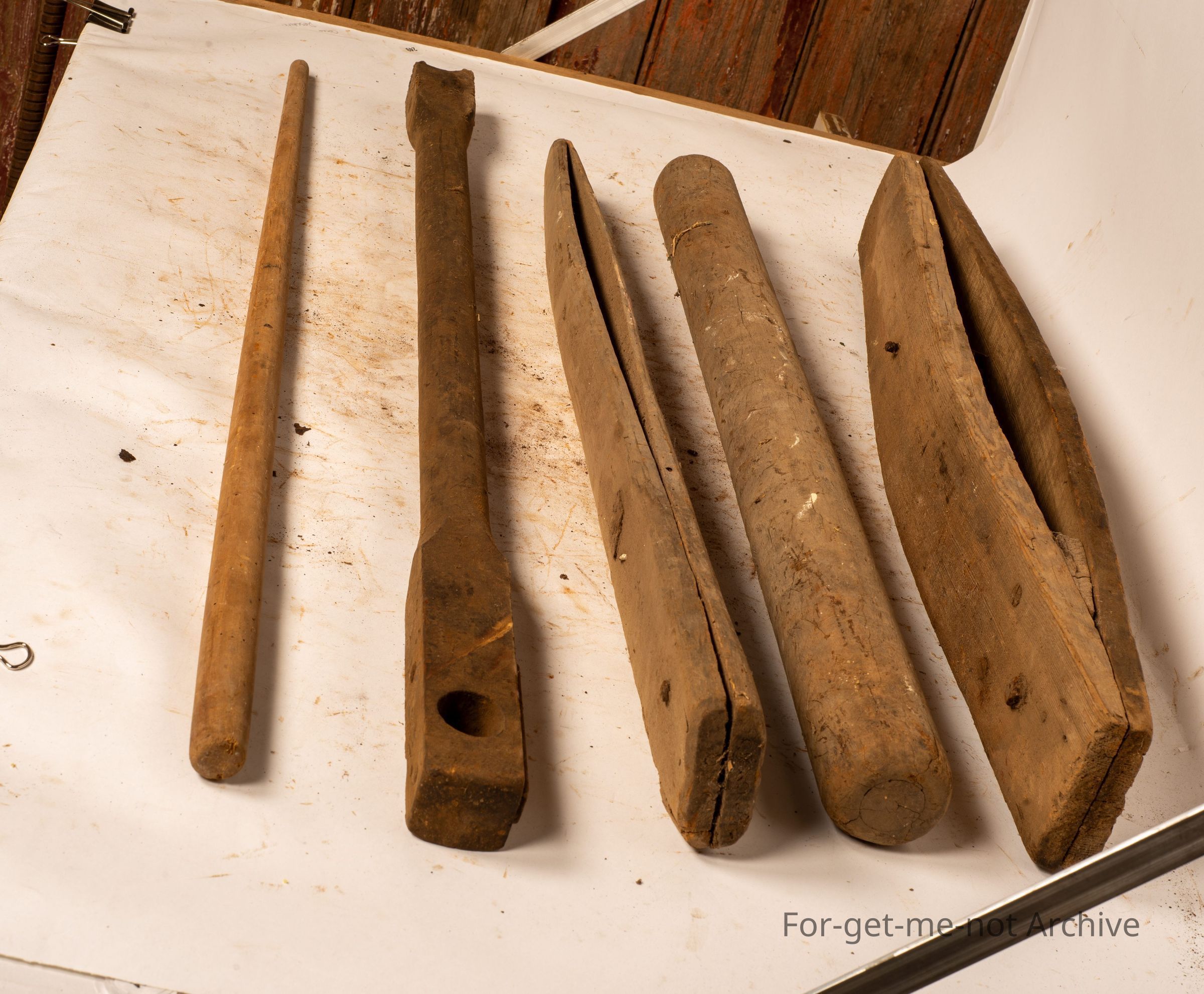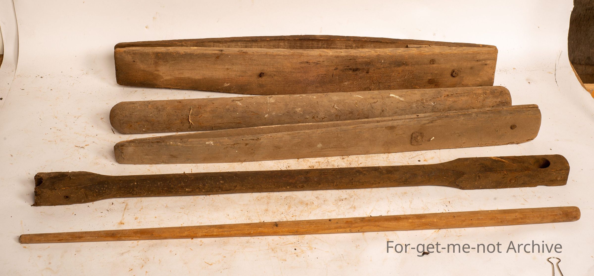 These are all wooden items of various uses. 1, a pastry maker's rolling pin, coupled from saddle of makers. A Pitman arm and a wooden Bob's cue. That the pastry rolling pin came from Brown's Bakery at Cape Clear in Victoria.Collection