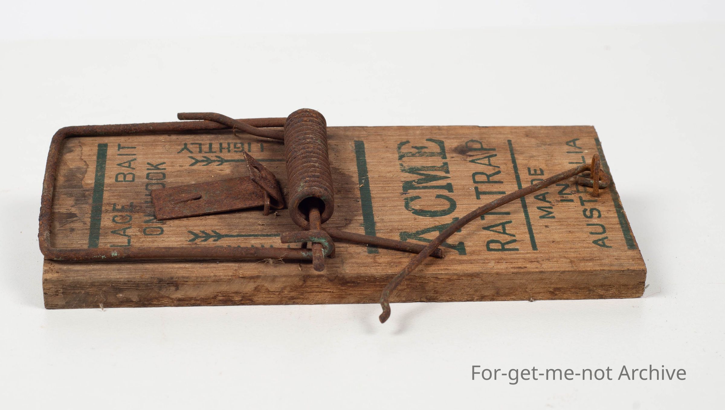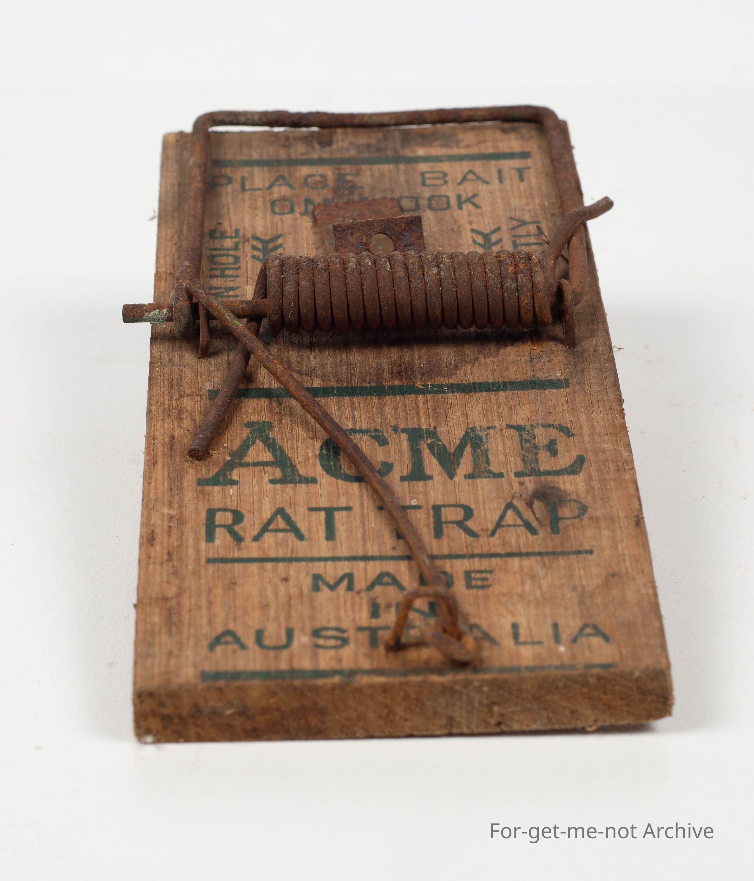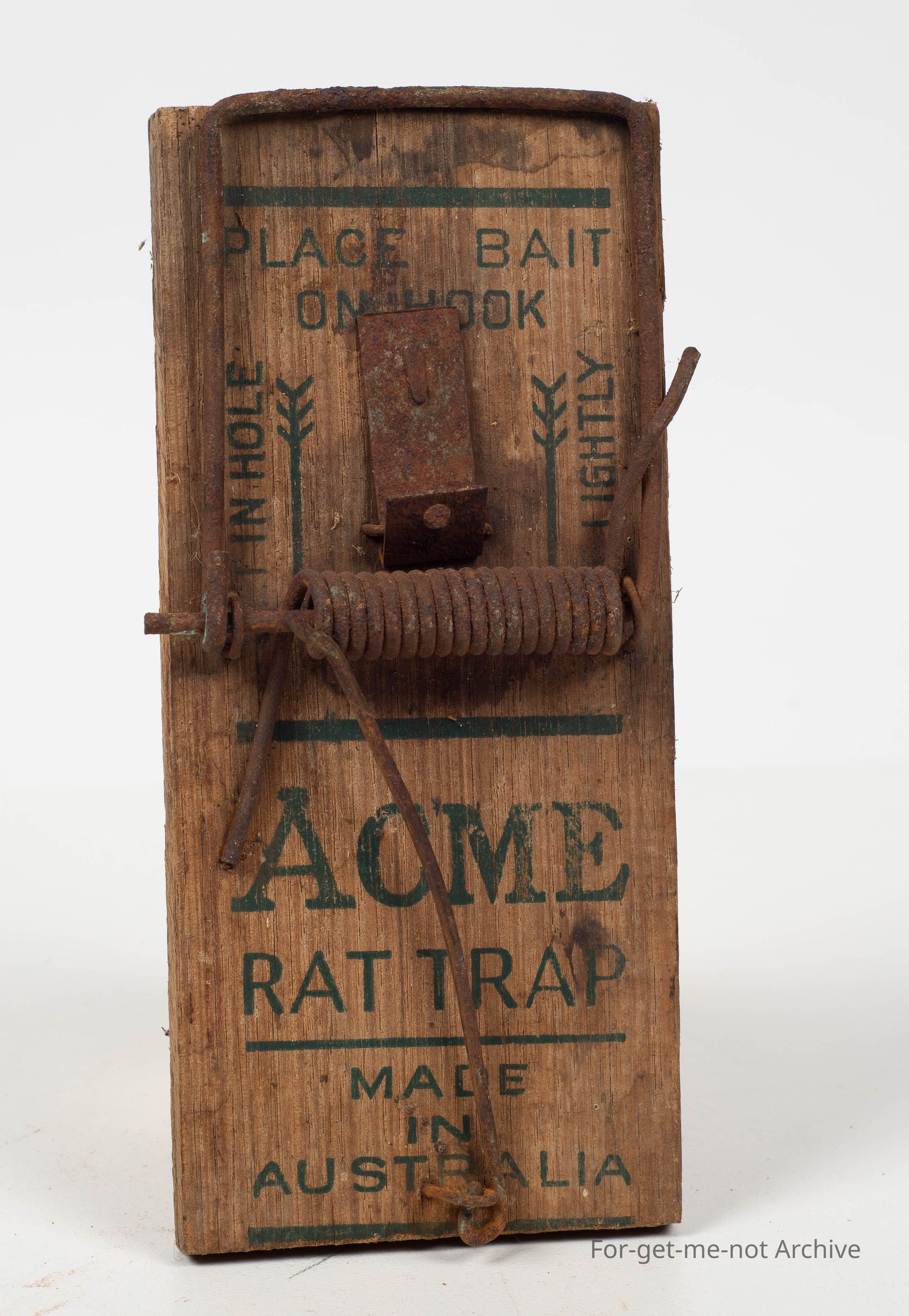 Wooden base rat trap. Stamped: 'ACME' rat trap. Made in Australia