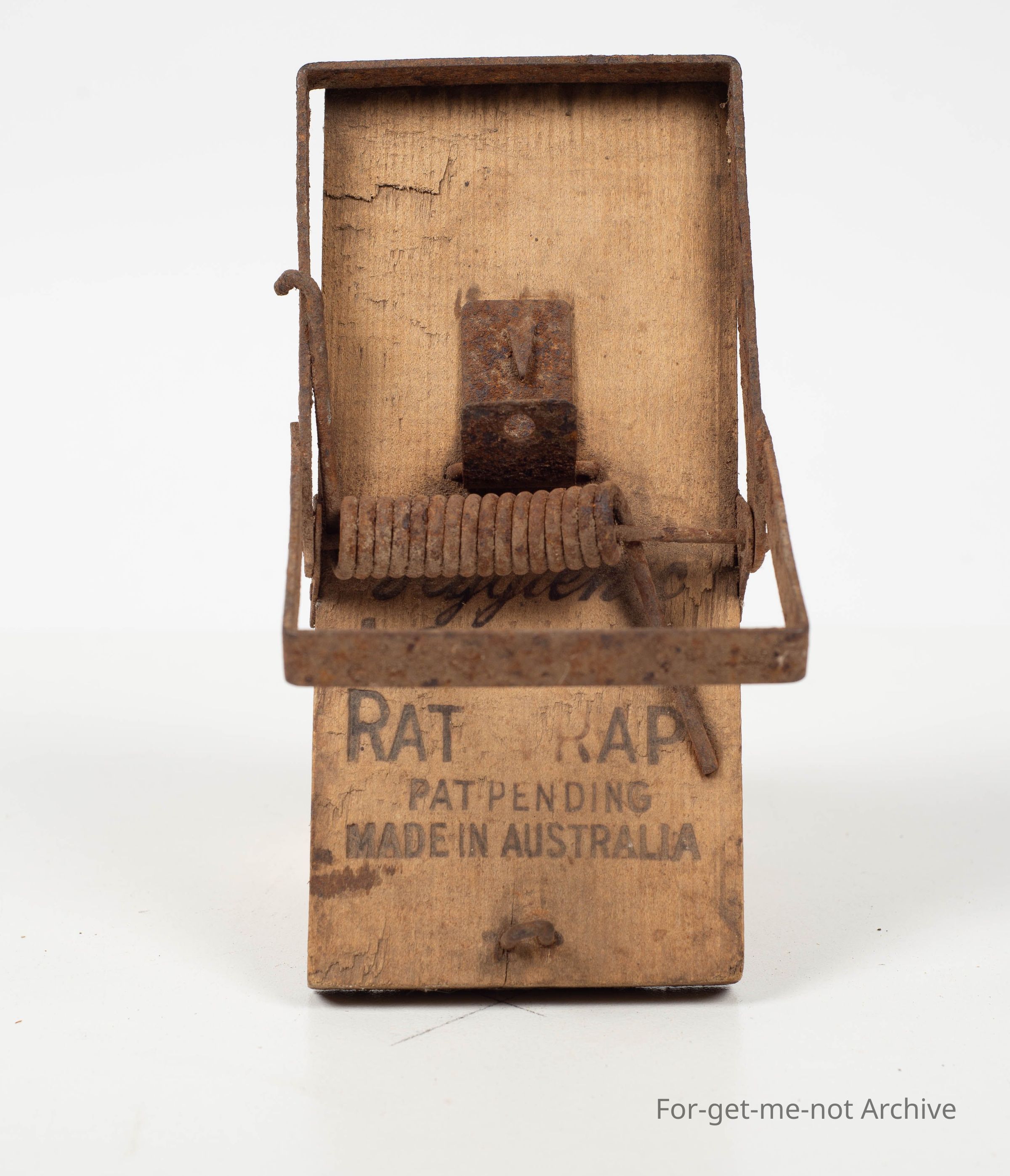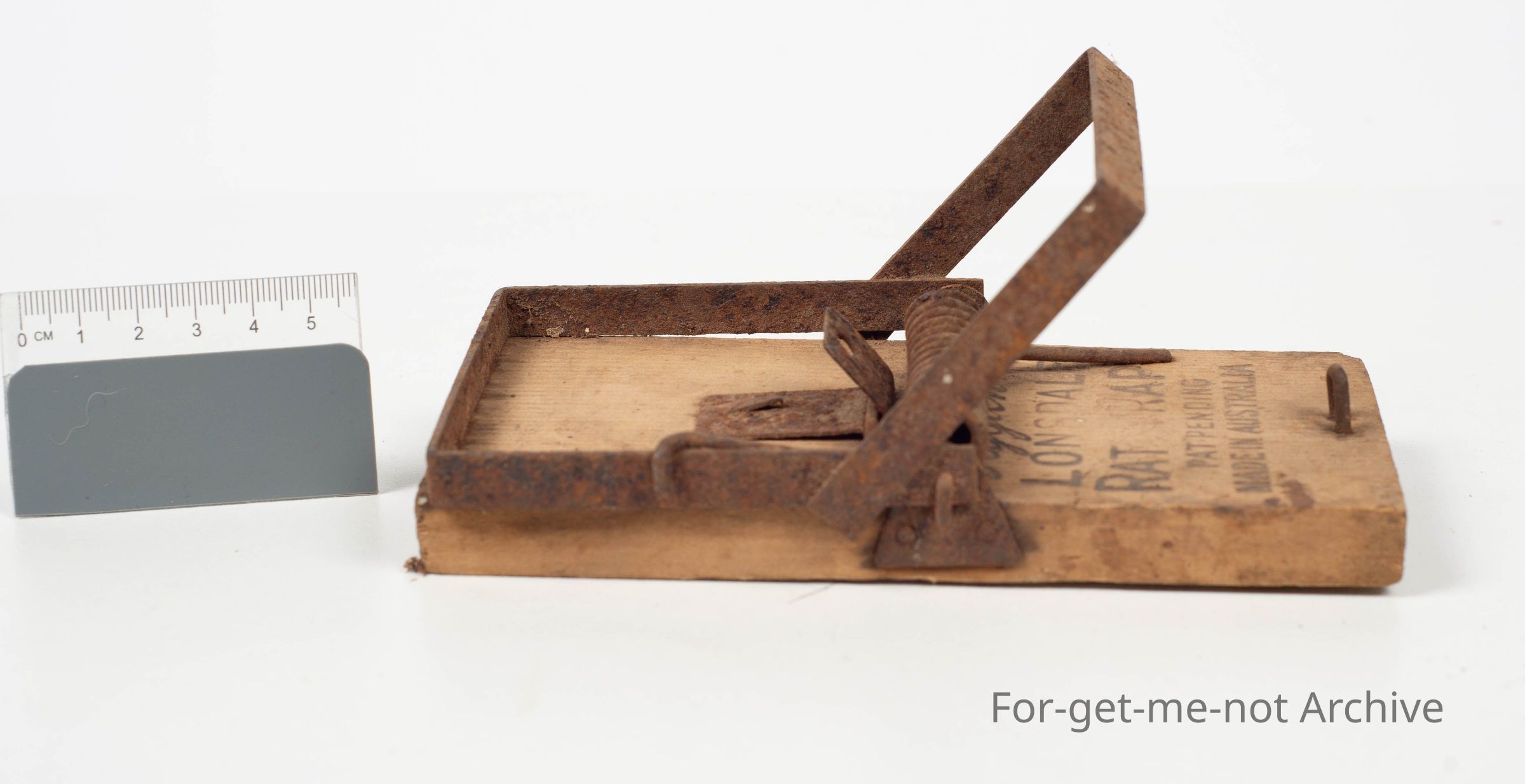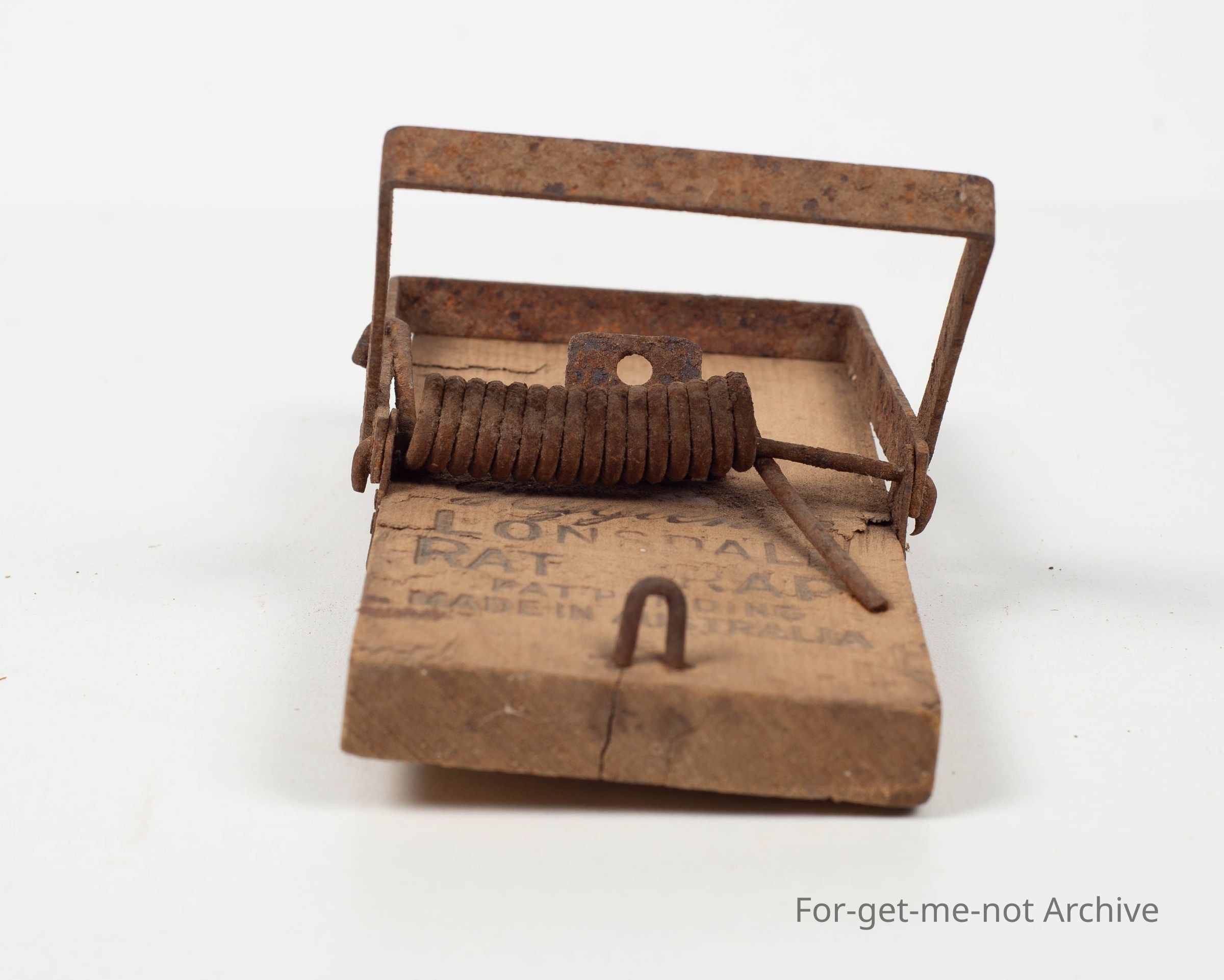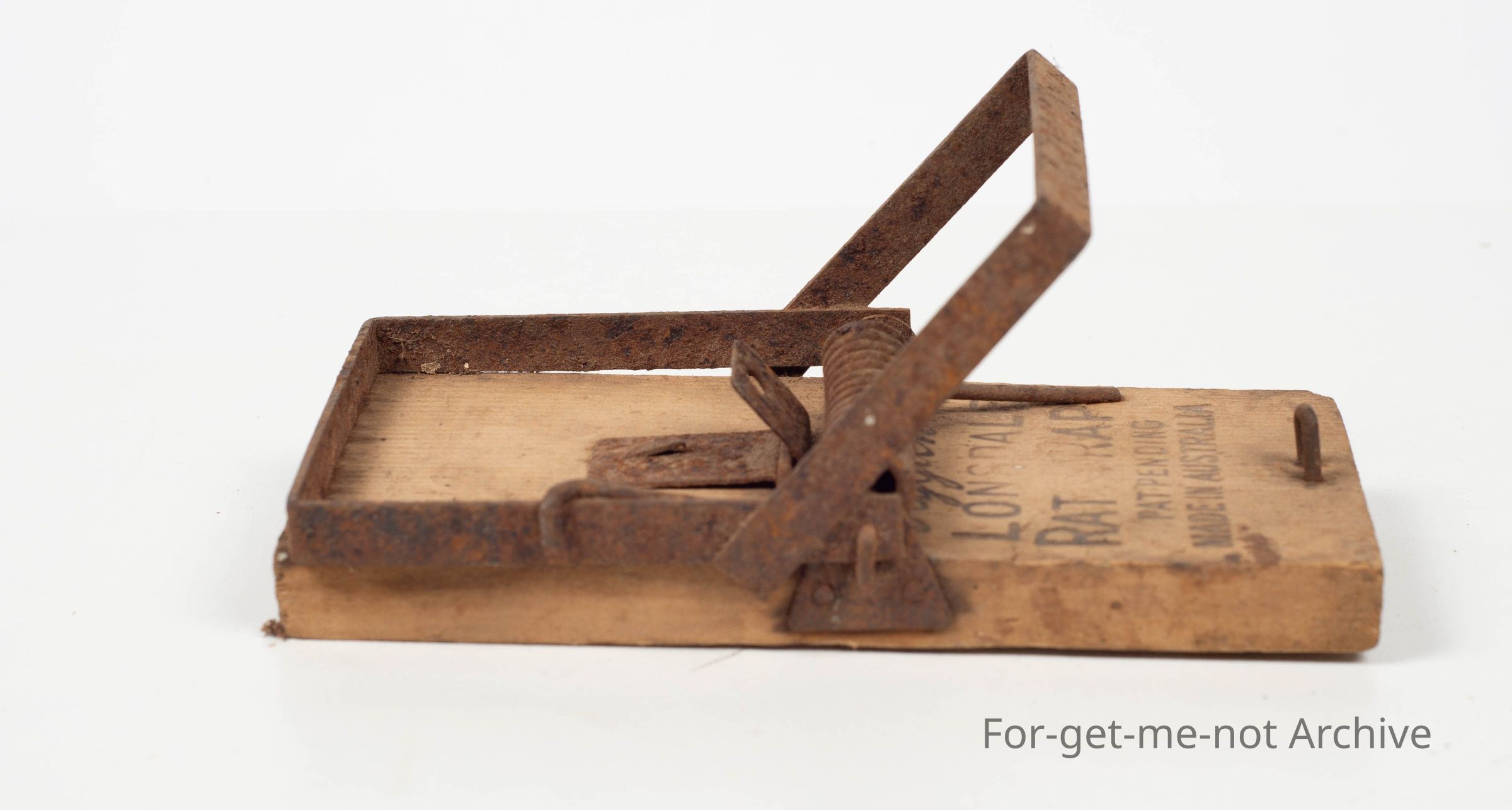 Wooden base. Stamped: 'Lonsdale Rat Trap'. Made in Australia