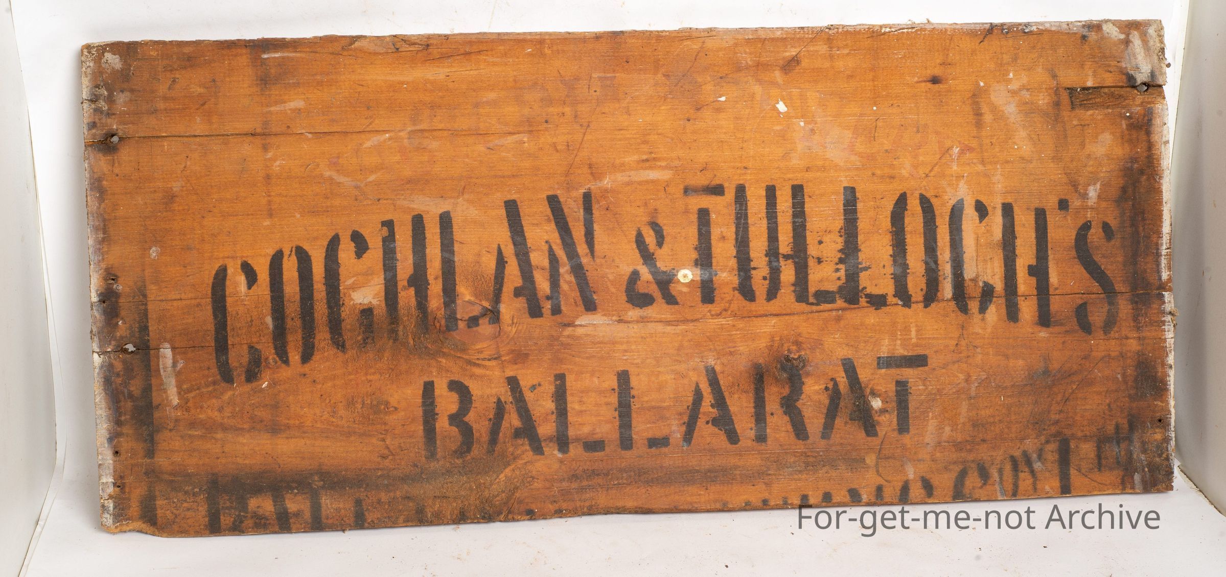 This is a wooden perhaps a wooden side out of a box. The stencilling is Coglan and Tulloch Ballarat. Lovely early piece to go with the wooden barrels