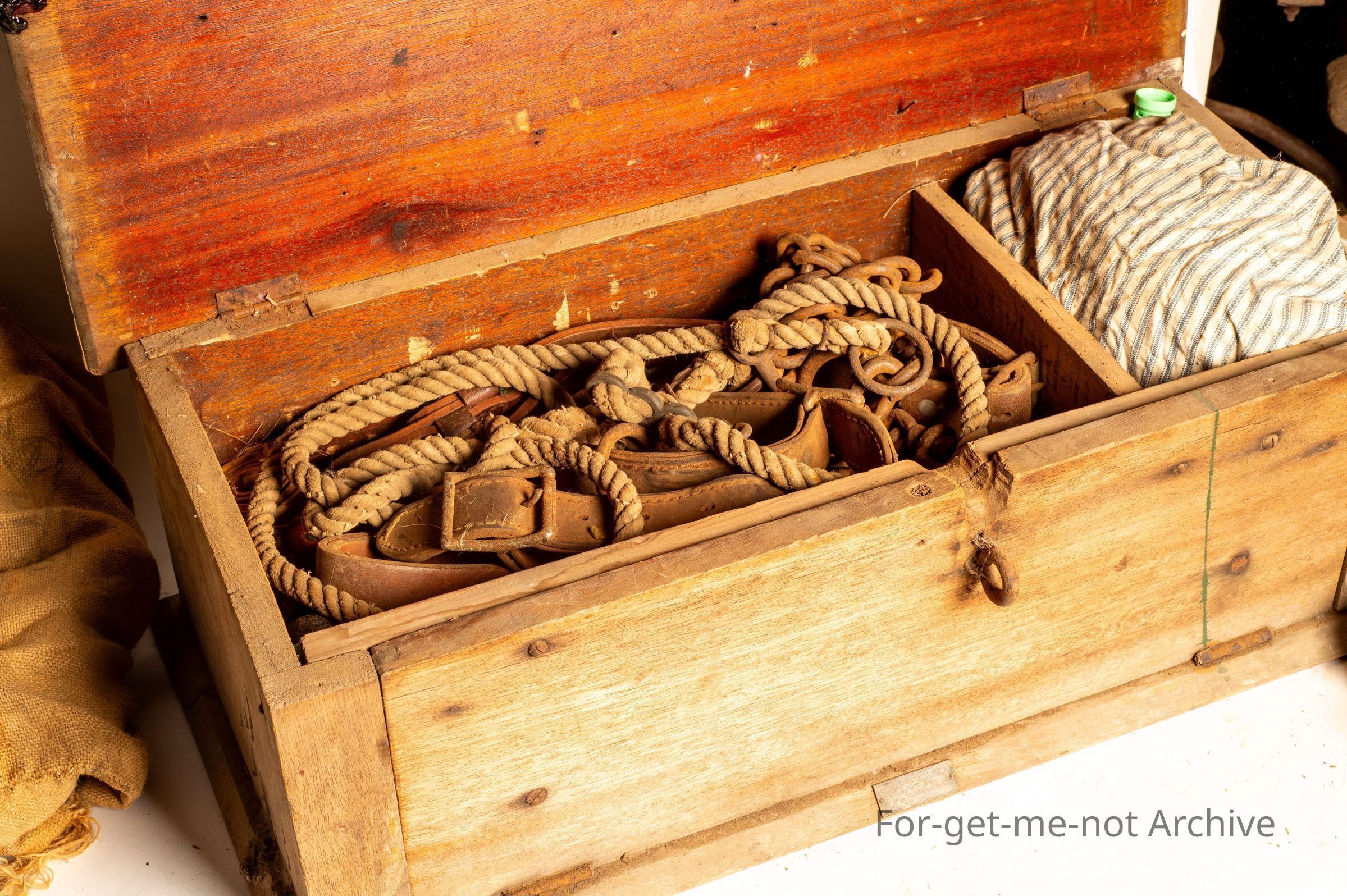 This is a wooden trunk full of, Stockman's Hobbles, chains, buckles, various bits and pieces that would have been in a Stockman's kit. In nice Australian Red Cedar box.Collection