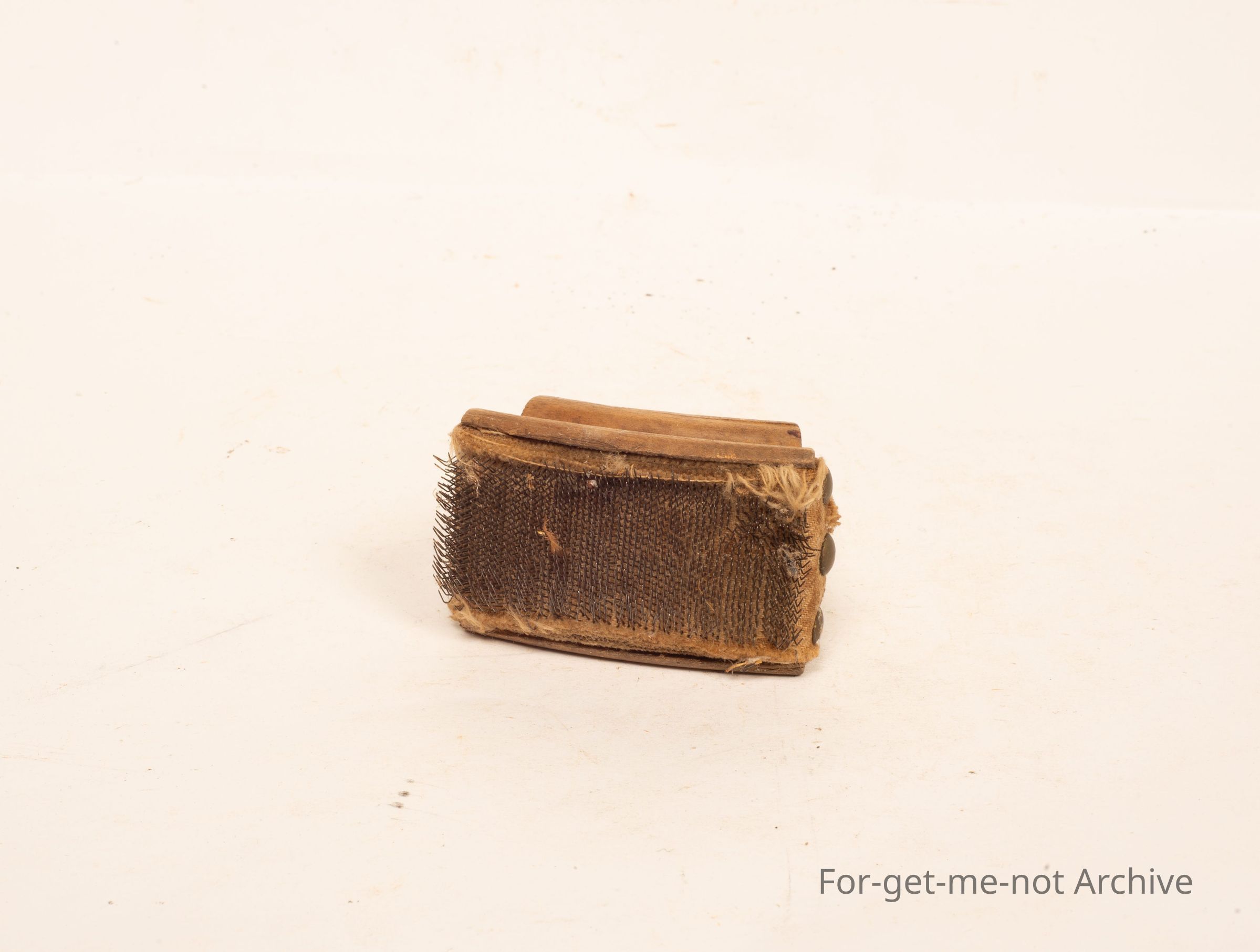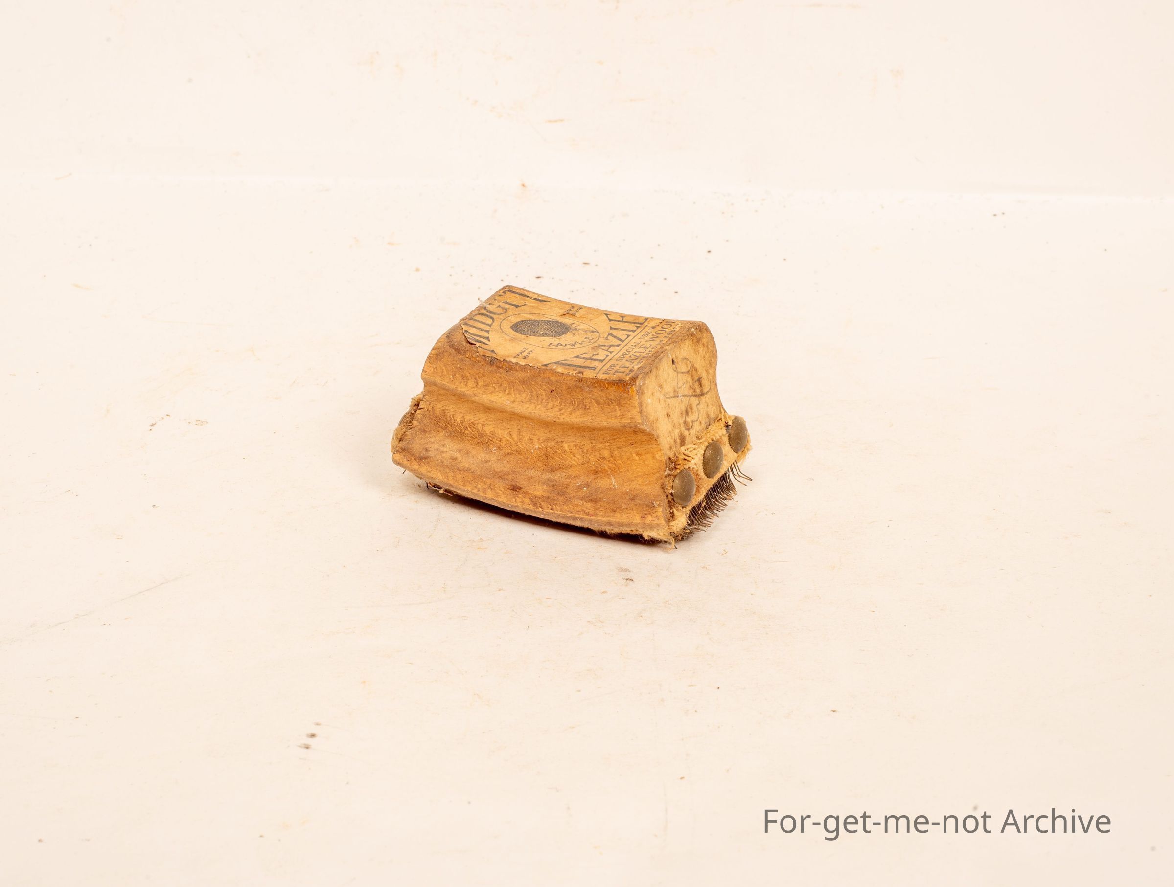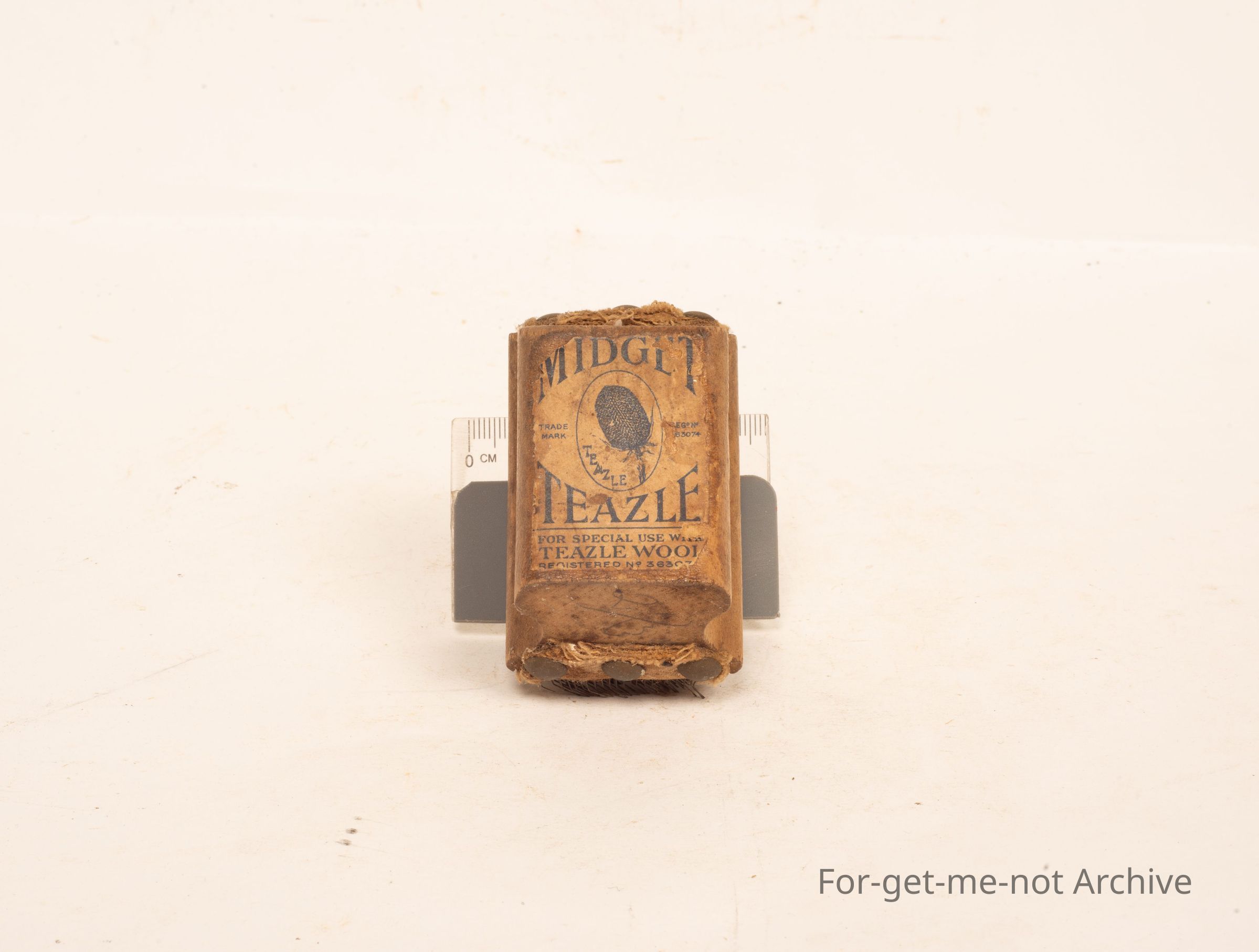 Is a small midget teasel wood base, for the teaseling of wool. An early little piece for use in the wool industry with an image of the teasel thistle on the front.