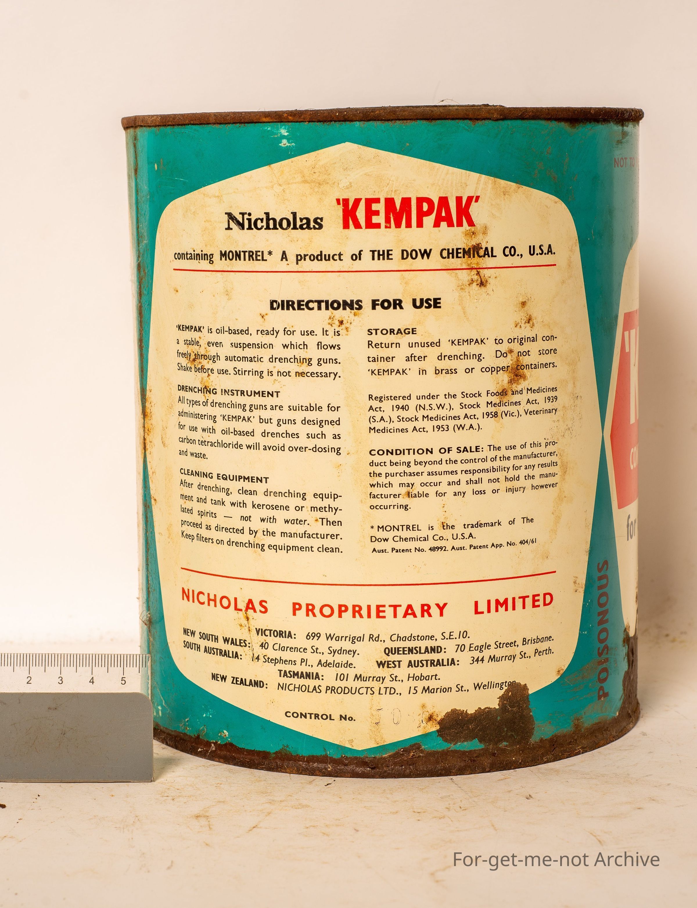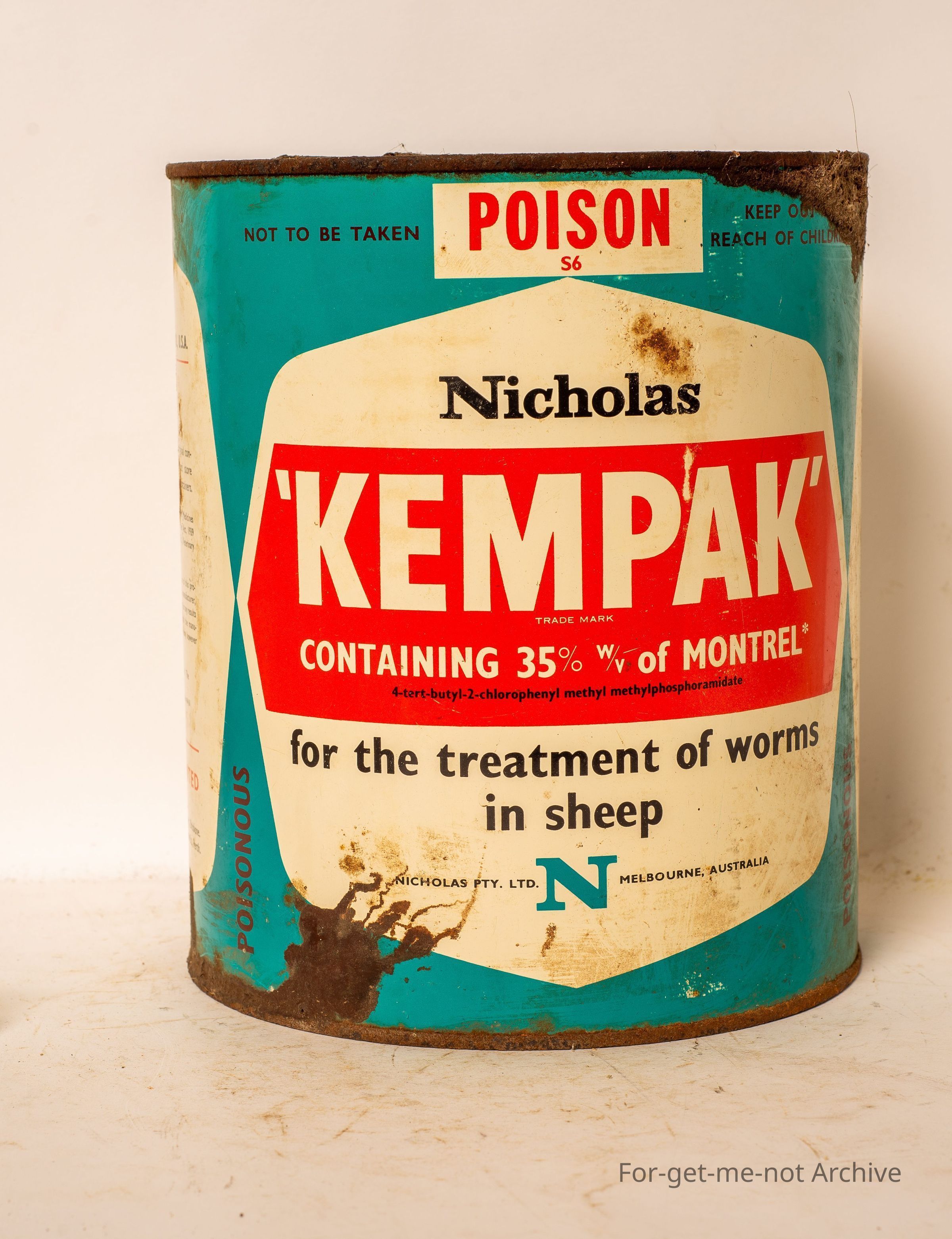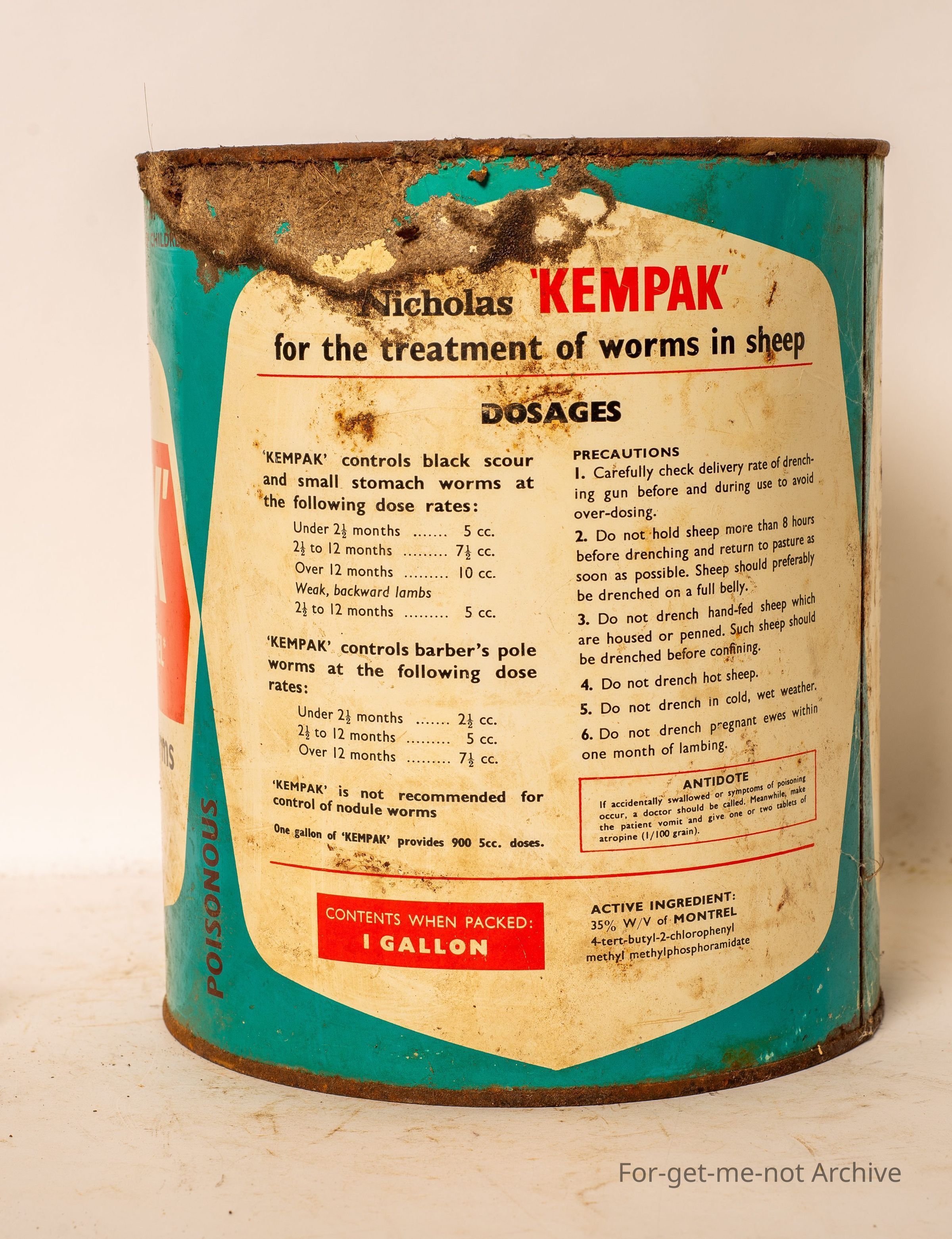 This is a tin of Kempak made by Nicholas for the treatment of worms in sheep. This is from Nicholas Melbourne. Not common to see agricultural products made by Nicholas. This is a 1 gallon tin.Collection