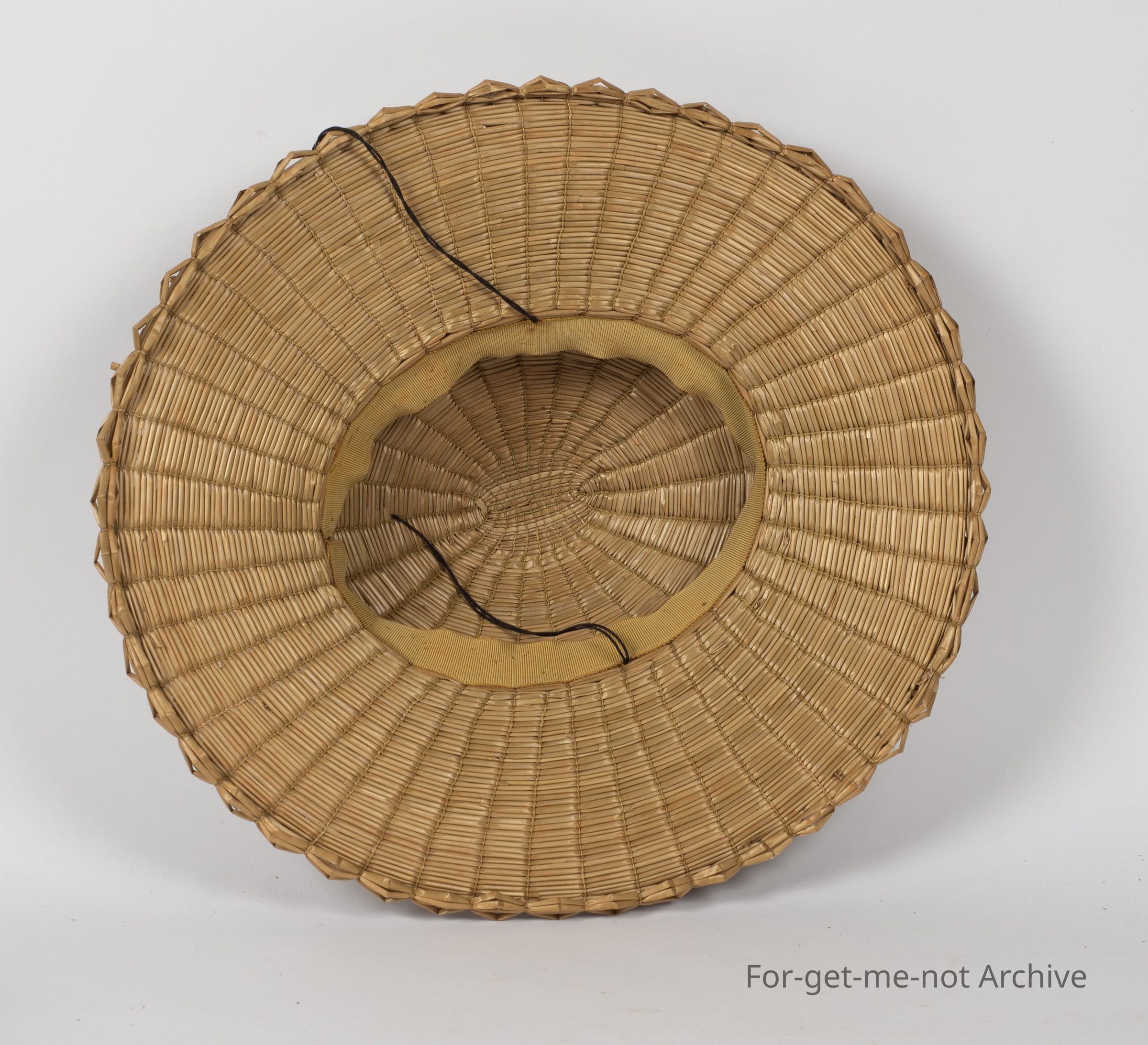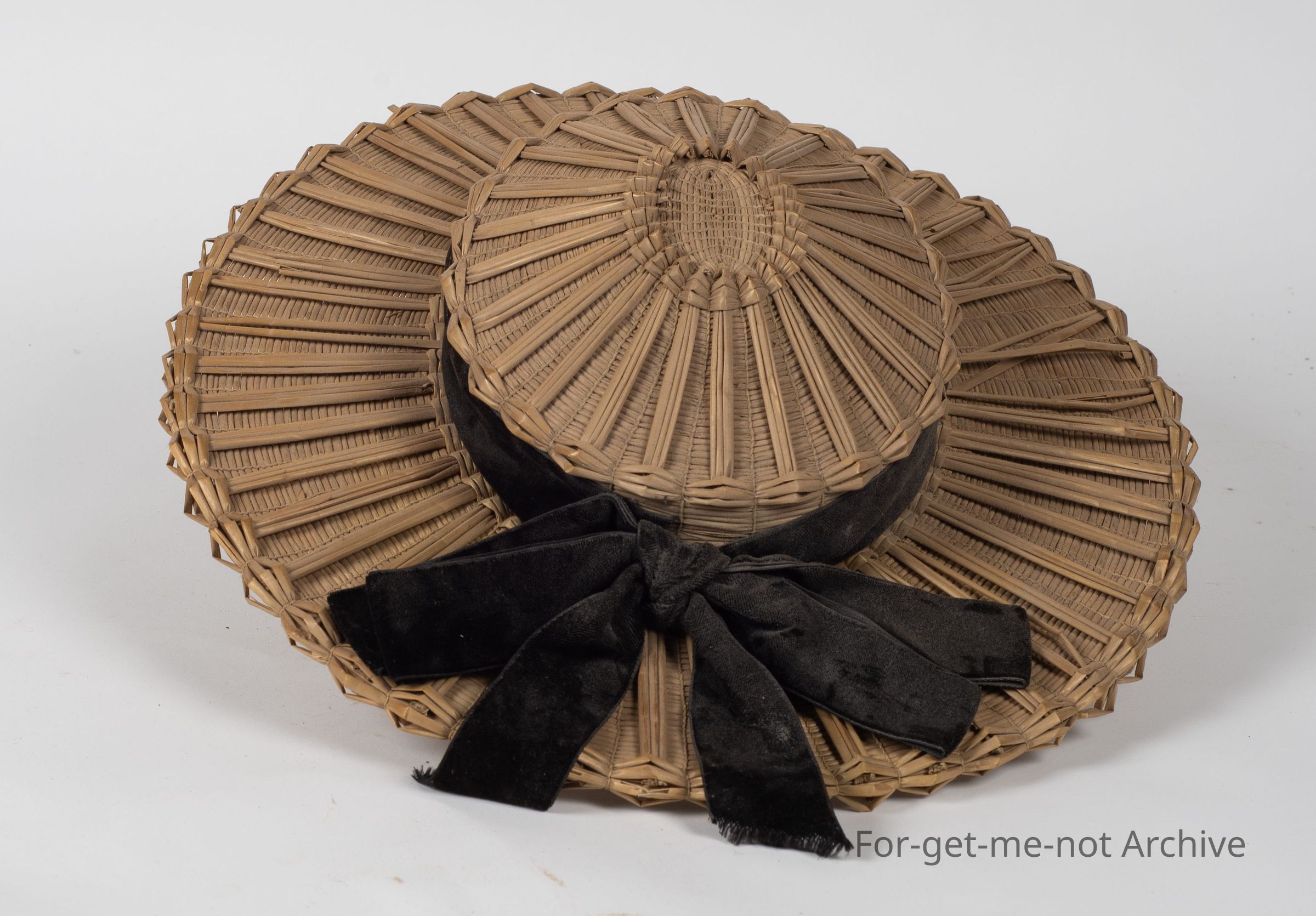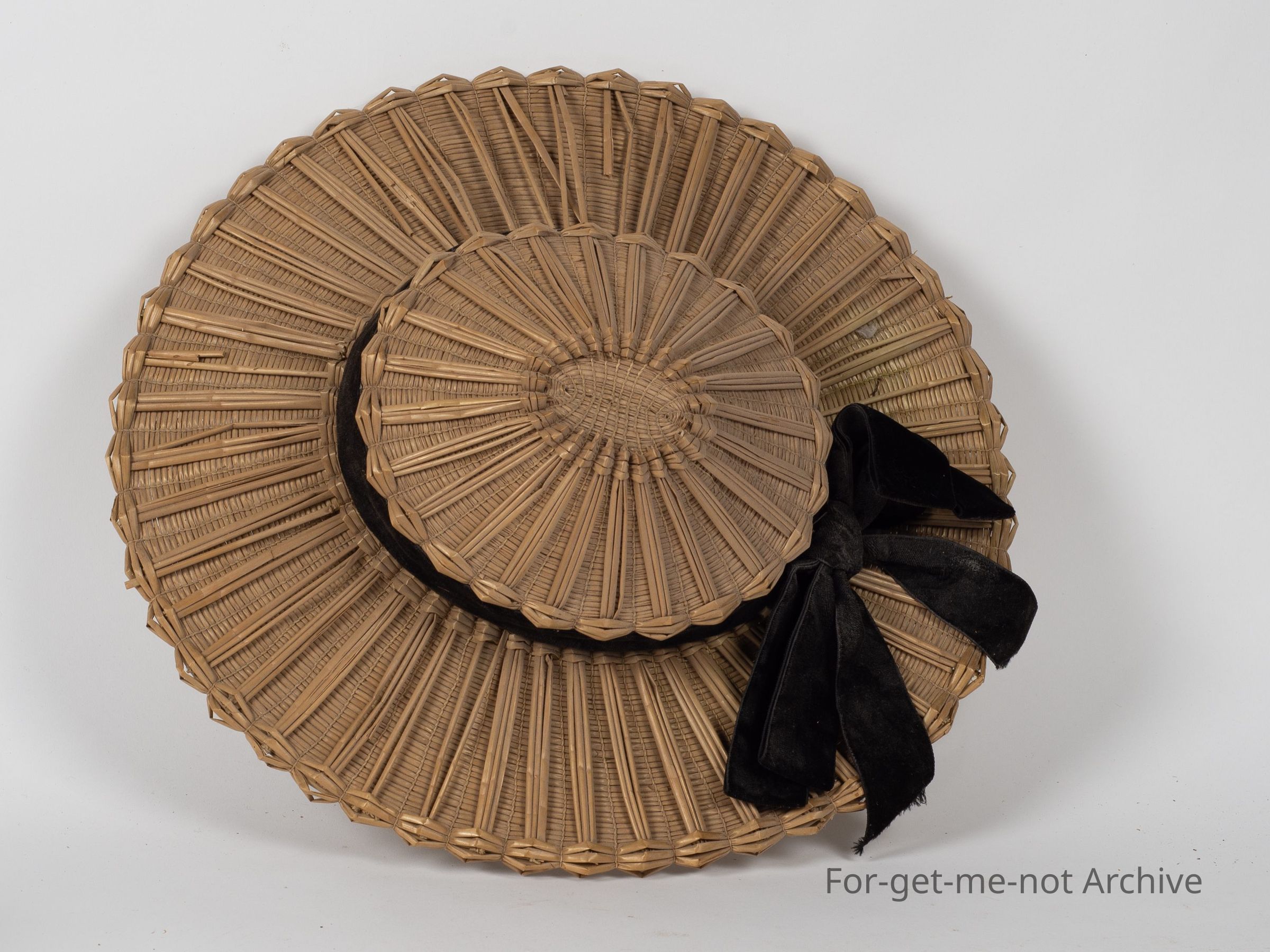 Woven ladies hat, black ribbon, made from wheat straw