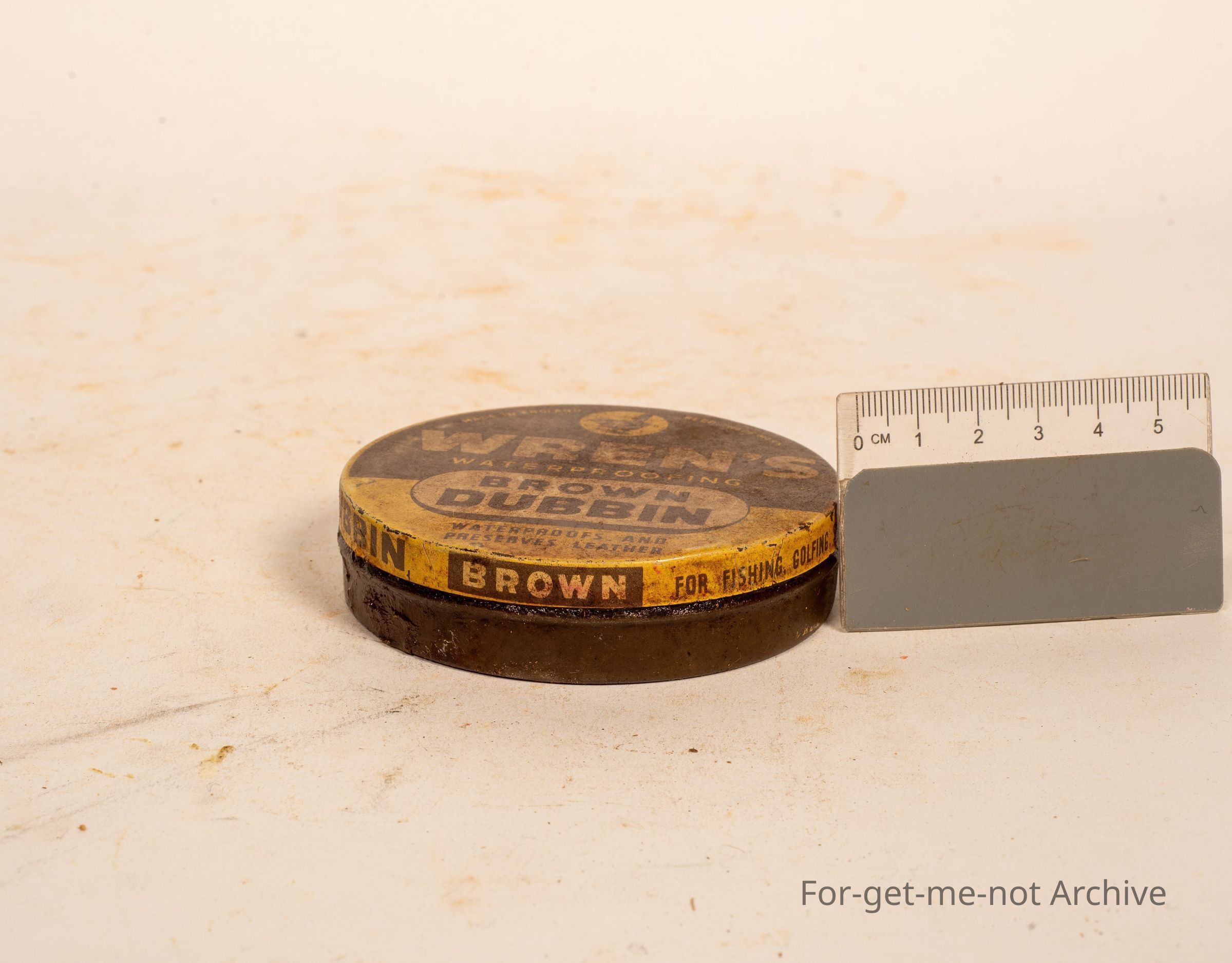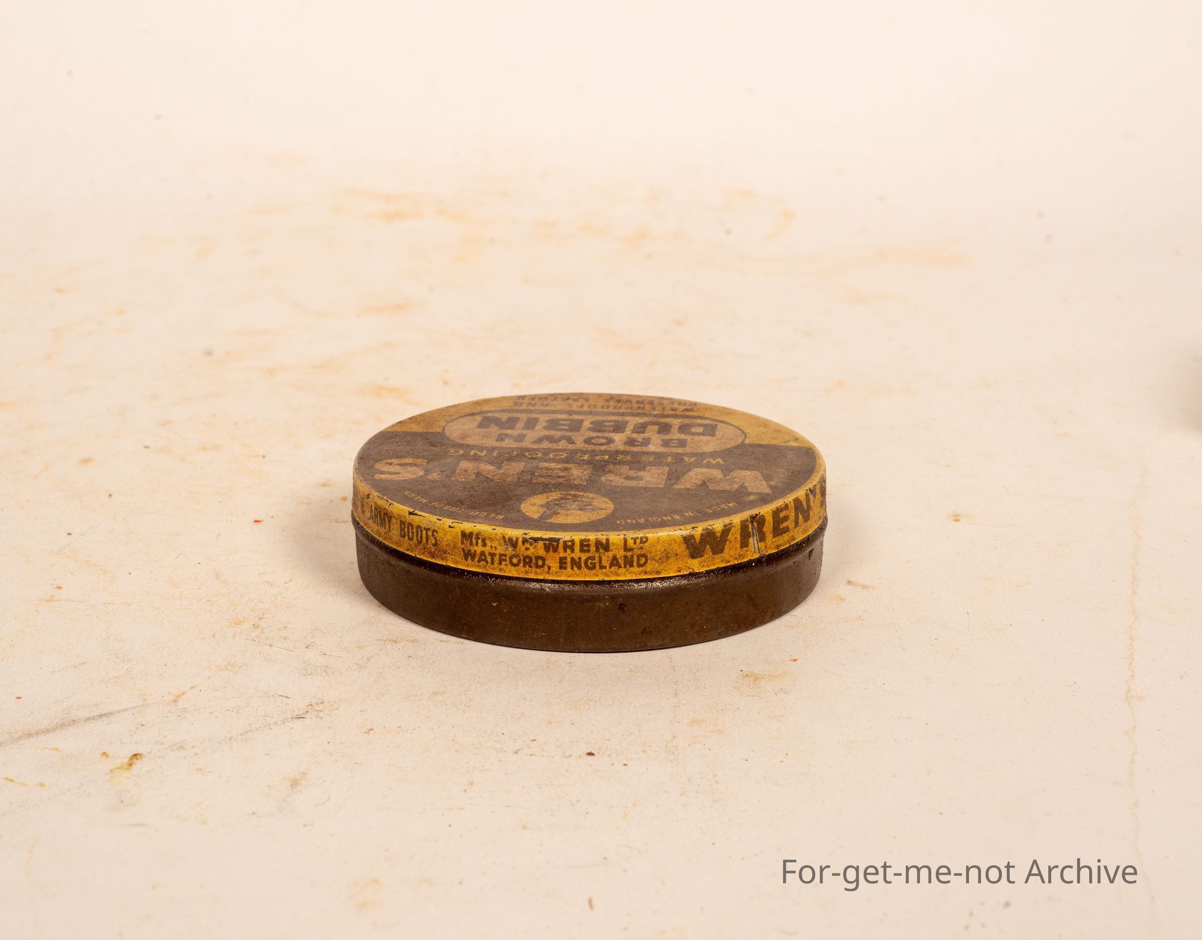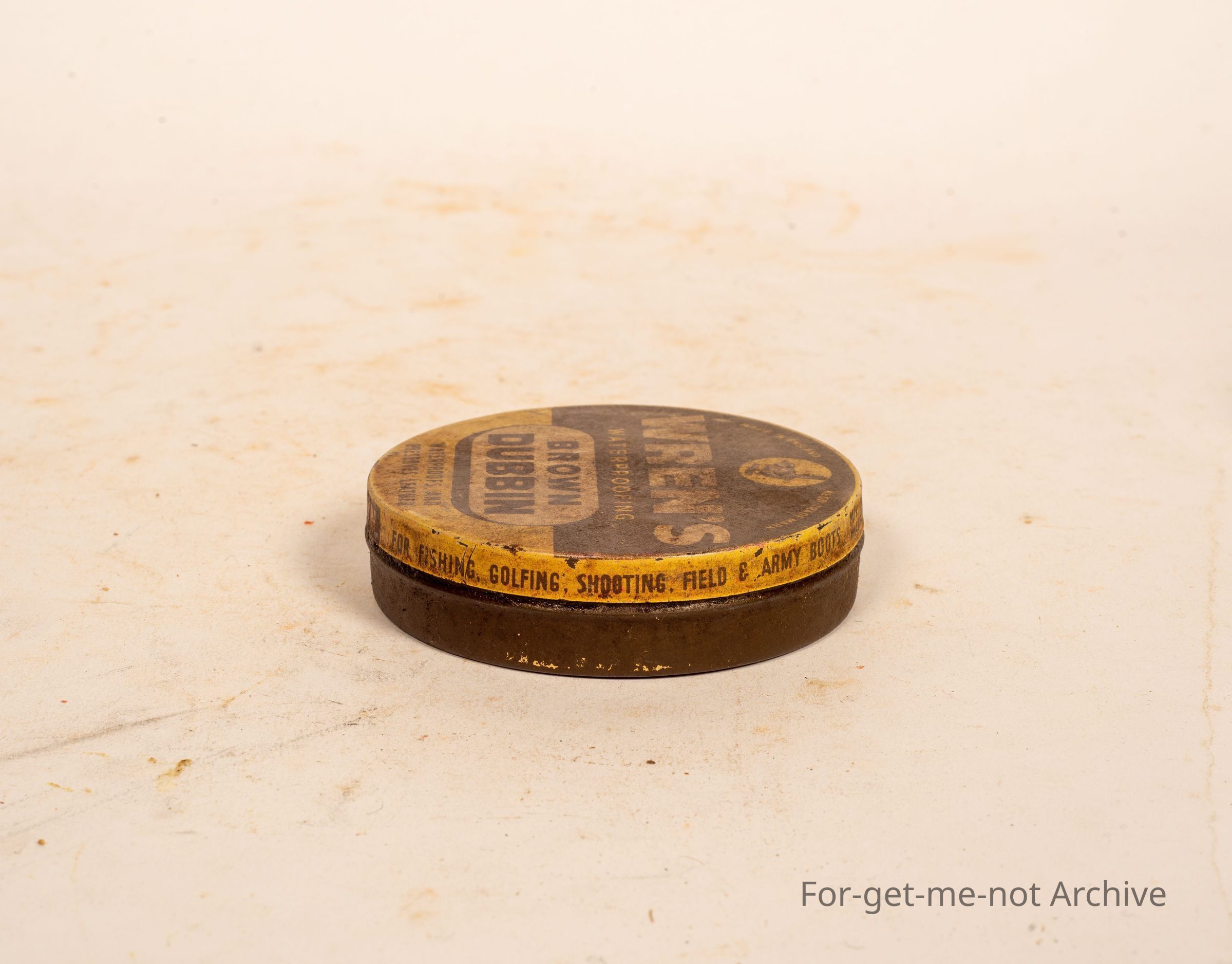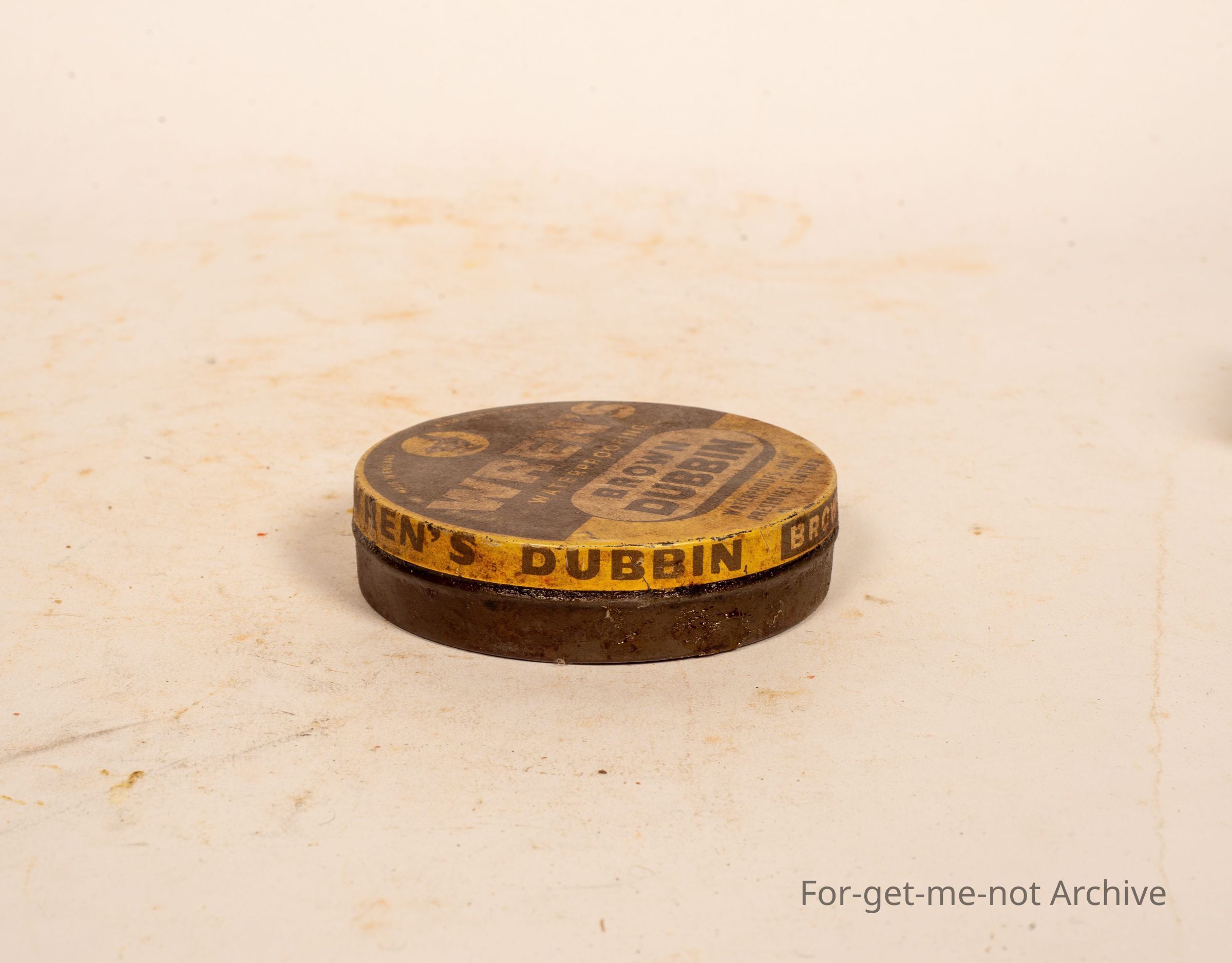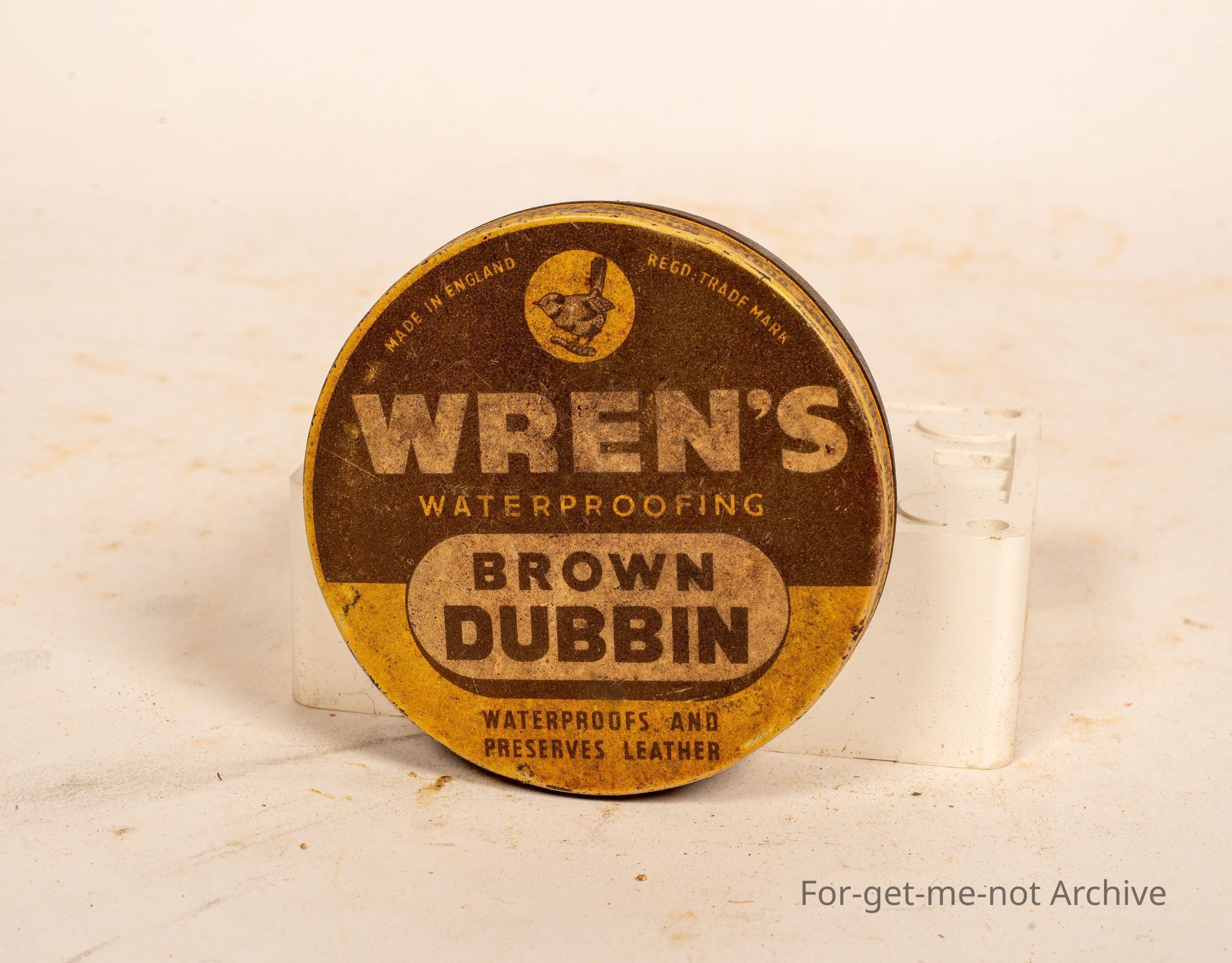 A tin of Wrens waterproofing Brown Dubbin. This is an English tin with a image of a Wren on the top.