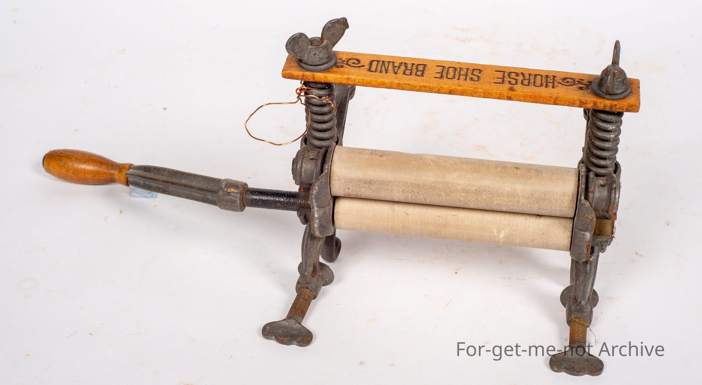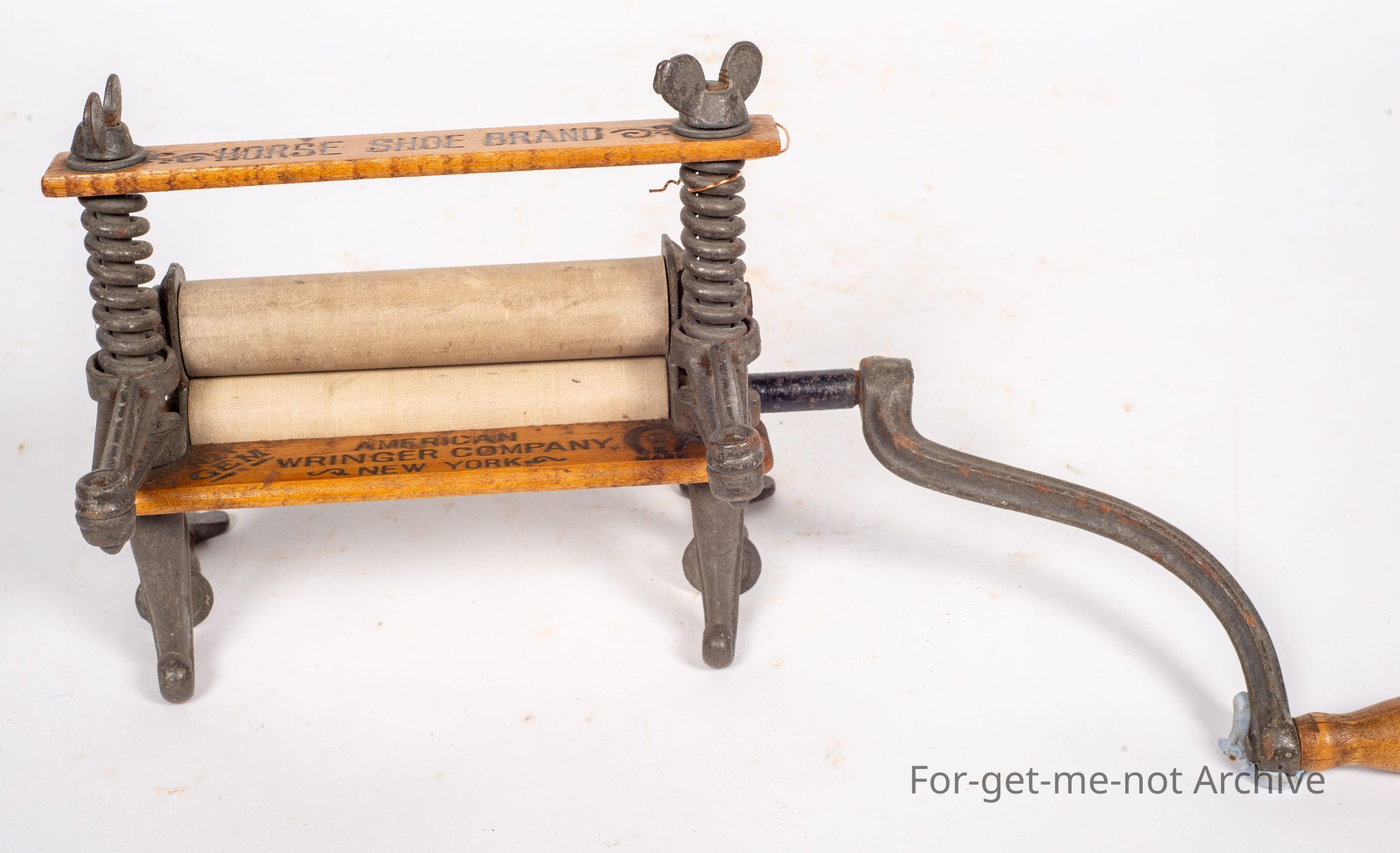Is a salesman sample model of a, a wringer for laundry. Got rubber rollers, wood formation, a lot of advertising printed into the wood for Horseshoe Brand Winger. Beautiful piece in superb condition for one of these. This model would have clamped onto the middle part of the concrete trough.Collection