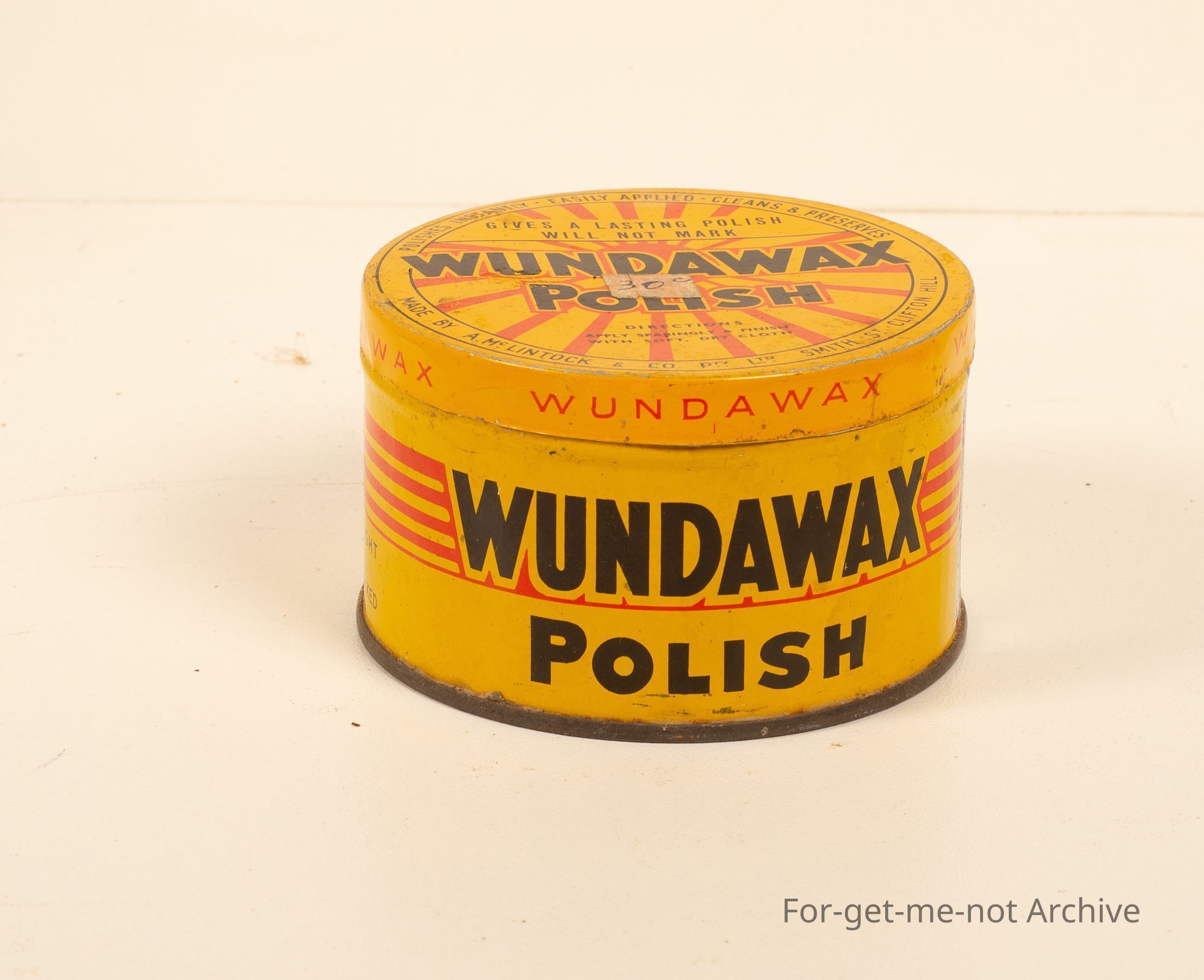 A tin of Wundawax polish, good for all hard surfaces domestic, Made by Lintock and Co. Smith st Clifton Hill