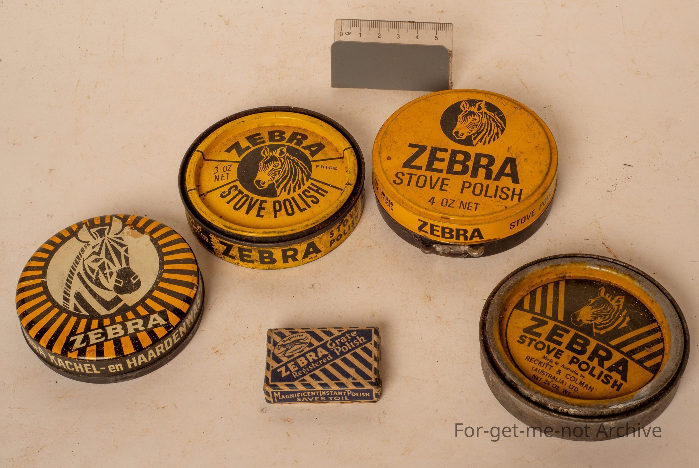 This is a selection of, tins of Zebra stove polish. All different images. The first one, bit unusual just with the Zebra, 4 ounces. 2nd 1, the Zebra stove polish, 3 ounce. Number 3, zebra stove polish by Rickett and Coleman, 2 and a quarter ounce. The third one, a very attractive tin, possibly European, very artistically done, different to the others, but still, Zebra Stove Polish and a small block, in a cardboard box of Zebra Great Polish. Wonderful little group of 5Collection