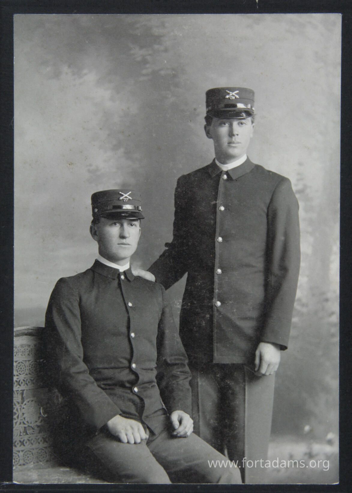 ¾ figure Portrait 2 males; 1 standing and 1 sitting, both in uniform wearing hats