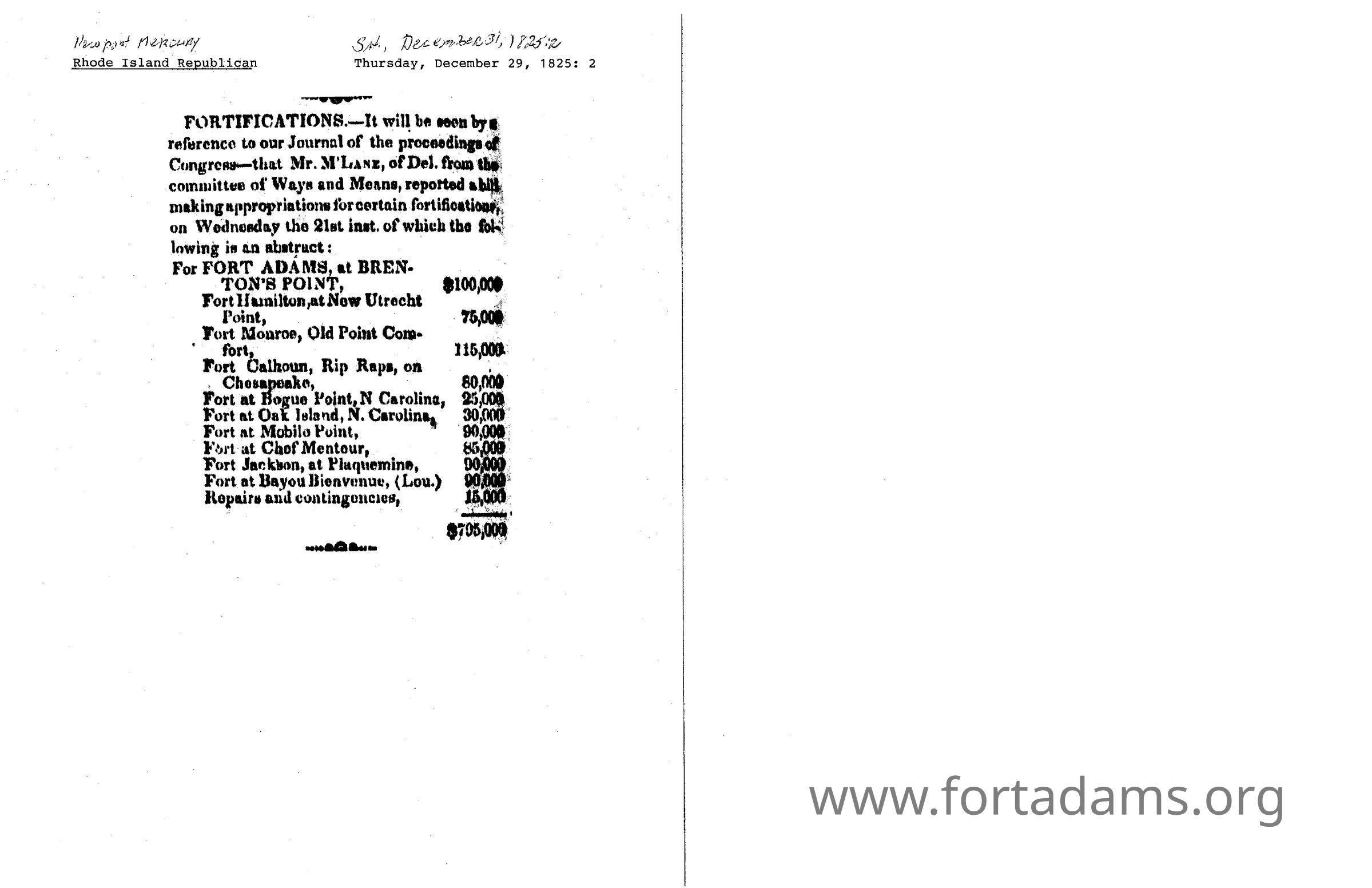 1825 RI Republican Fortress Appropriations