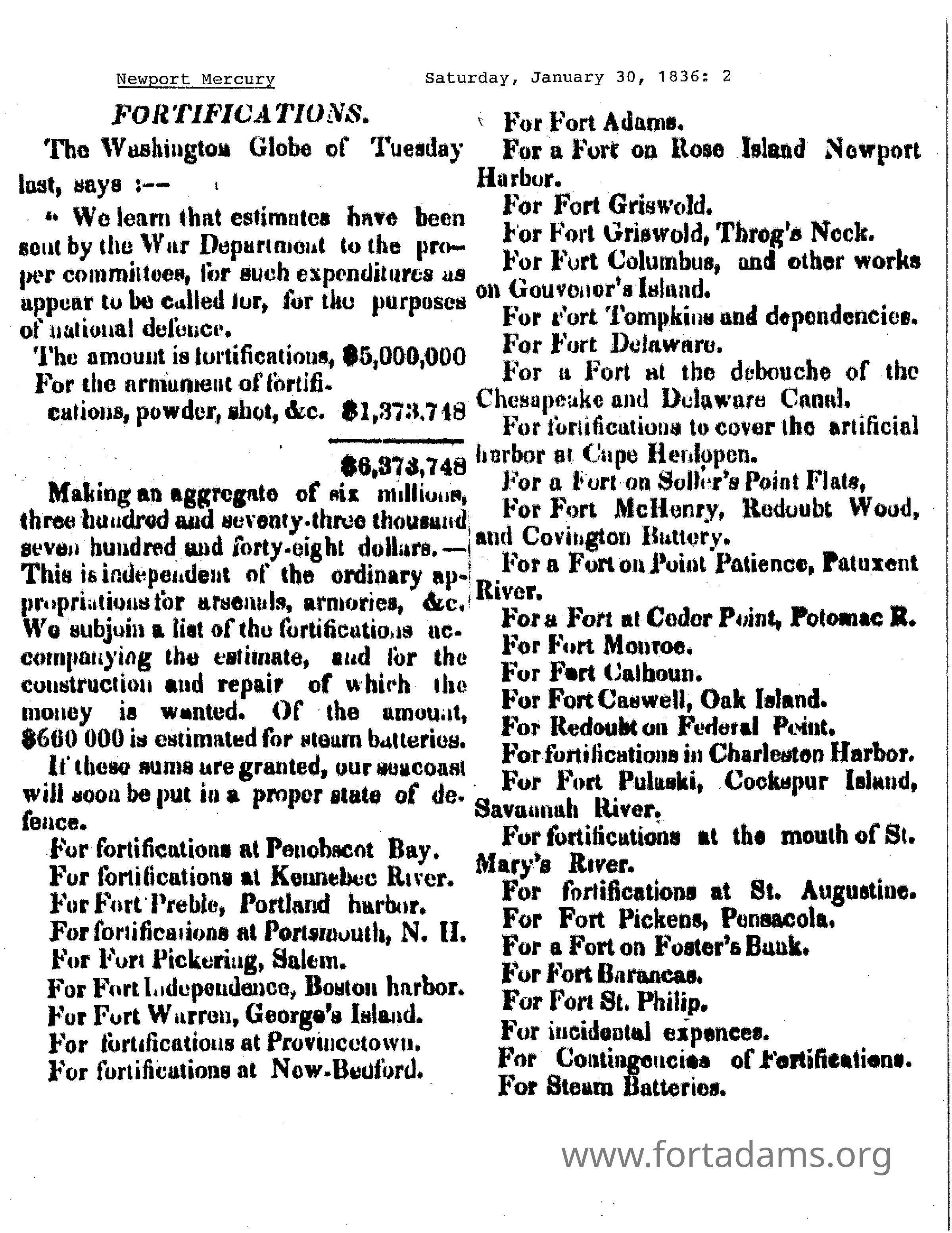 1836 NM Proposed Appropriations for Fortifications