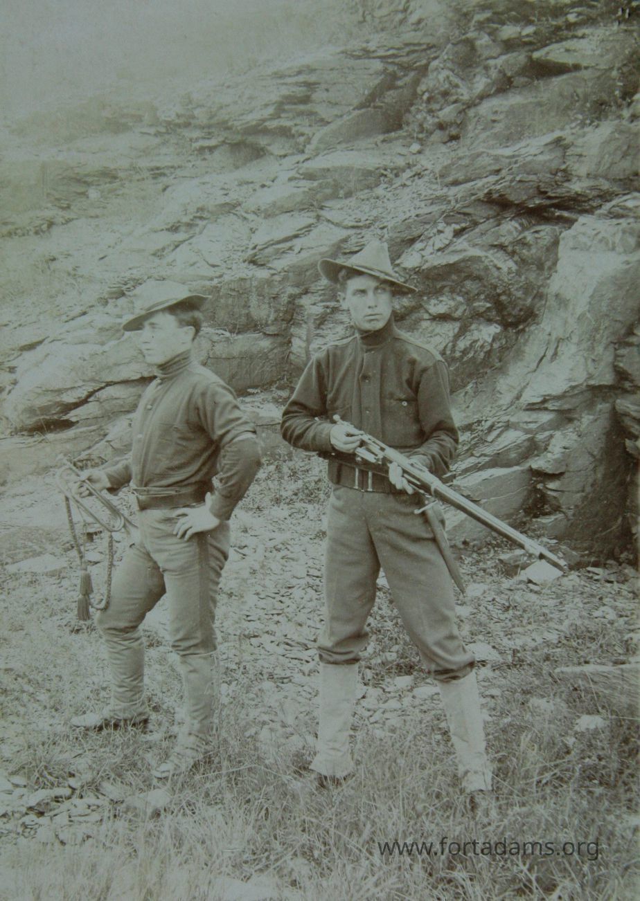 2 men in uniform, one with bugle, one with rifle
