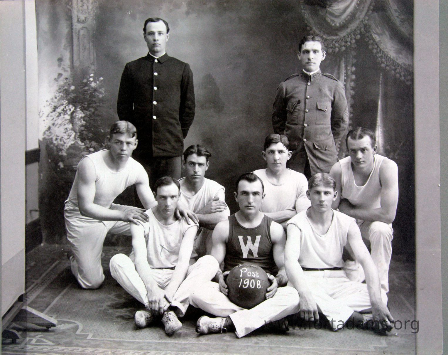 7 men in group basket ball team portrait "Post 1908"