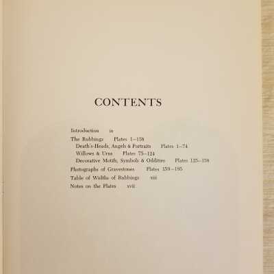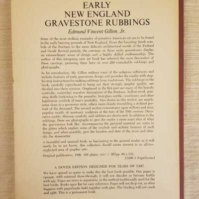This book is not only about gravestone rubbings, but also about the early stone carvers who had the skills to decorate these gravestones. These rubbings of the carvings include faces of angels, portraits of the deceased, urns, willow trees, and other decorative motifs.