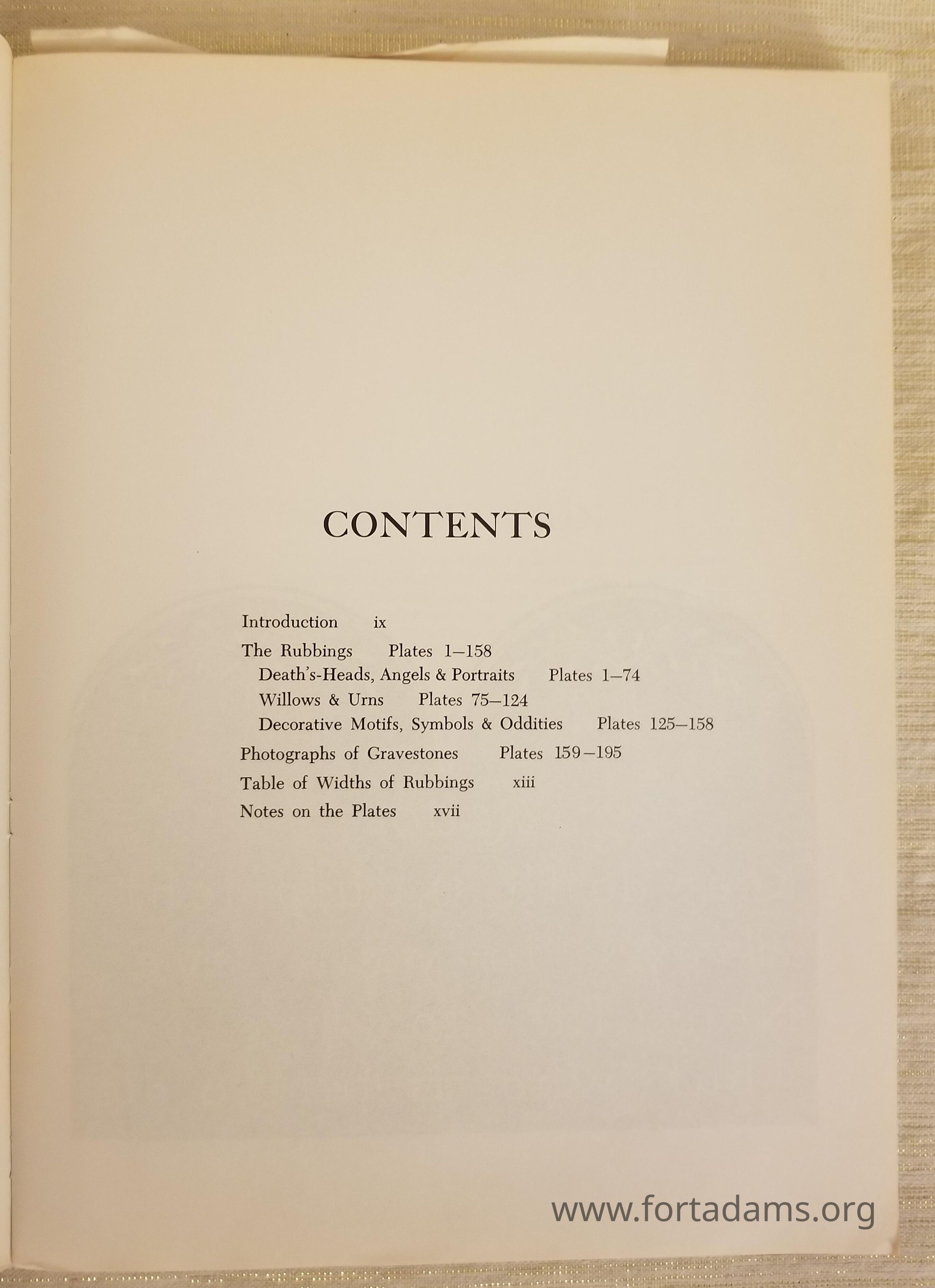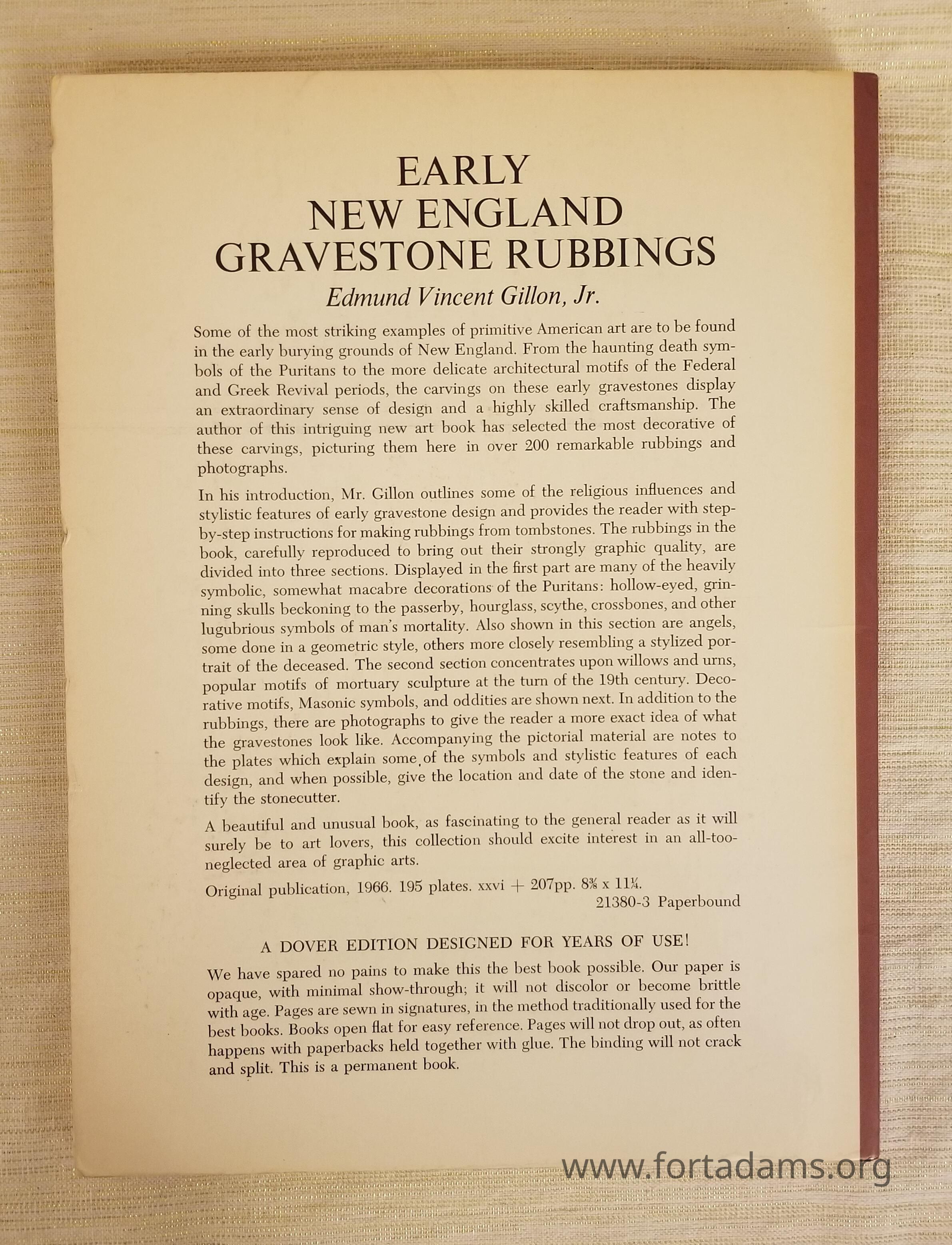 This book is not only about gravestone rubbings, but also about the early stone carvers who had the skills to decorate these gravestones. These rubbings of the carvings include faces of angels, portraits of the deceased, urns, willow trees, and other decorative motifs.