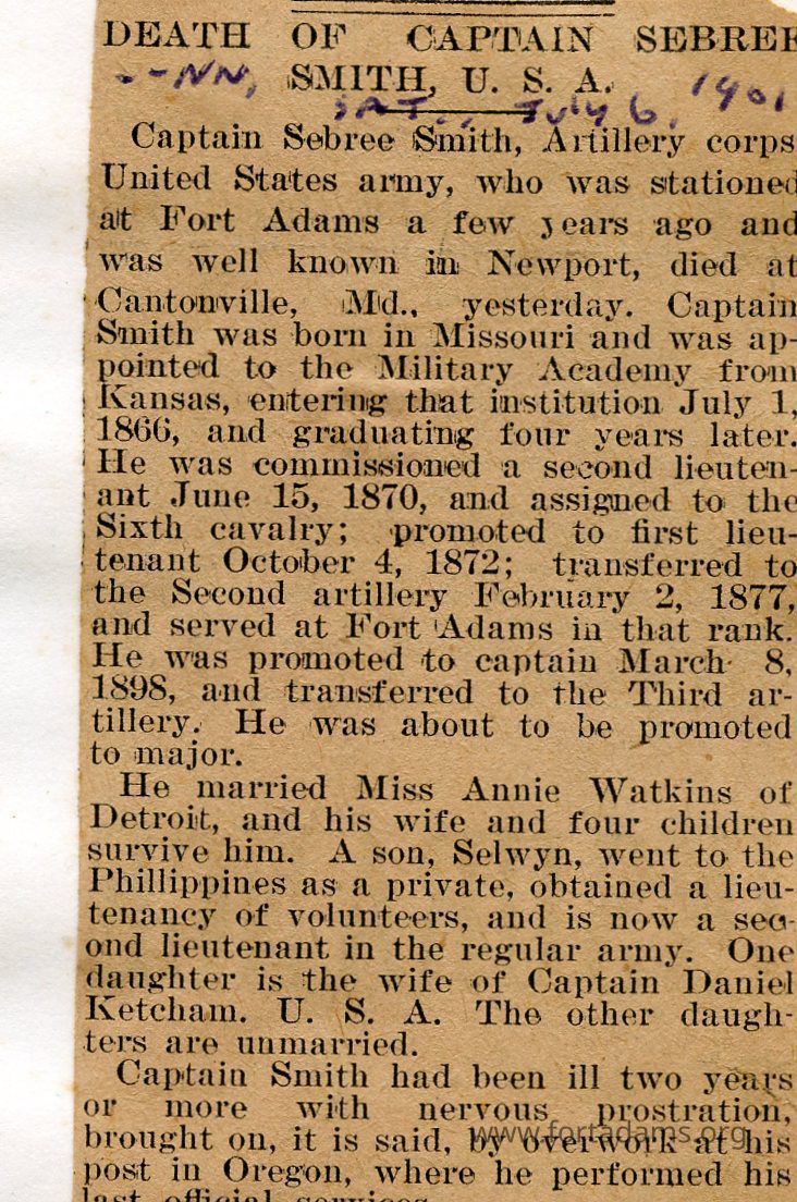 Captain Sebrer Smith was stationed at Fort Adams a few years back. He was well known in Newport. Died at Cantonville Md. yesterday Captain Smith was poor in Missouri and was pointed to the Military Academy from Kansas. After graduating four years later in 1870.