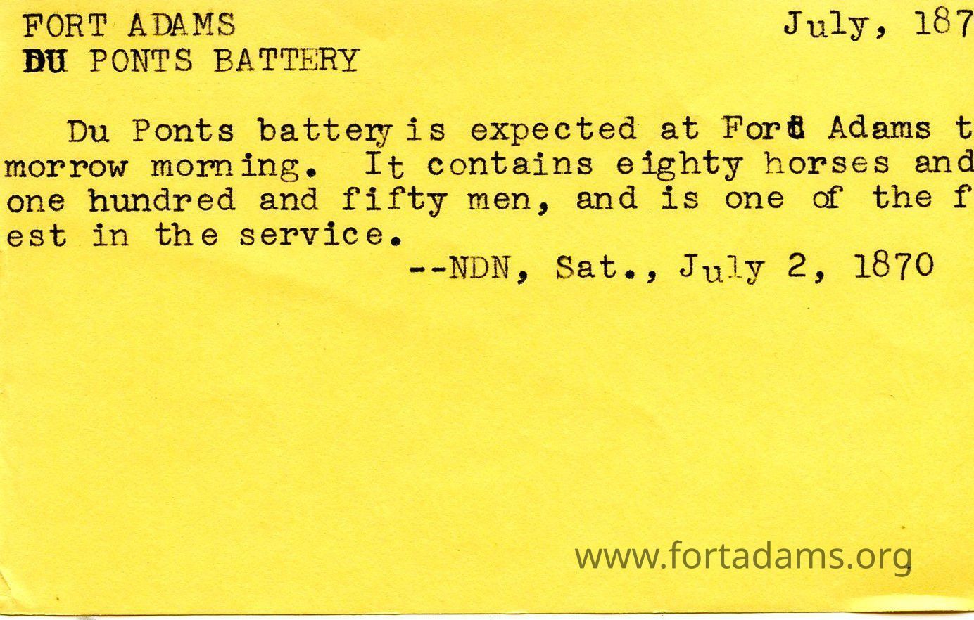 This little note card talks about Fort Adams reinforcements. Which contains 80 horse, 150 men.