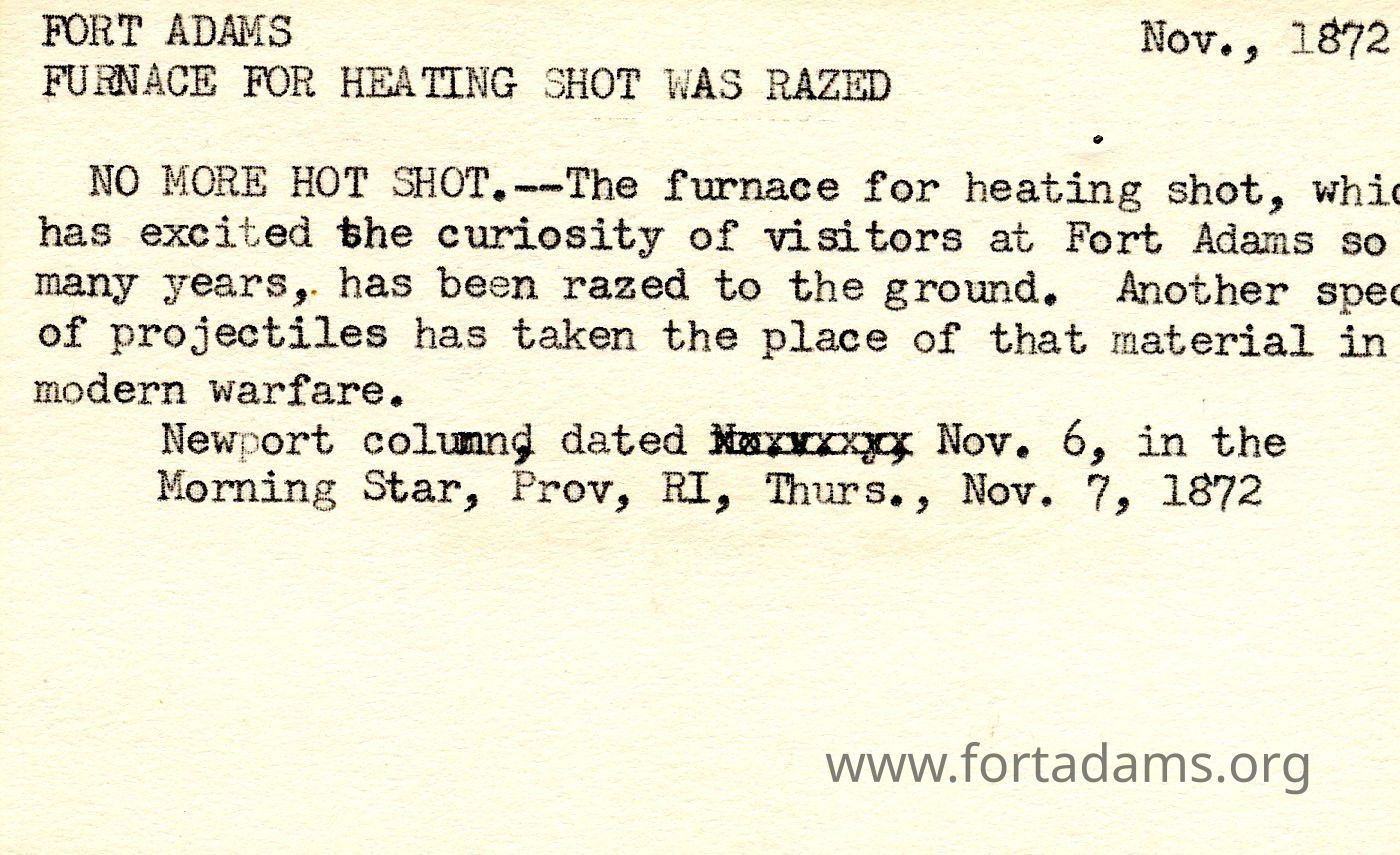 The hot shot furnace which was a big attraction at Fort Adams has been razed to the ground. On the bright side, another special projectile has taken its place of that material in modern warfare.