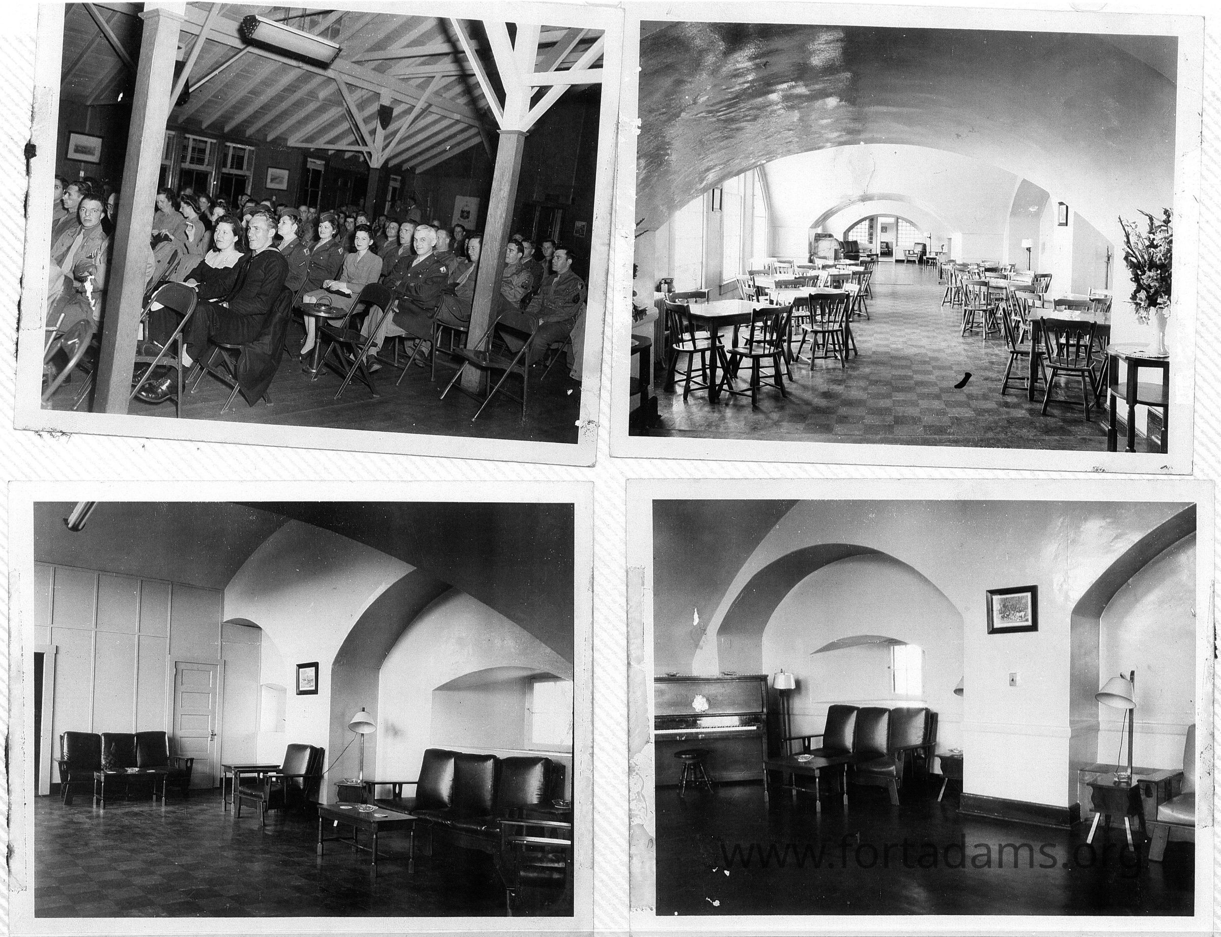 Composite photo - 3 views of the interior of old fort used as recreation areas, 1 of interior unknown wood frame building (maybe service club)