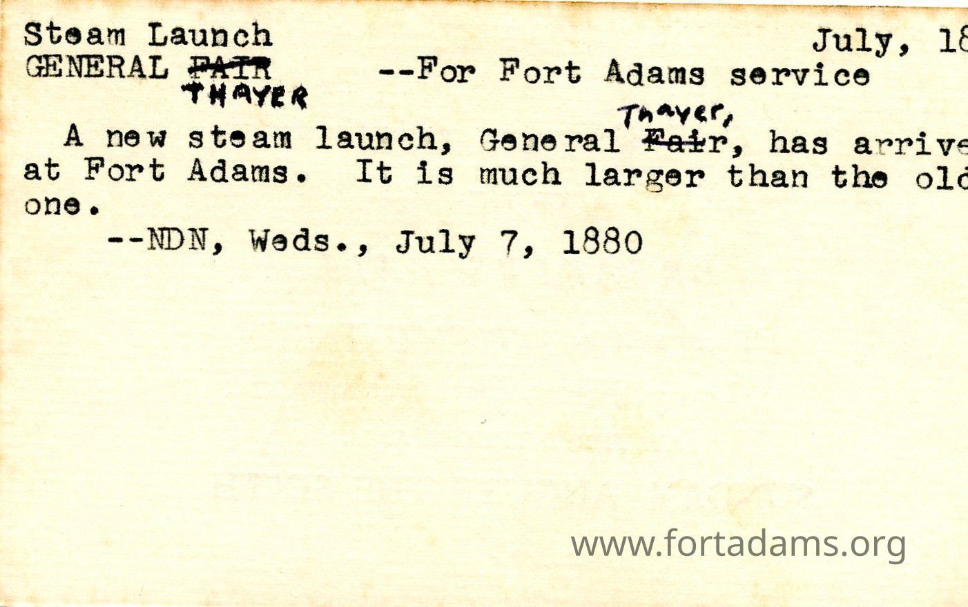 A new Steam Launch, General Thayer has arrived at Fort Adams.