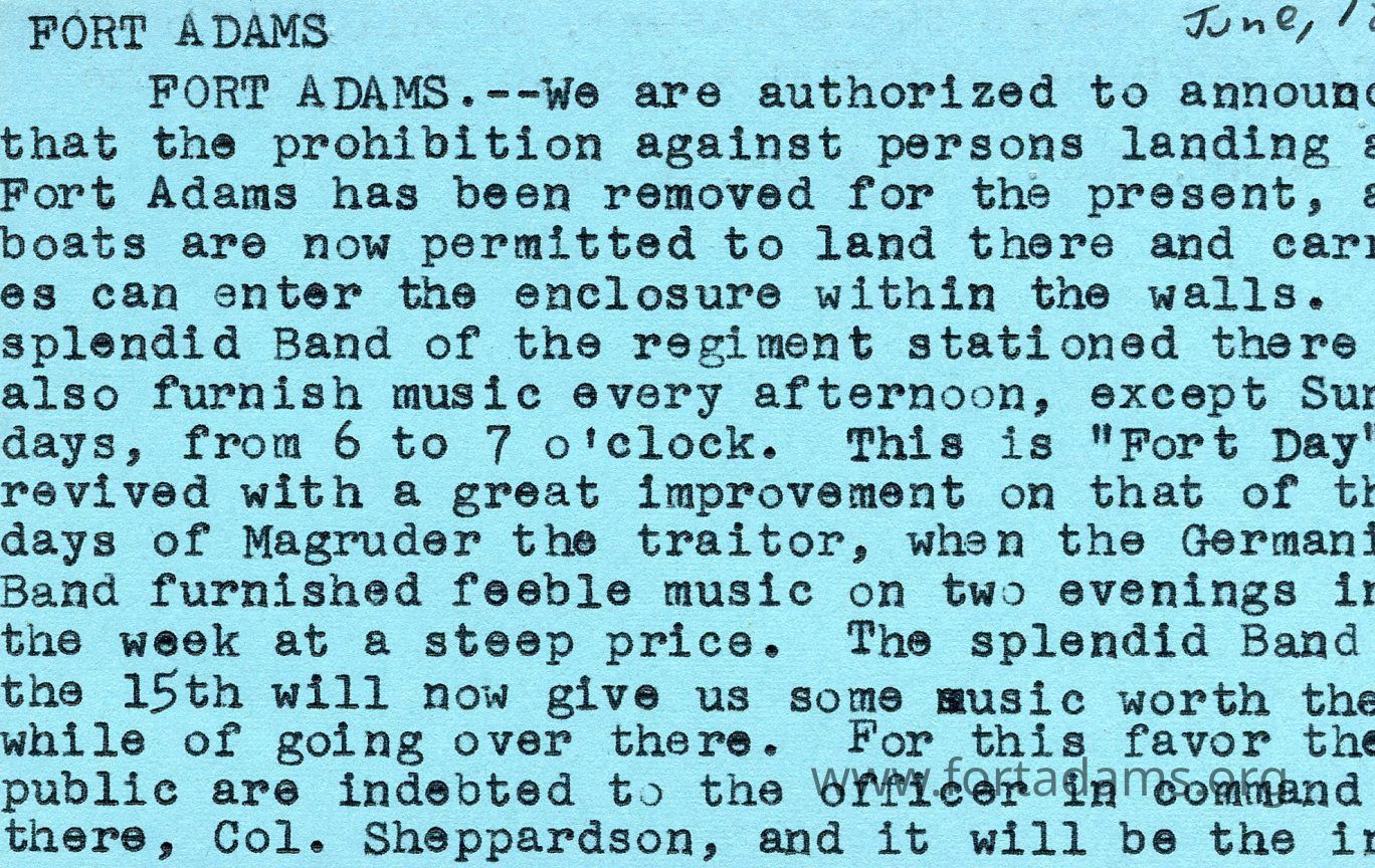 The prohibition against people landing at Fort Adams has been removed. Now ships and settlers are allowed to come inside to see what Fort Adams is like. There will always be Music from Monday-Saturday 6-7 o'clock.