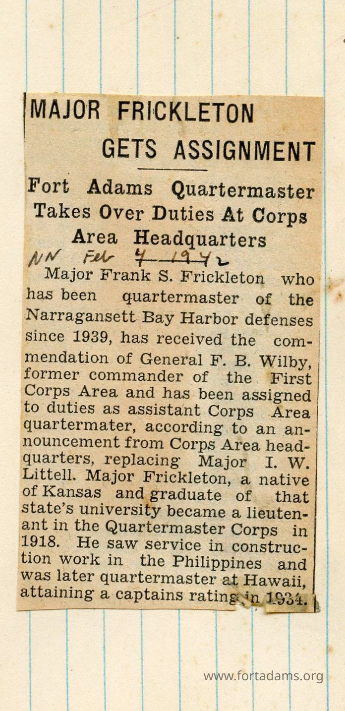 Fort Adams: MAJOR FRICKLETON GETS ASSIGNMENT