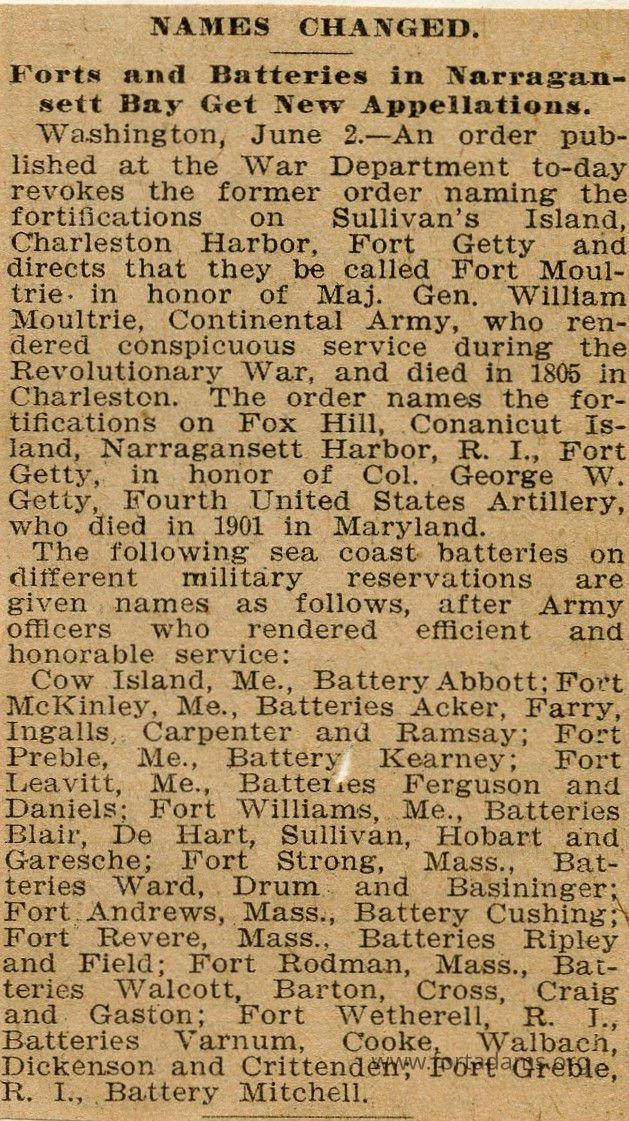 On June 2. Washington order published at the War Department to-day revokes the former order naming the fortifications on Sullivan's Island. Charleston Harbor, Fort Getty directs that they be called fort Moultrie in honor of Mar. Gen William.
