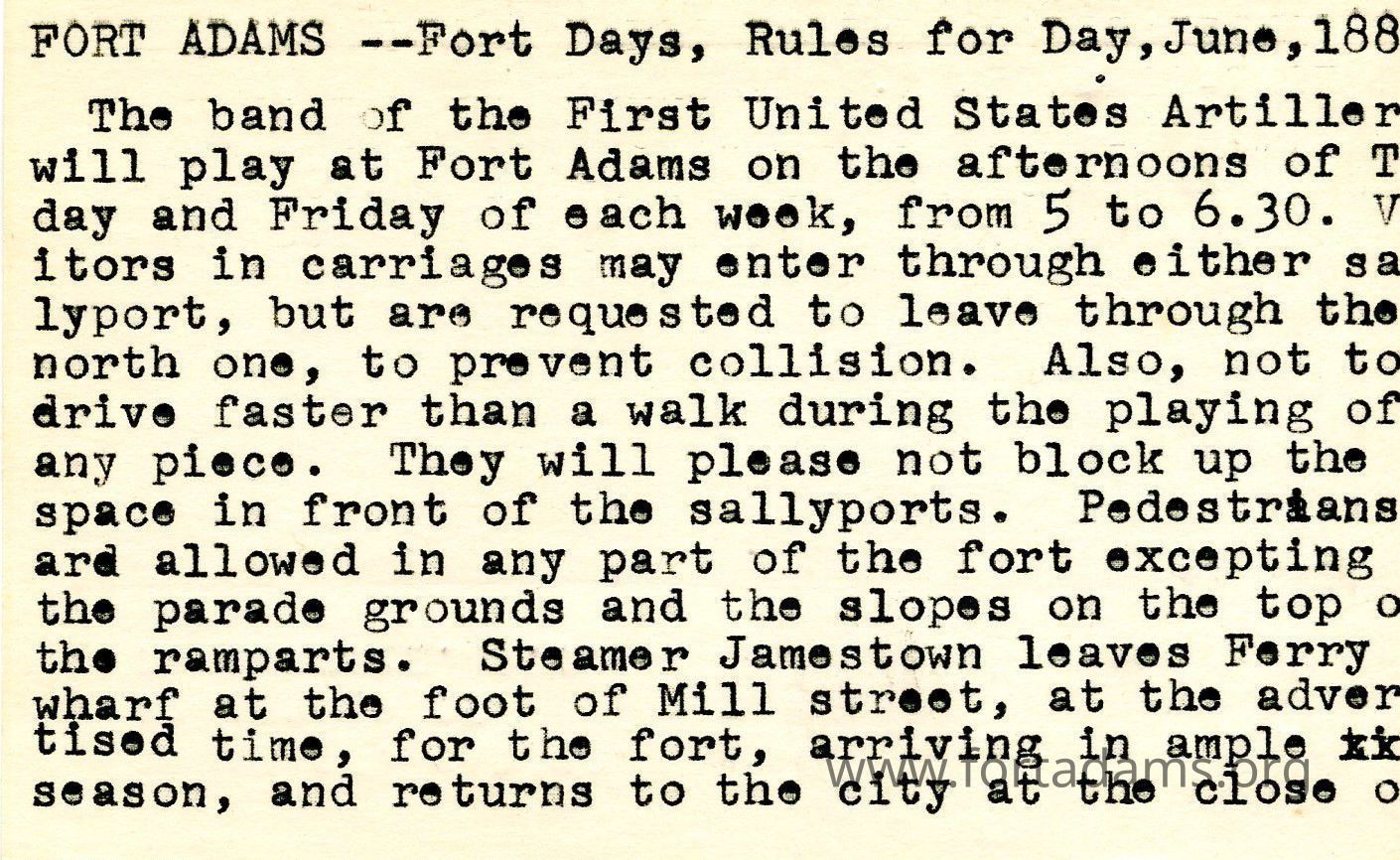 The Artillery will at Fort Adams on the afternoons of Thursday and Friday of each week, from 5 to 6:30.