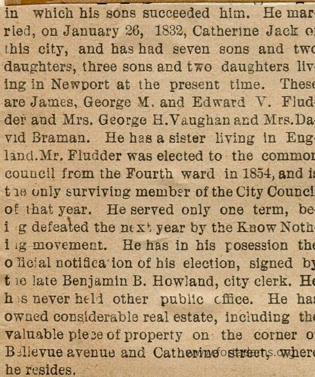 Now Catherine Jack had 7 sons and two daughters. Three of his sons live in Newport with the two girls. Their names being James George M, and Edward V Fluder and for the ladies we have Mrs. George H. Vaughan and Mrs. Daivd Brama.
