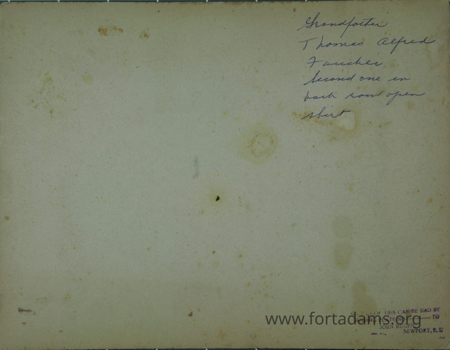 "Grandfather Thomas Alfred Faucher second one in back row open shirt" Studio stamp John Ruger, Newport, RI