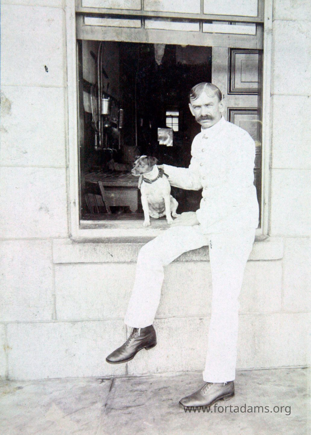 Male leaning on window sill holding dog
